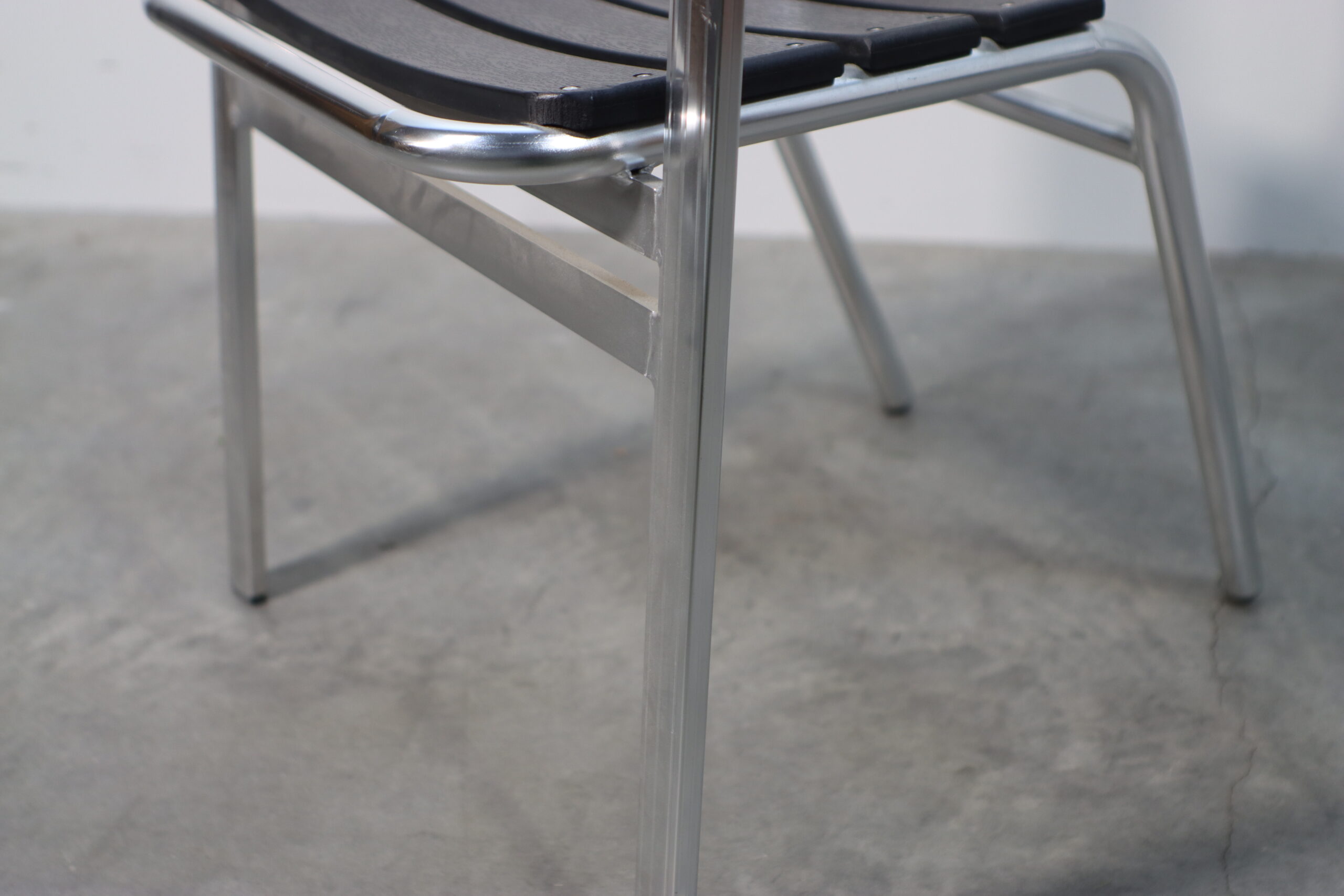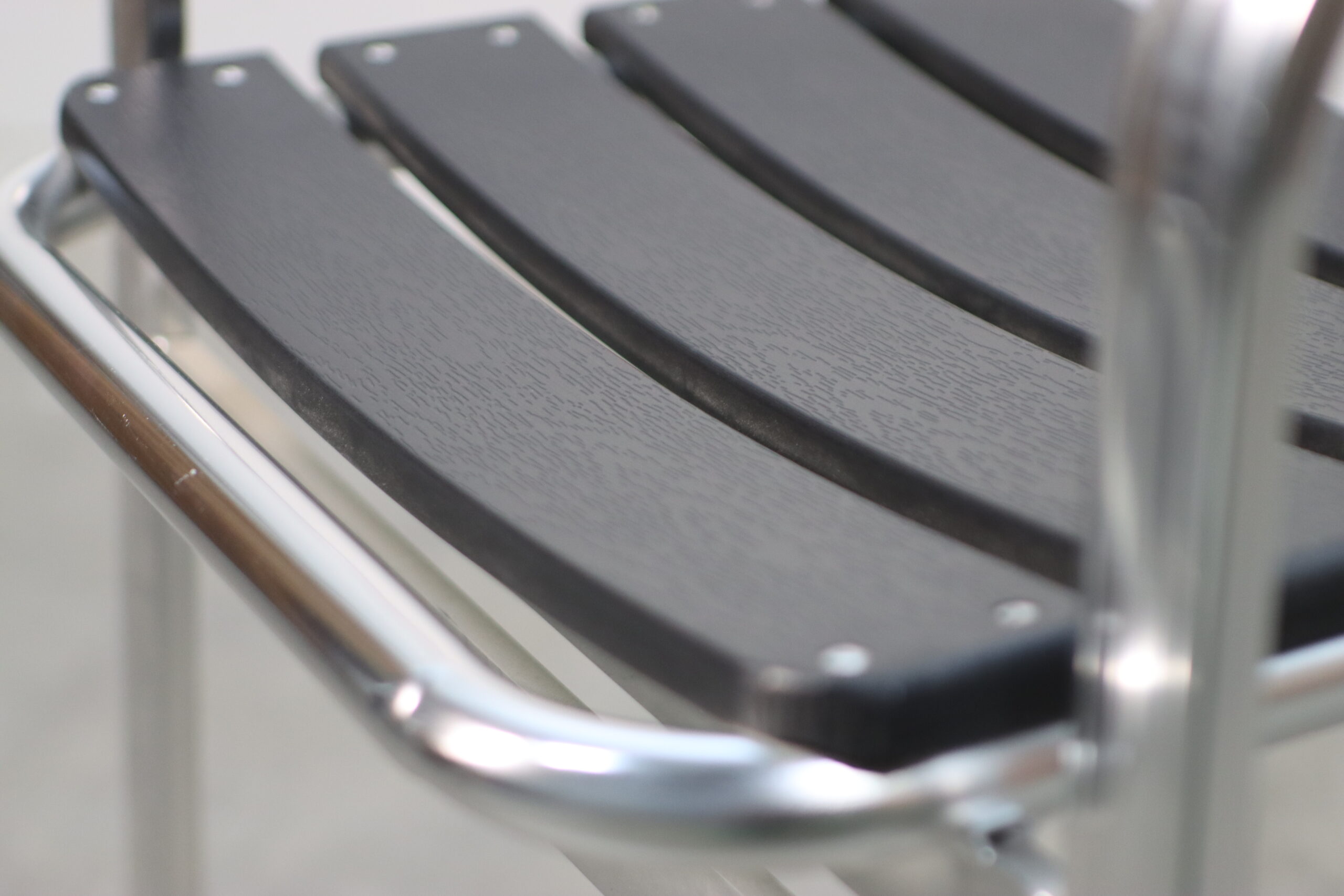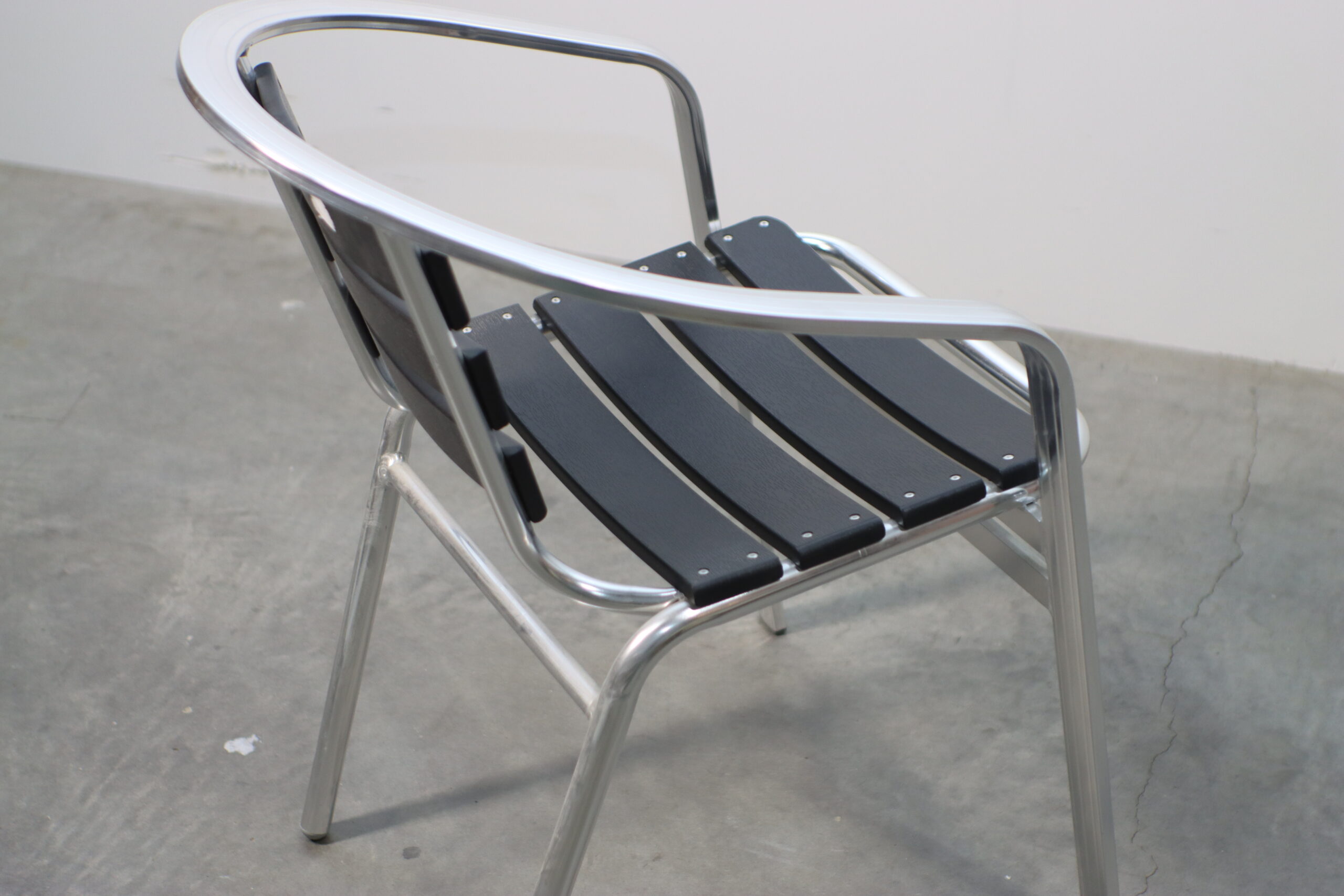 光沢のあるアルミフレームと、シックなブラックのスラット(背板・座板)が織りなすコントラストが、空間に都会的で引き締まった印象を与えます。