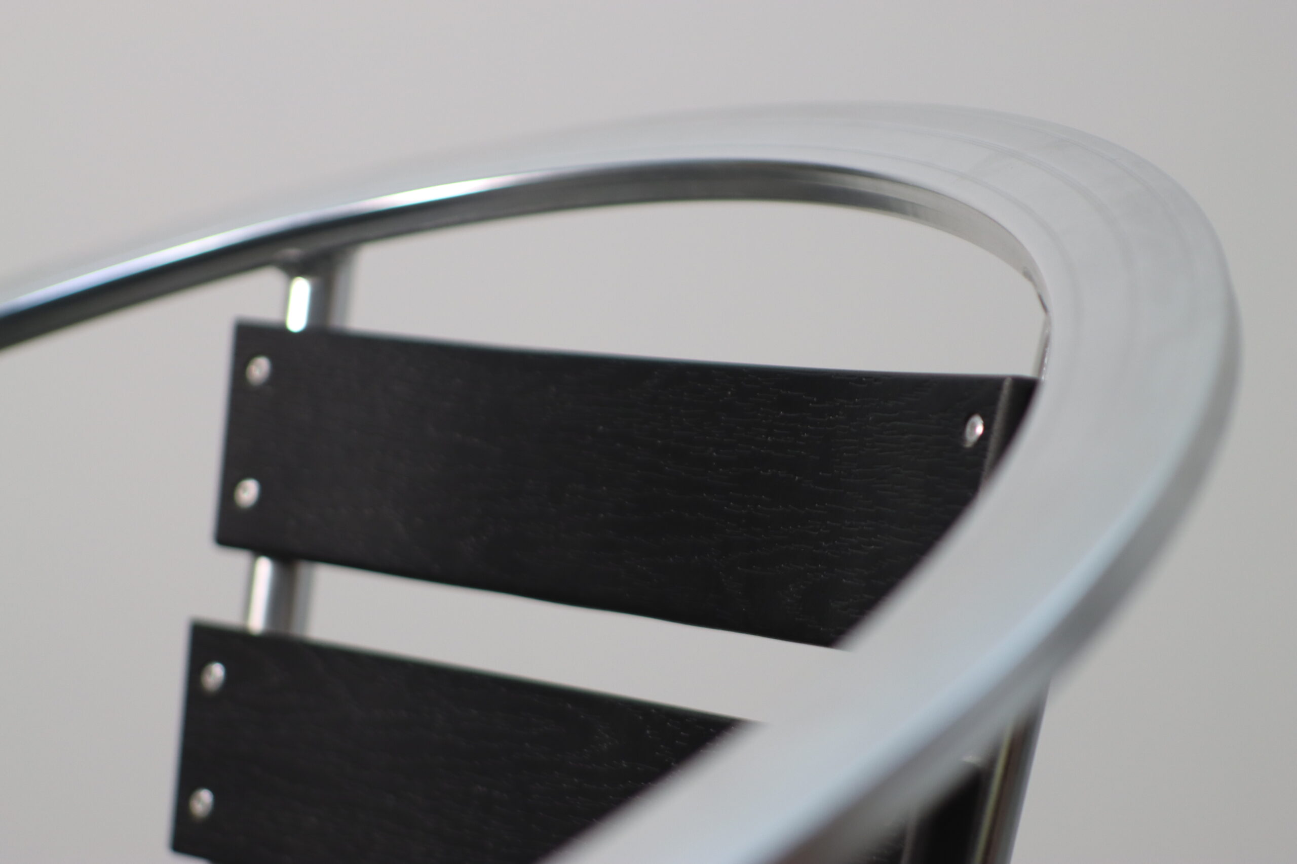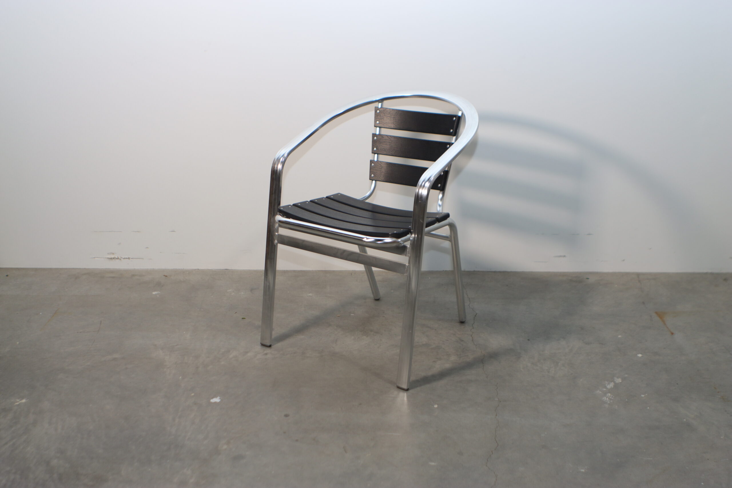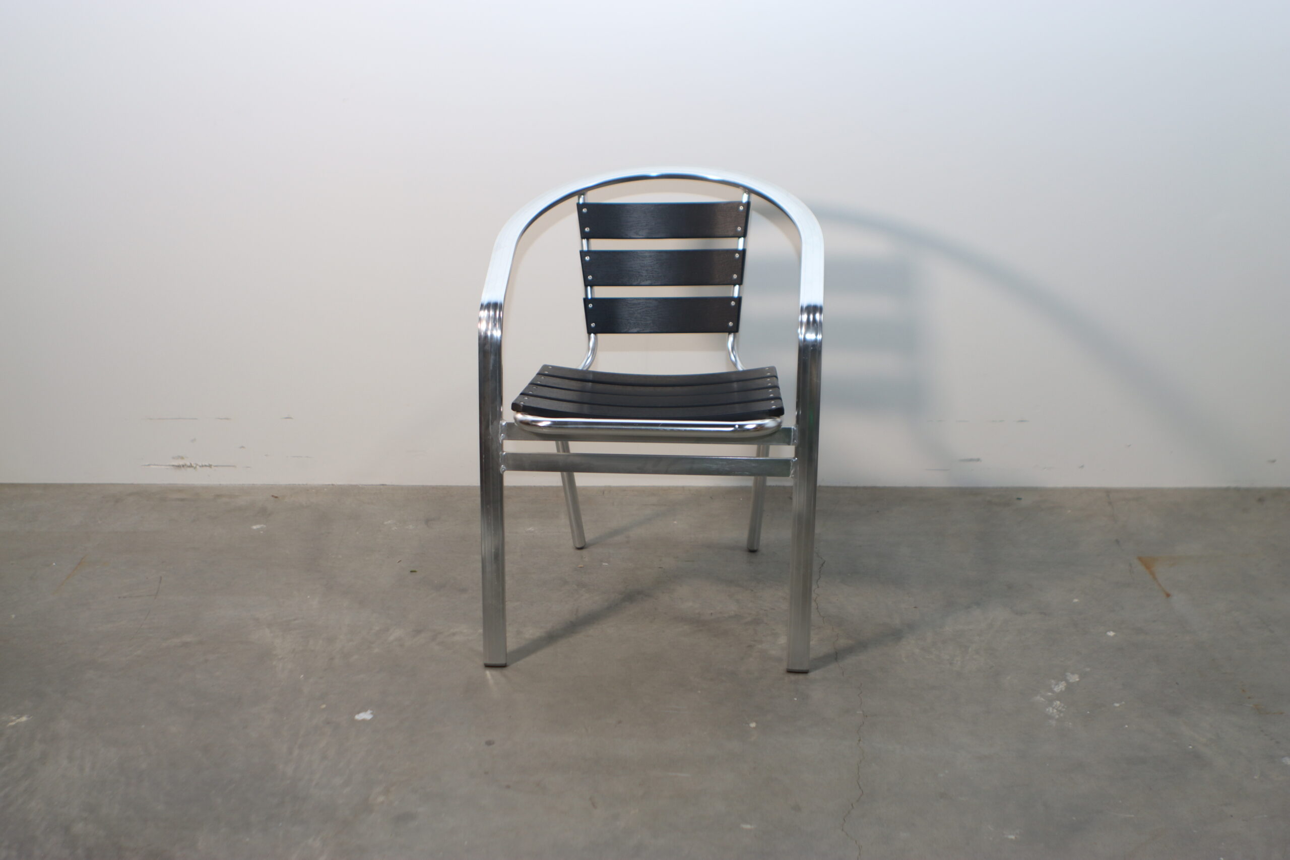 光沢のあるアルミフレームと、シックなブラックのスラット(背板・座板)が織りなすコントラストが、空間に都会的で引き締まった印象を与えます。