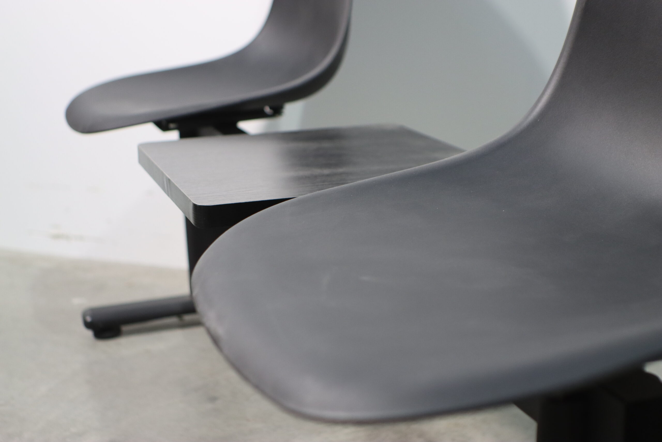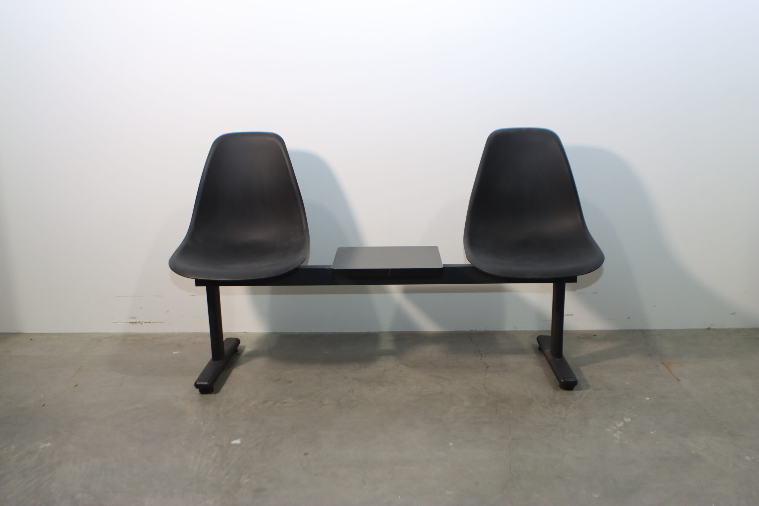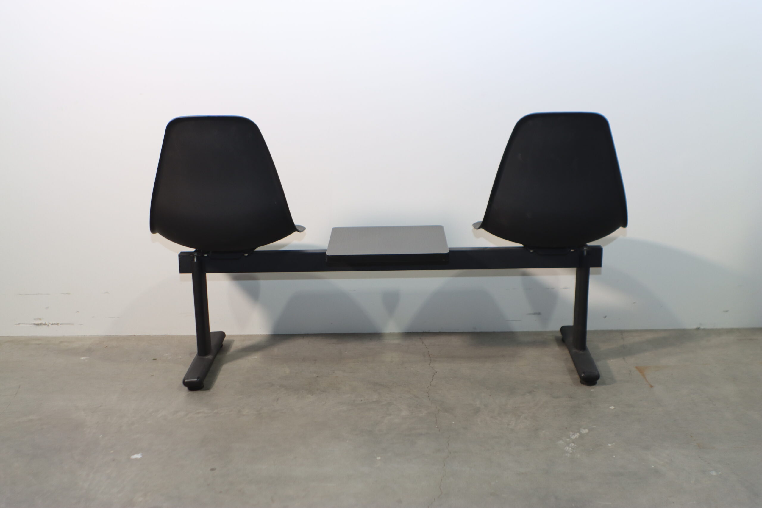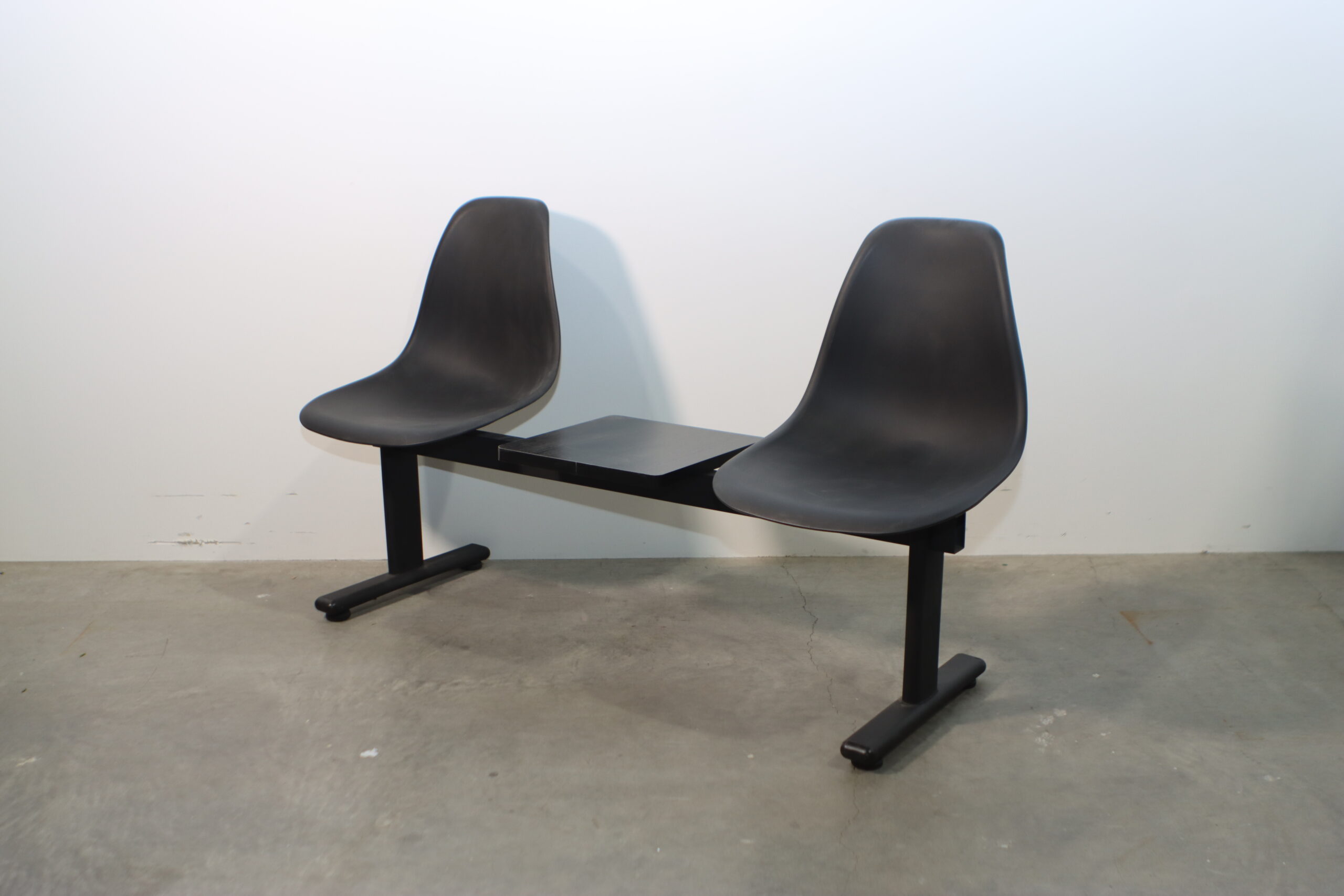 モダン・ブラック・ベンチチェアは、2つのミニマルなバケットシートの間に実用的なセンターテーブルを配置した機能美溢れる設計で、空間に「効率的かつ洗練された公共性」を付与します。