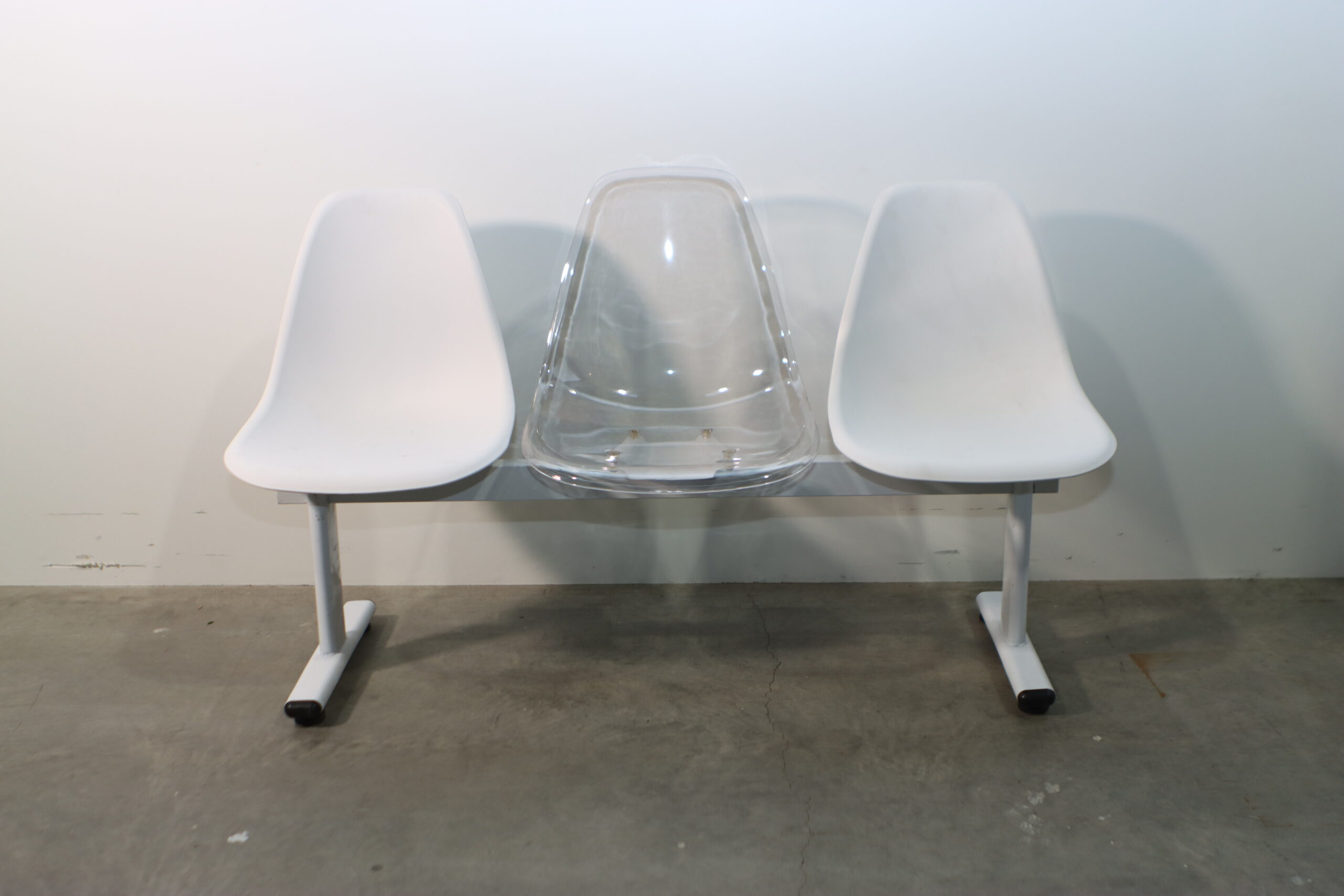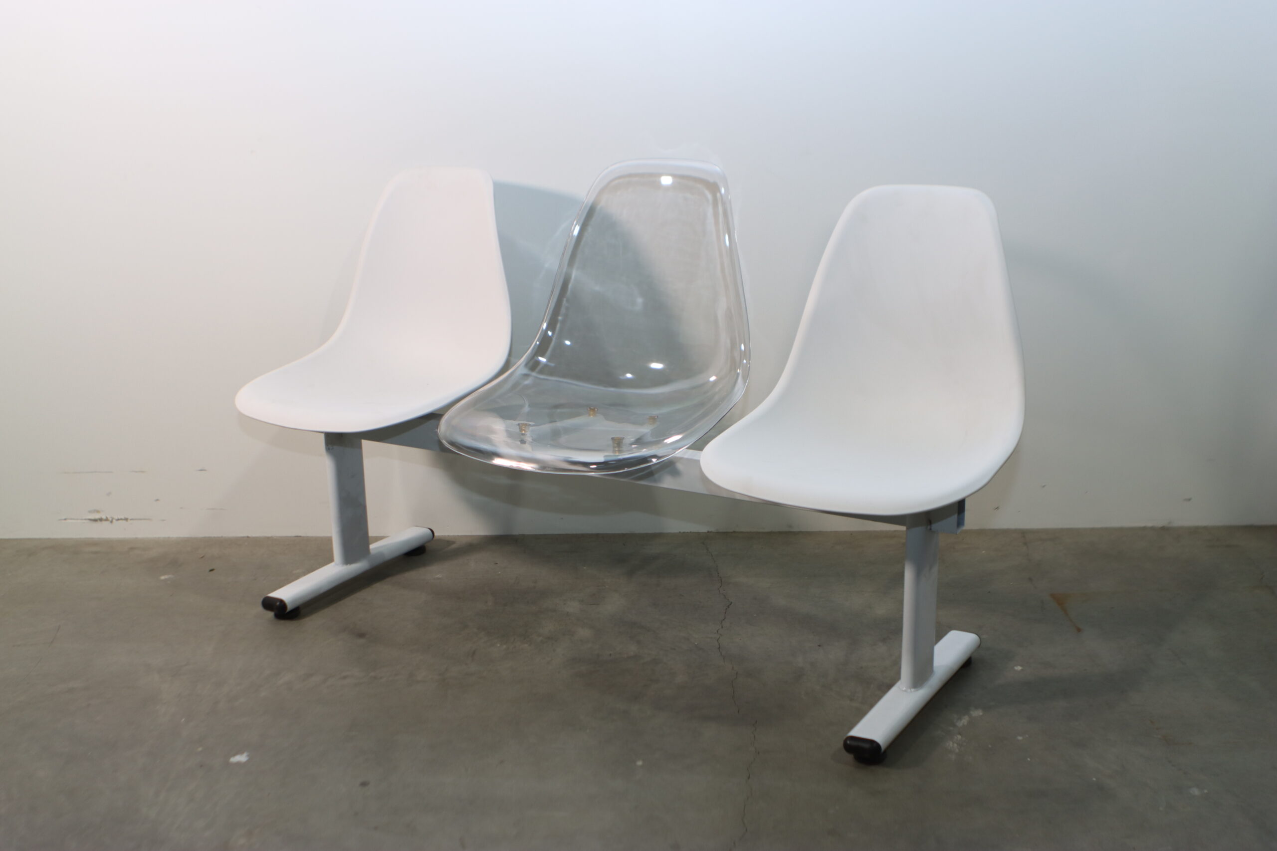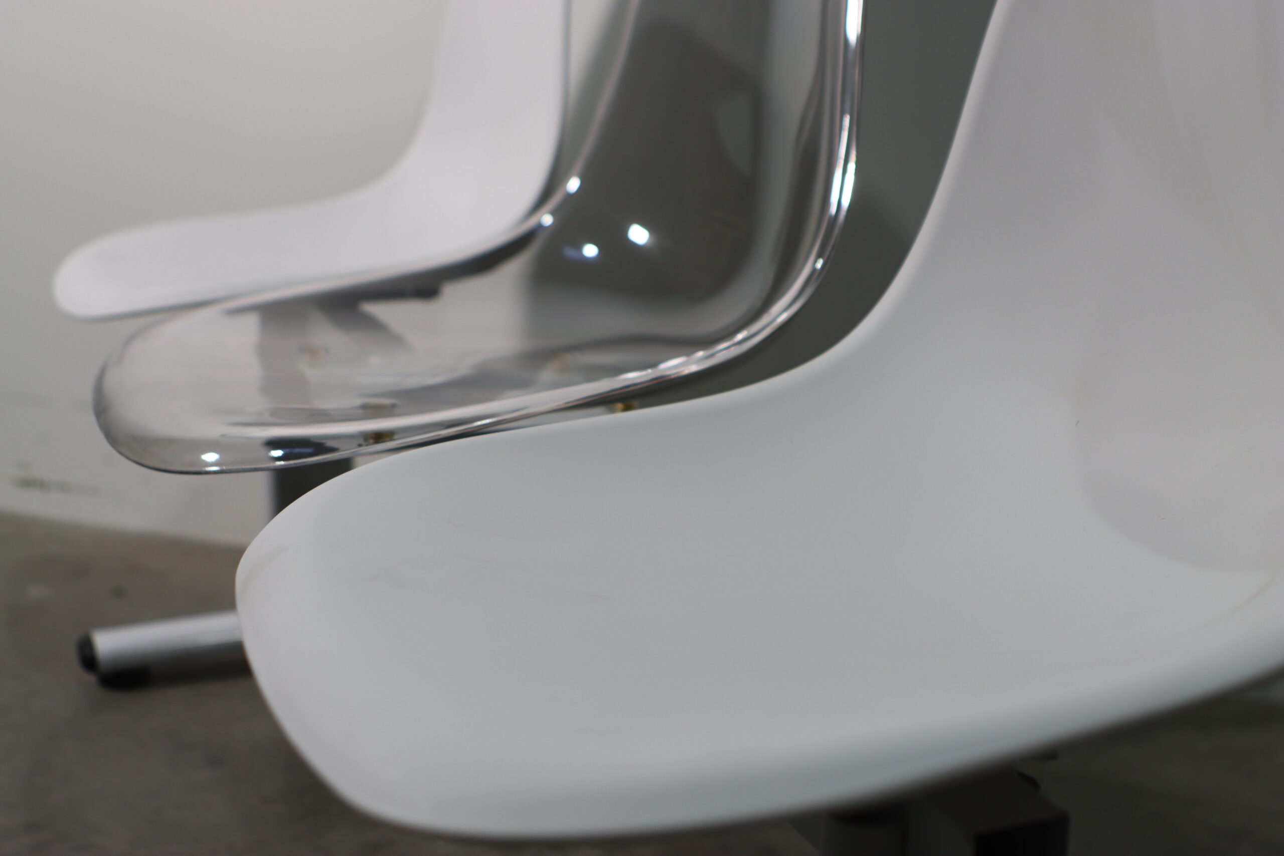 “モダン・プラスチック・ベンチチェアは、無駄を削ぎ落としたミニマルなシェル構造と清潔感のあるホワイトの質感が、空間に「スポーティーな躍動感」と「機能的な美学」を付与します。