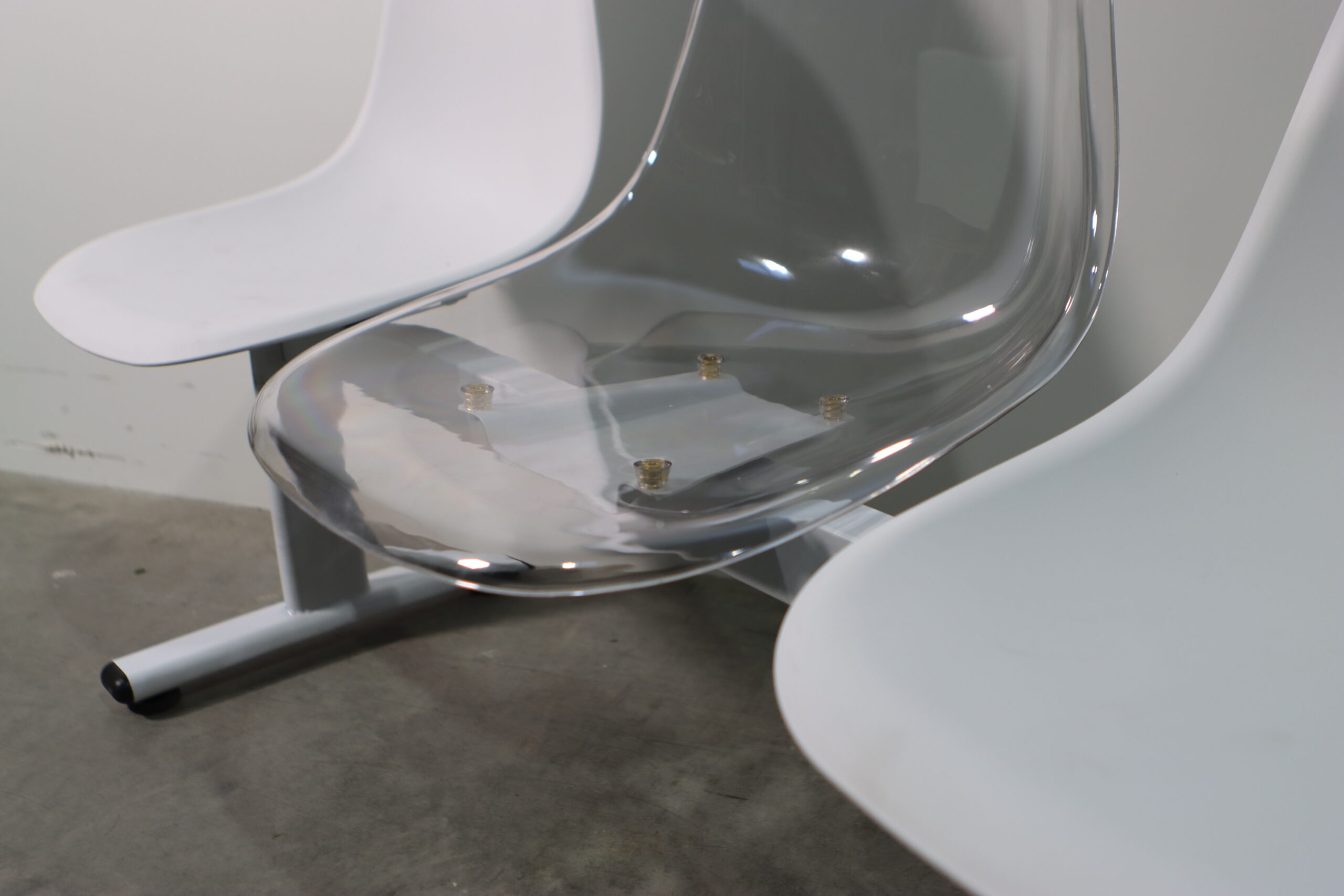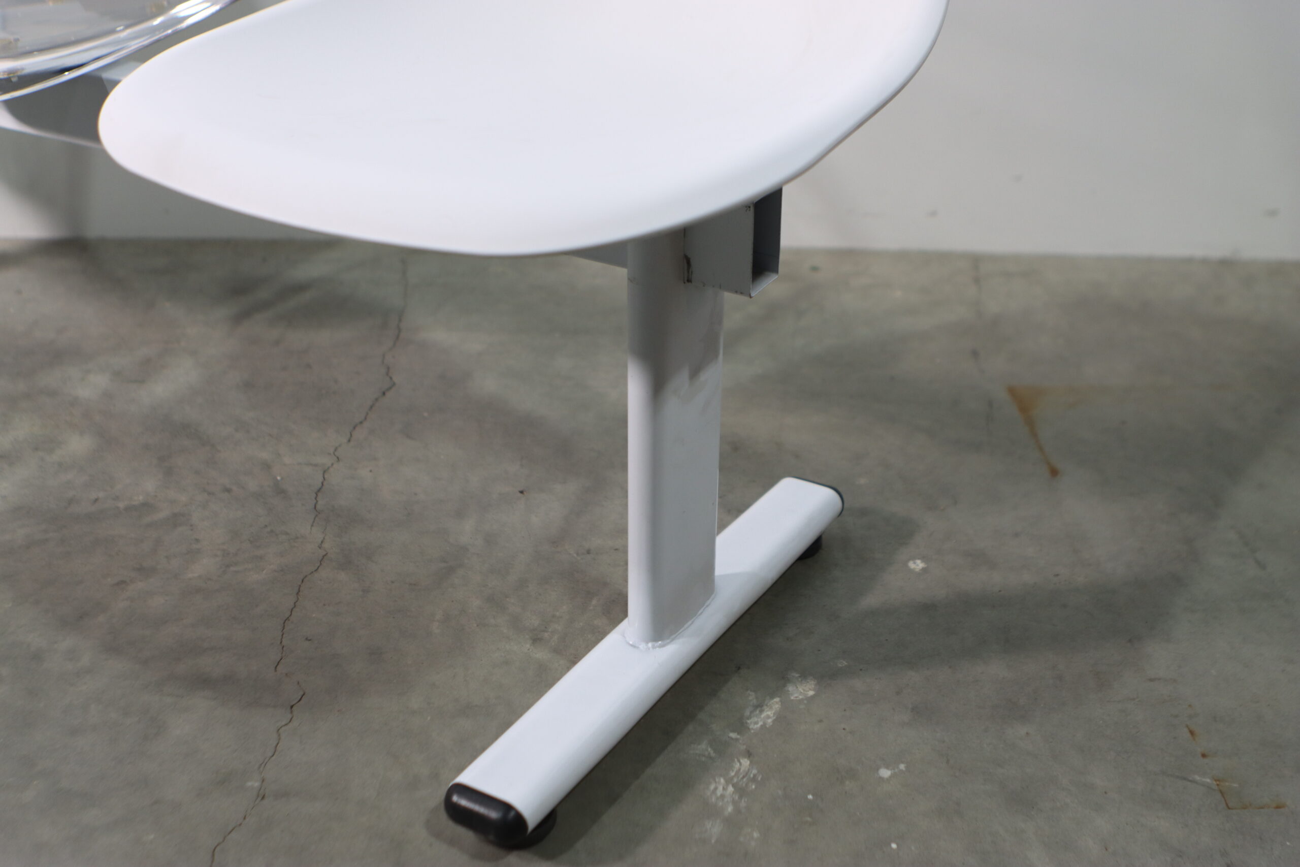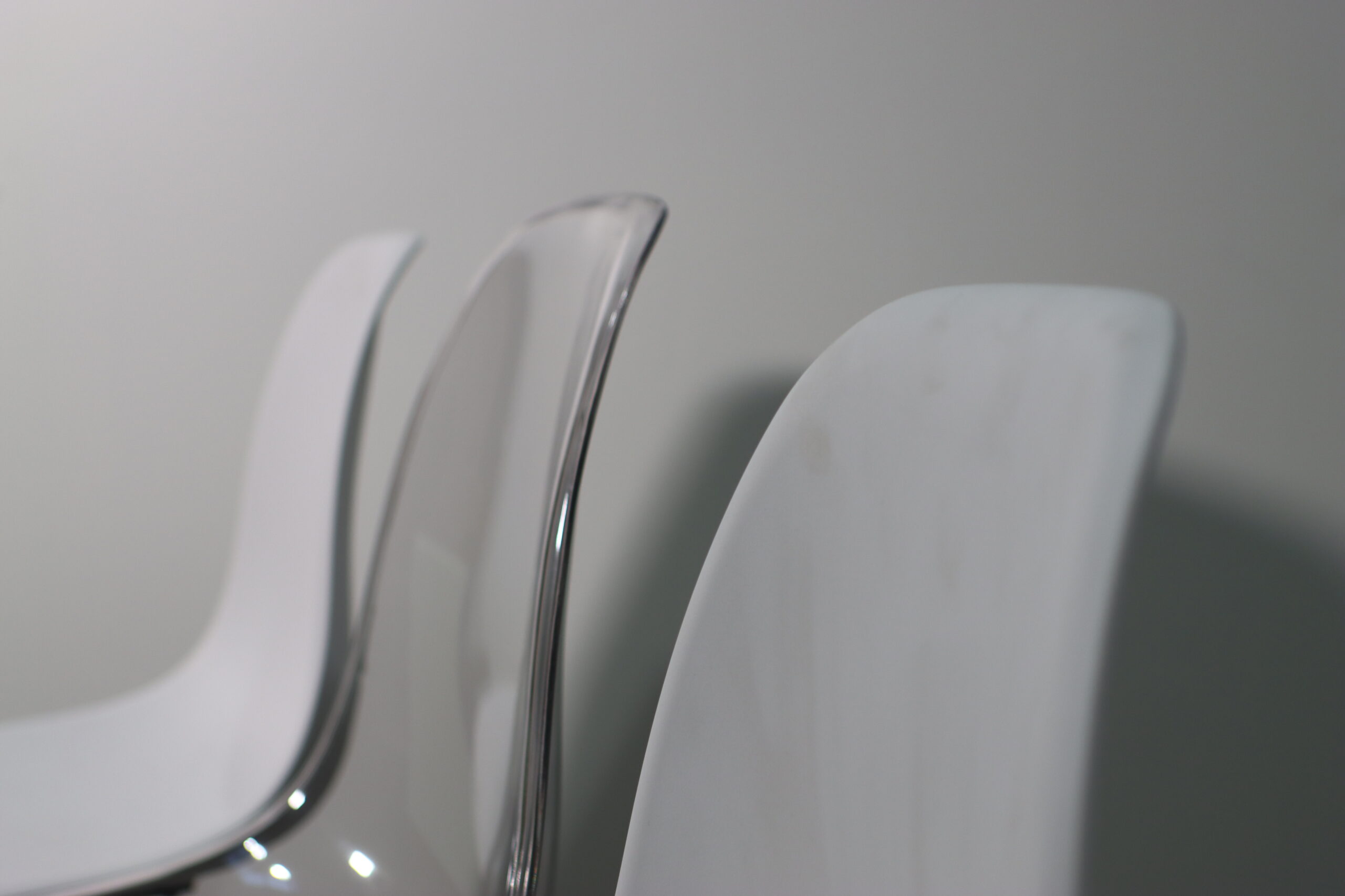 “モダン・プラスチック・ベンチチェアは、無駄を削ぎ落としたミニマルなシェル構造と清潔感のあるホワイトの質感が、空間に「スポーティーな躍動感」と「機能的な美学」を付与します。