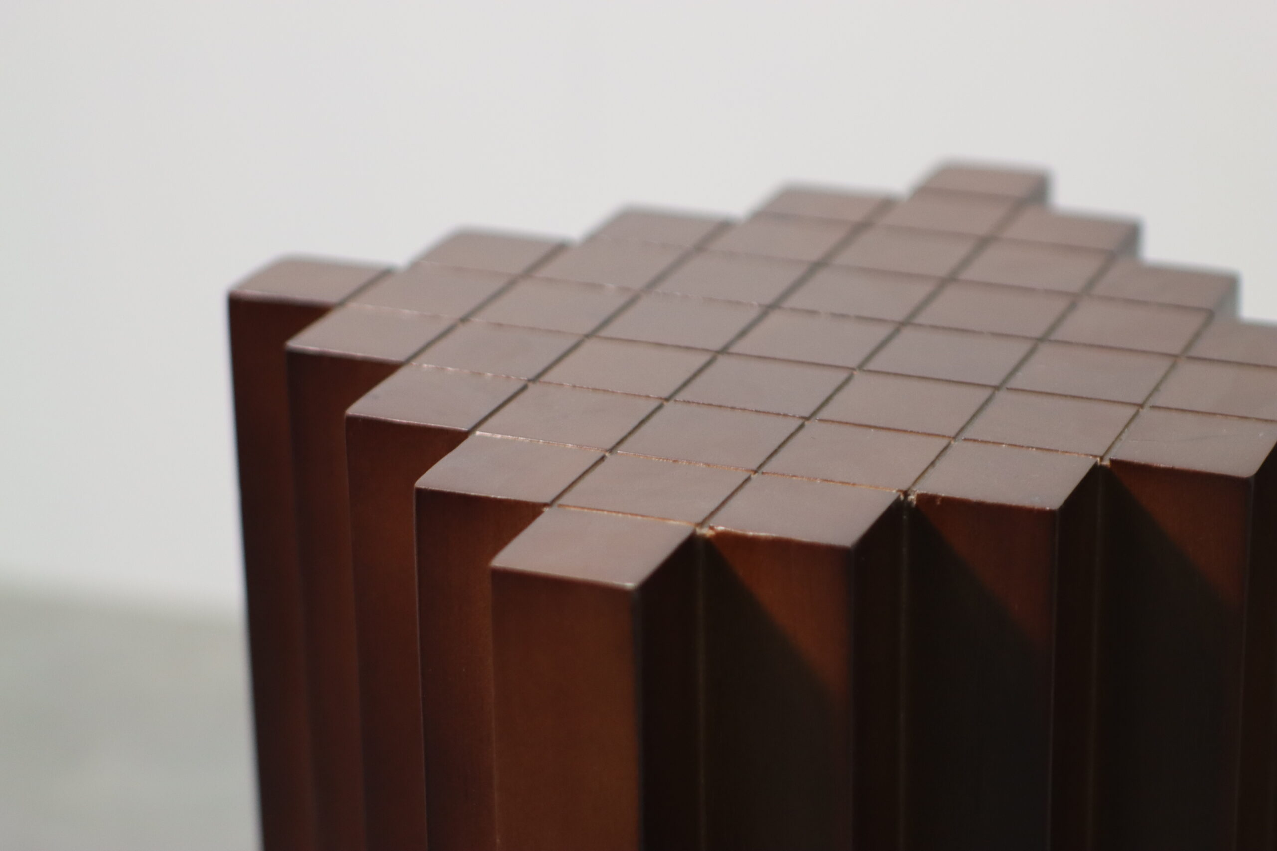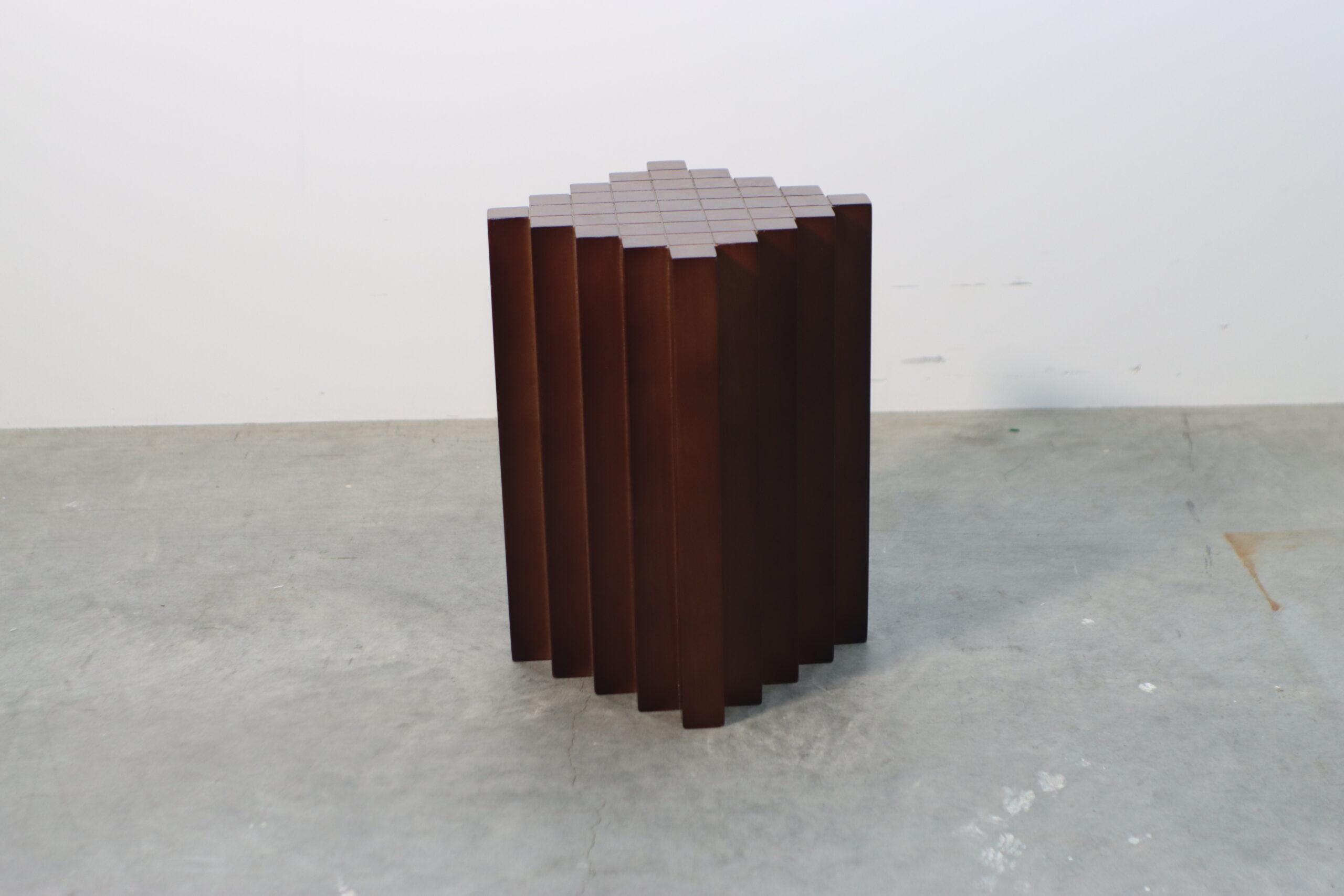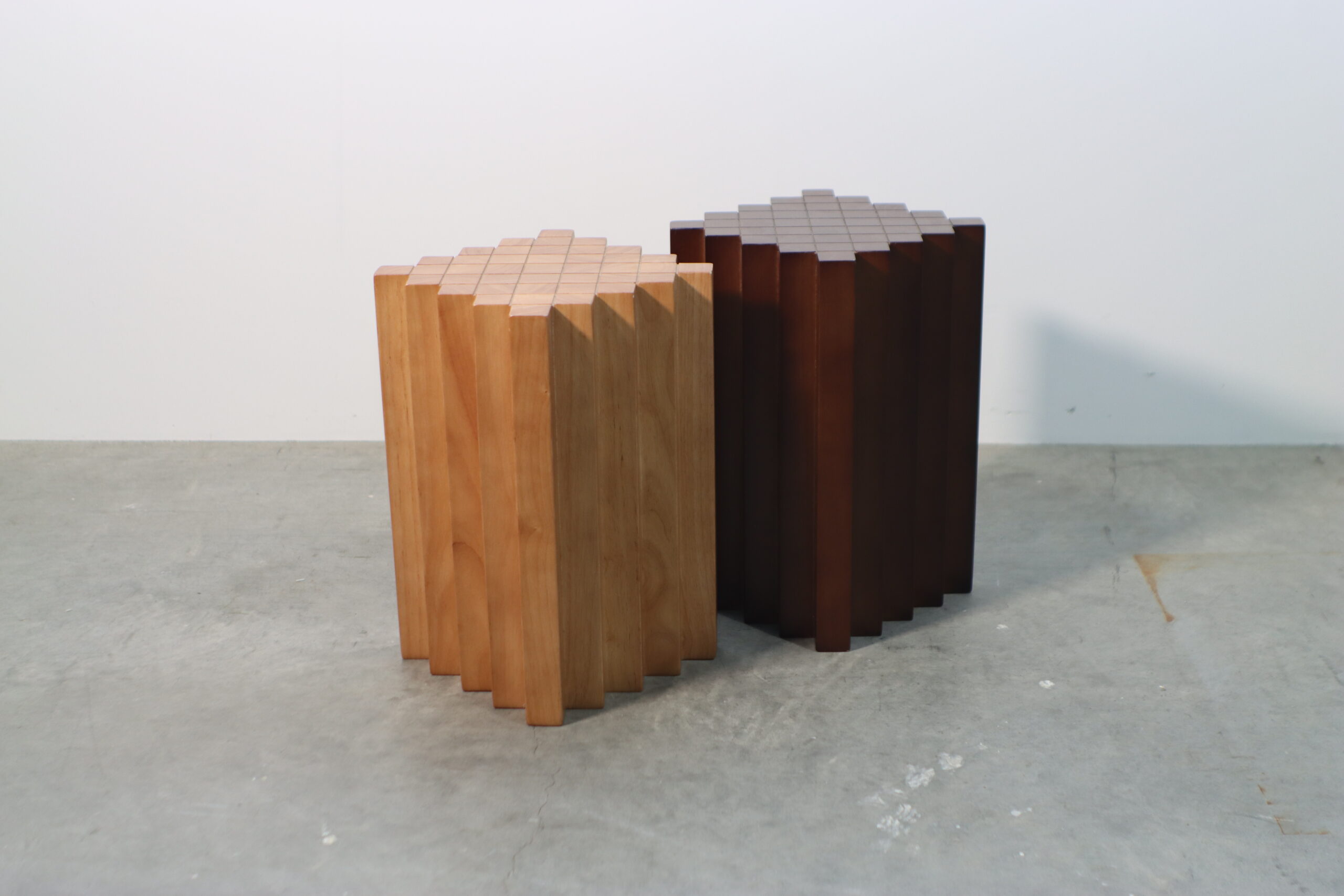 幾何学フォルム・ウッドスツールは、垂直方向に連続するシャープなV字型の溝が、光と影のドラマチックなコントラストを生み出し、空間に「構造的な秩序」と「彫刻的な深み」を付与します。