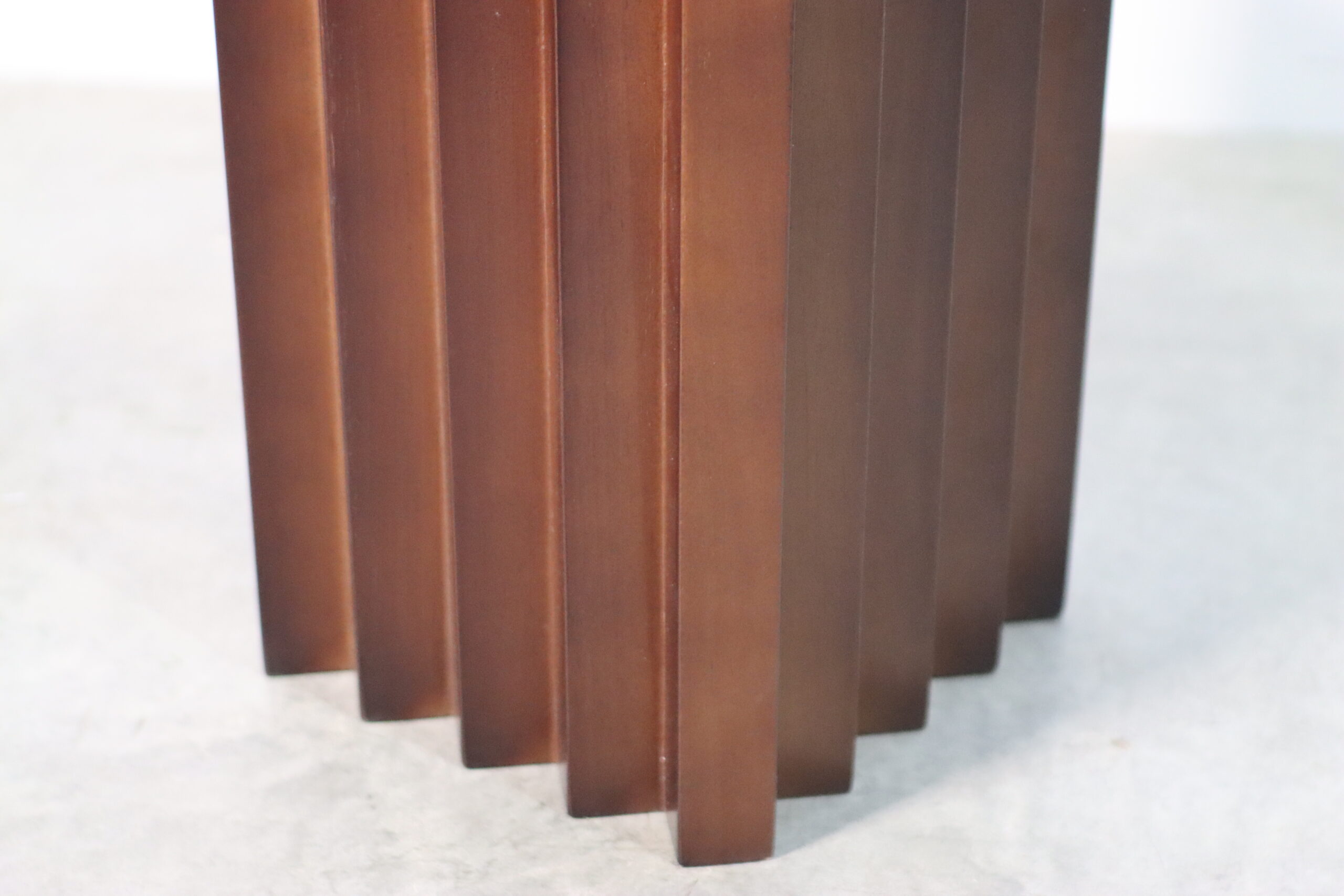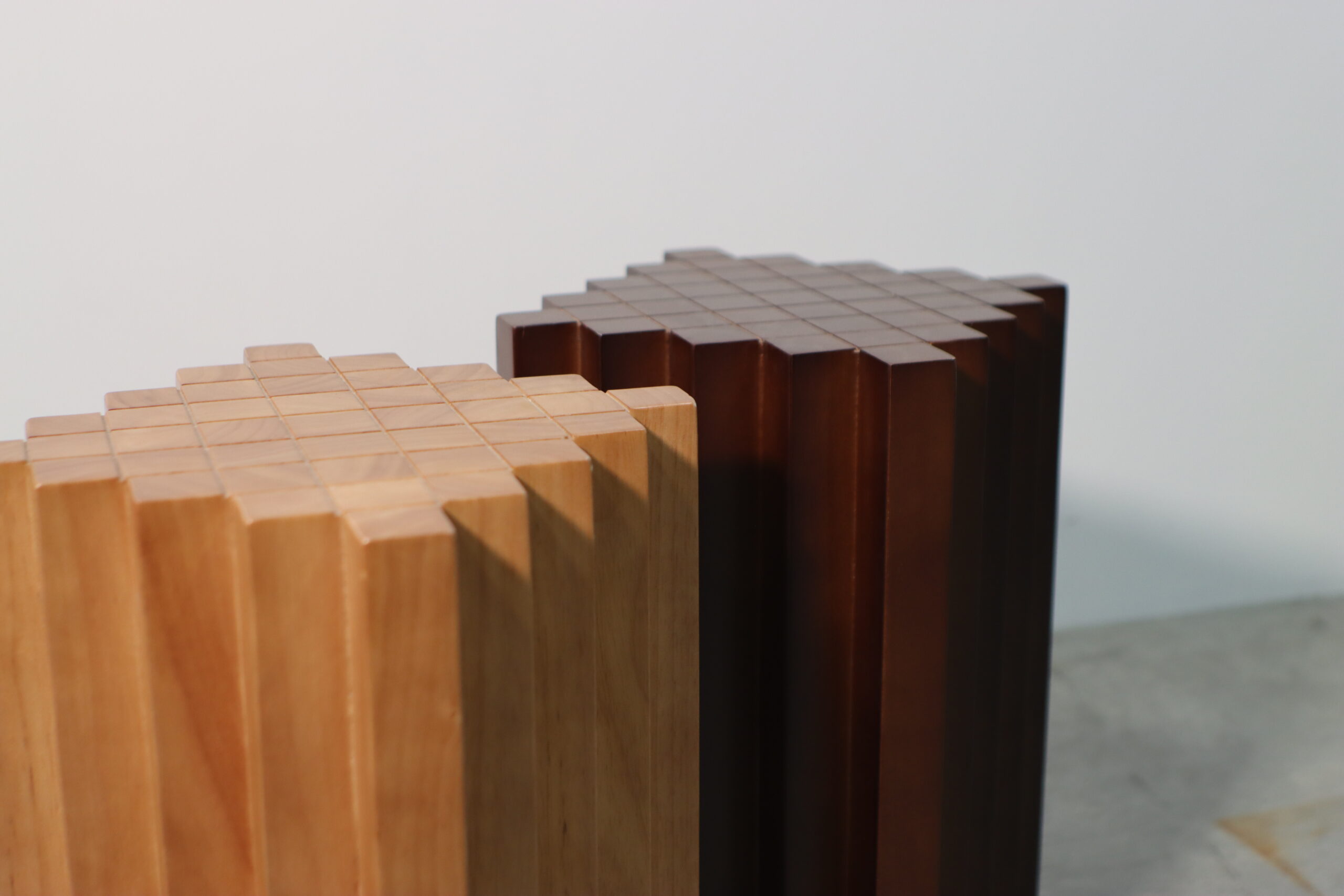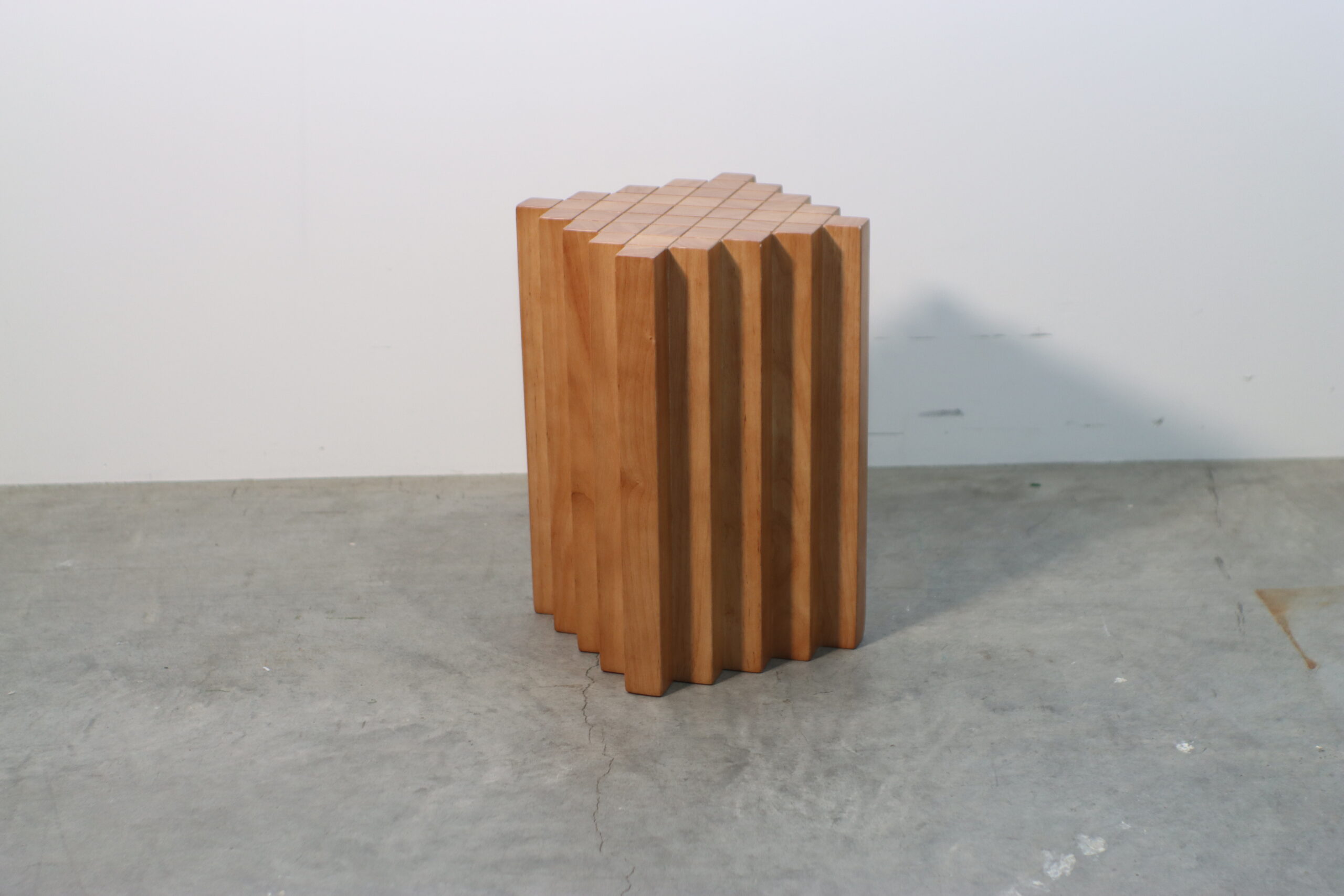 幾何学フォルム・ウッドスツールは、垂直方向に連続するシャープなV字型の溝が、光と影のドラマチックなコントラストを生み出し、空間に「構造的な秩序」と「彫刻的な深み」を付与します。