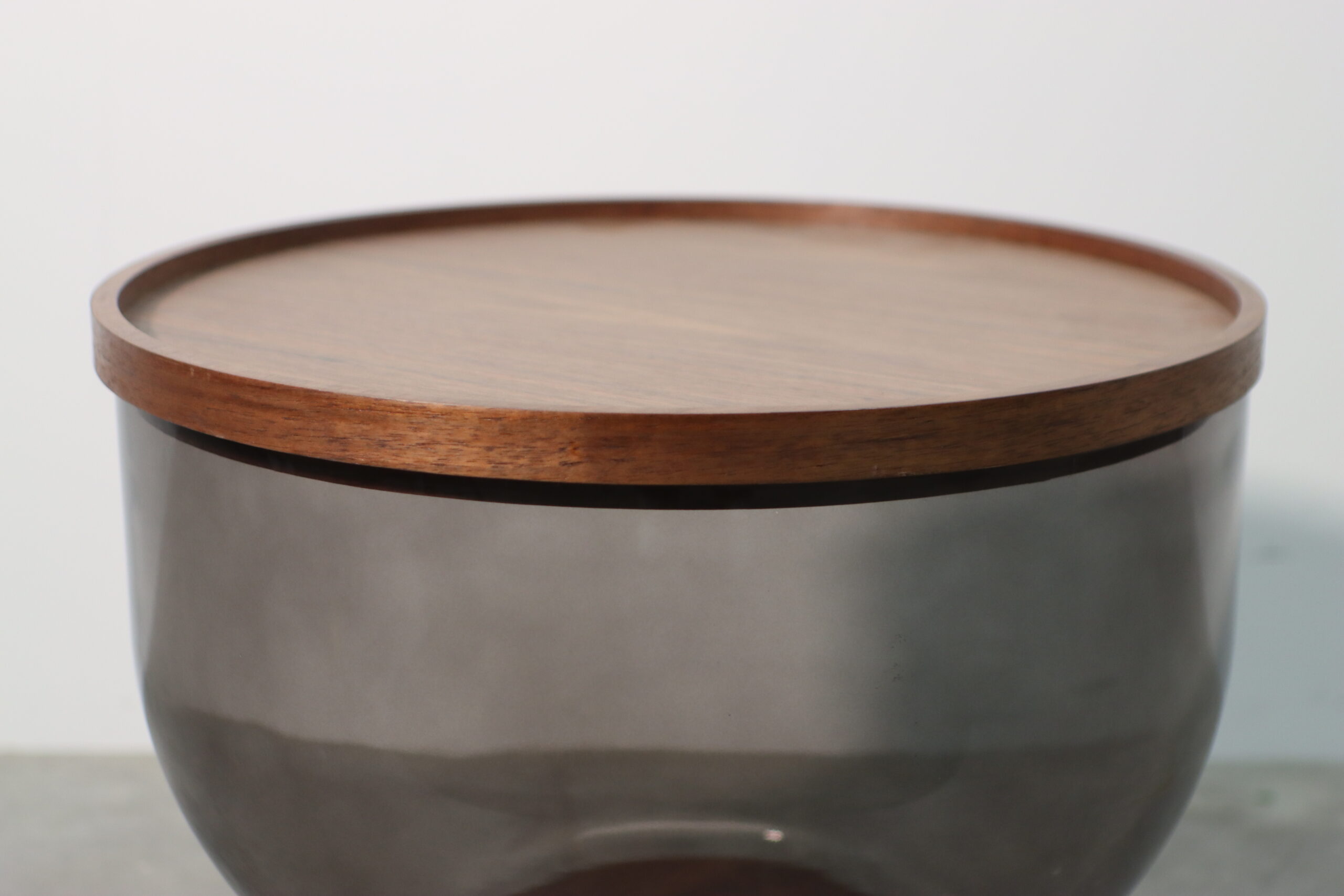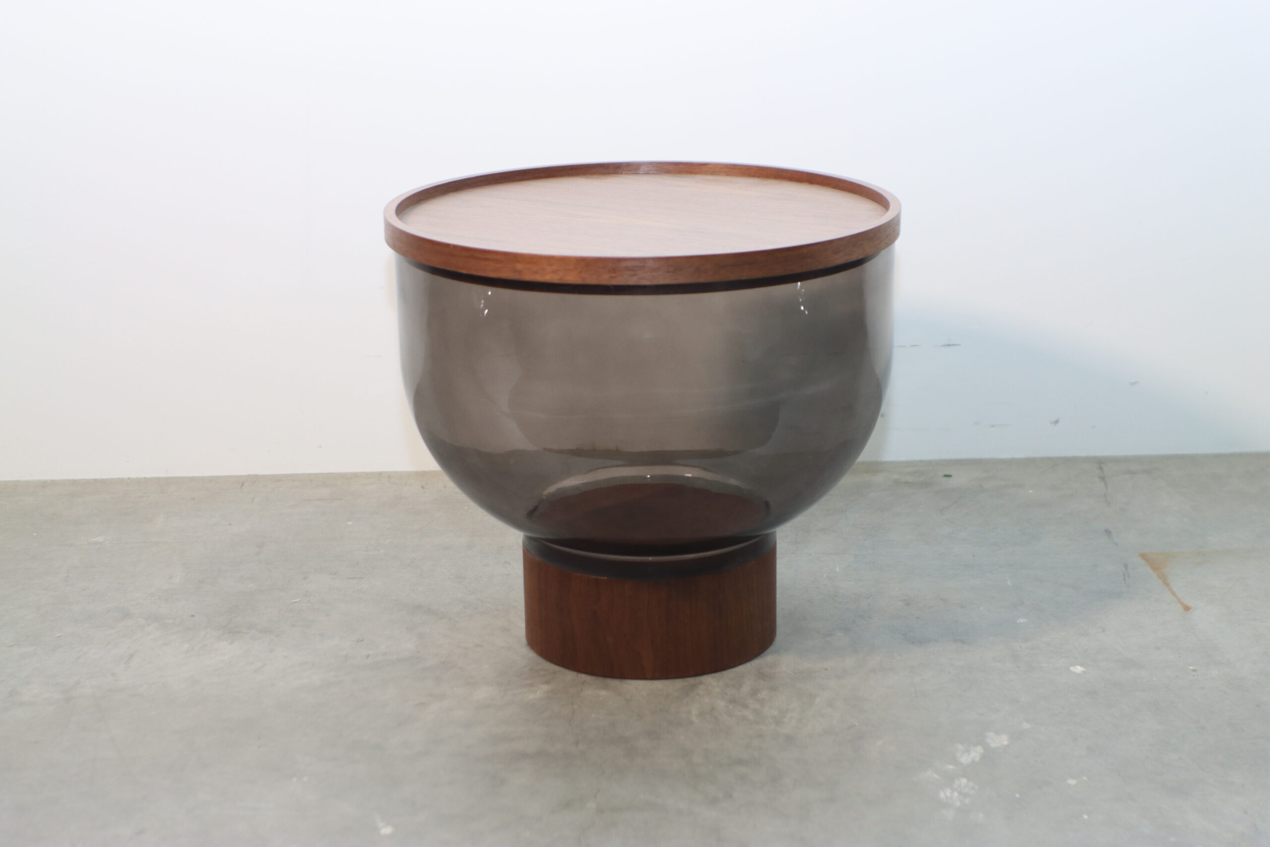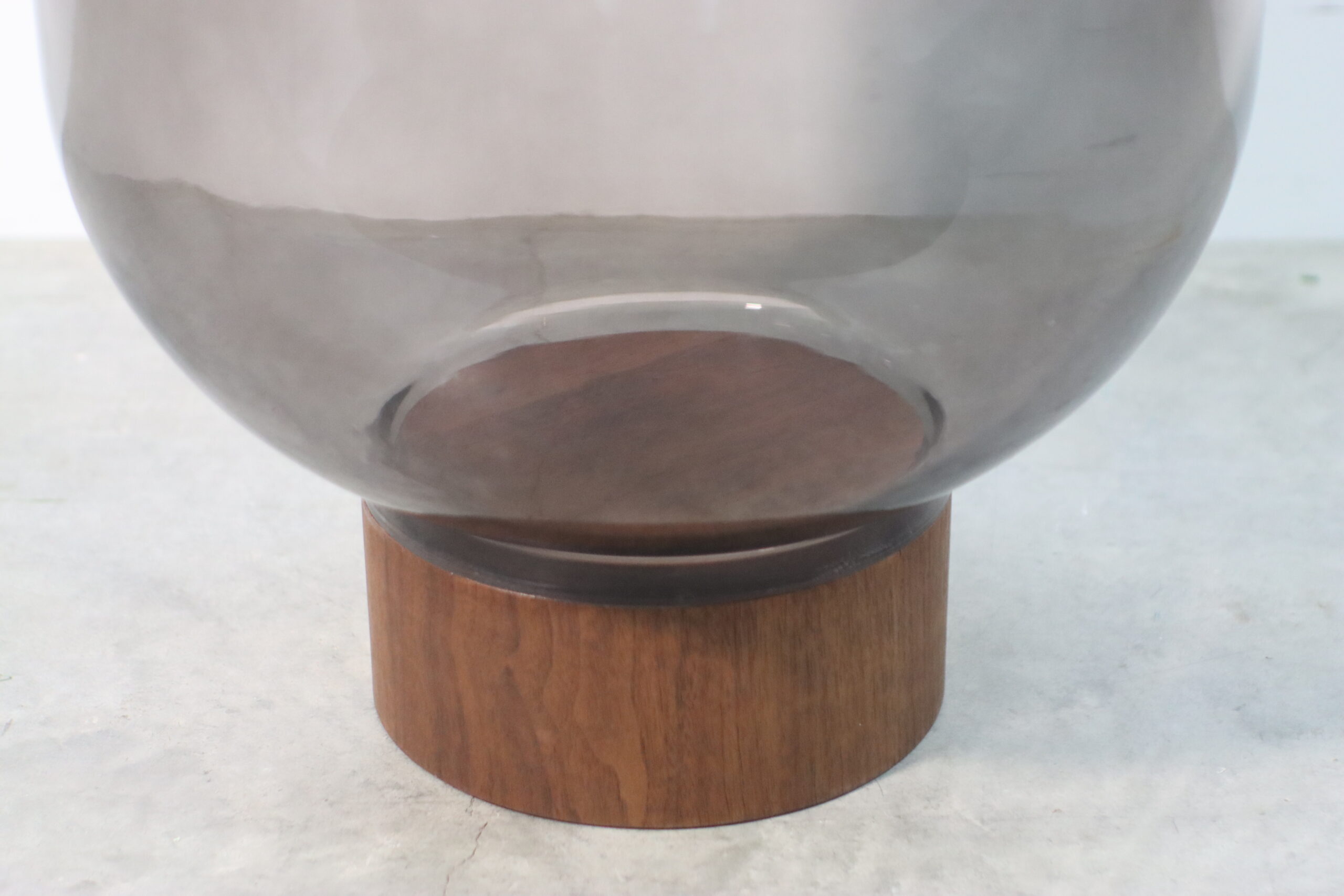 モダン・スモークガラス・ローテーブルは、深い色調のスモークガラスが描くボウル状の曲線と、温かみのあるウッドベースを融合させた独創的なデザインにより、空間に「圧倒的な静謐さとラグジュアリー」を付与します。