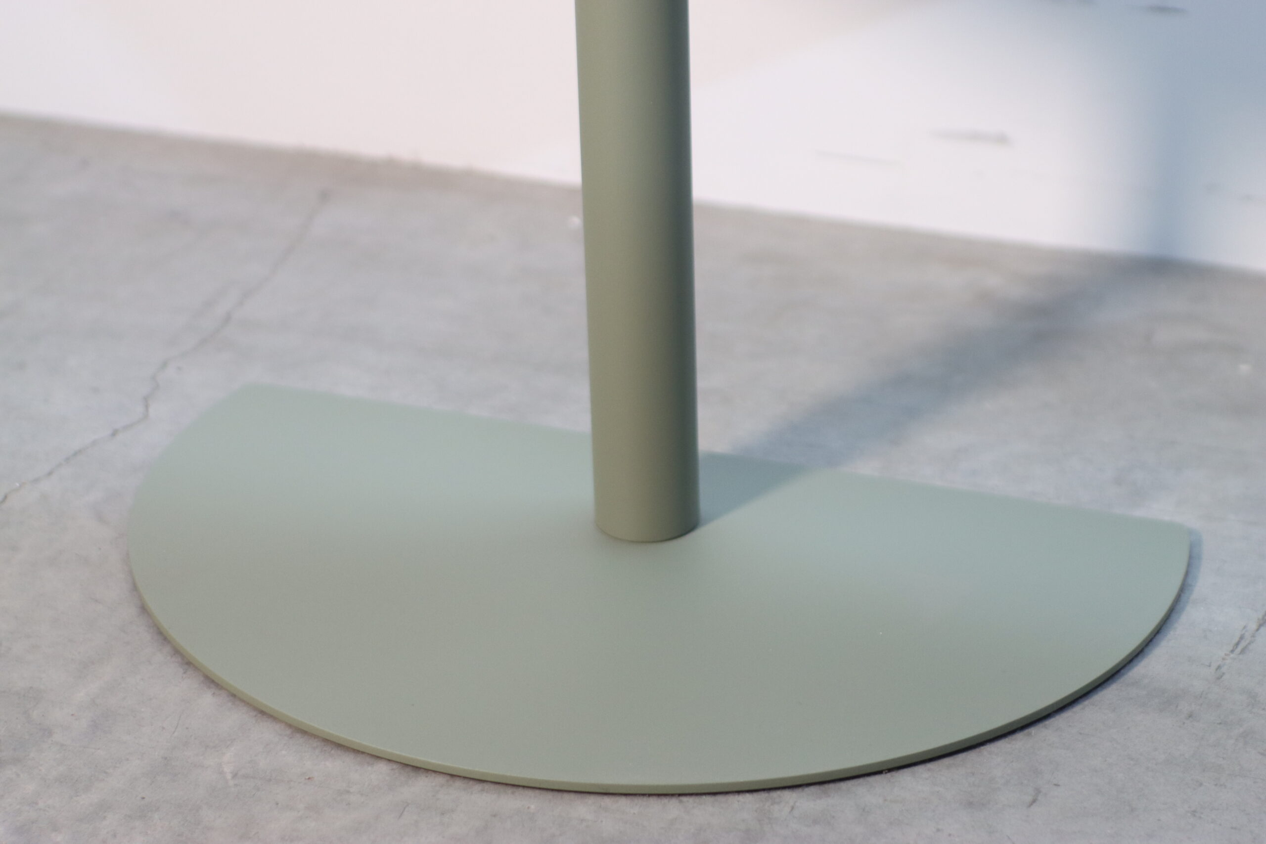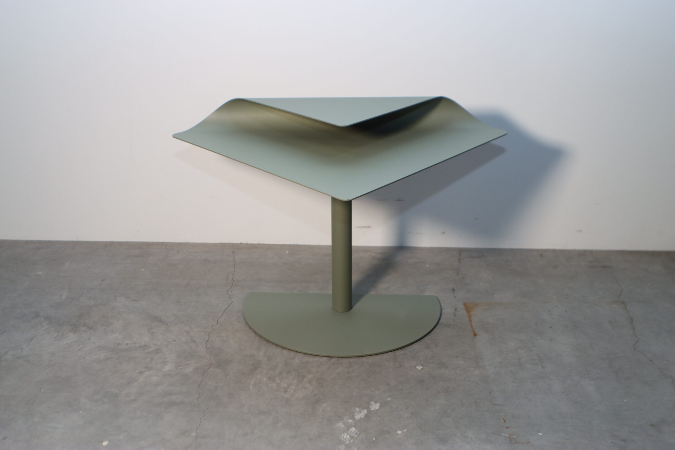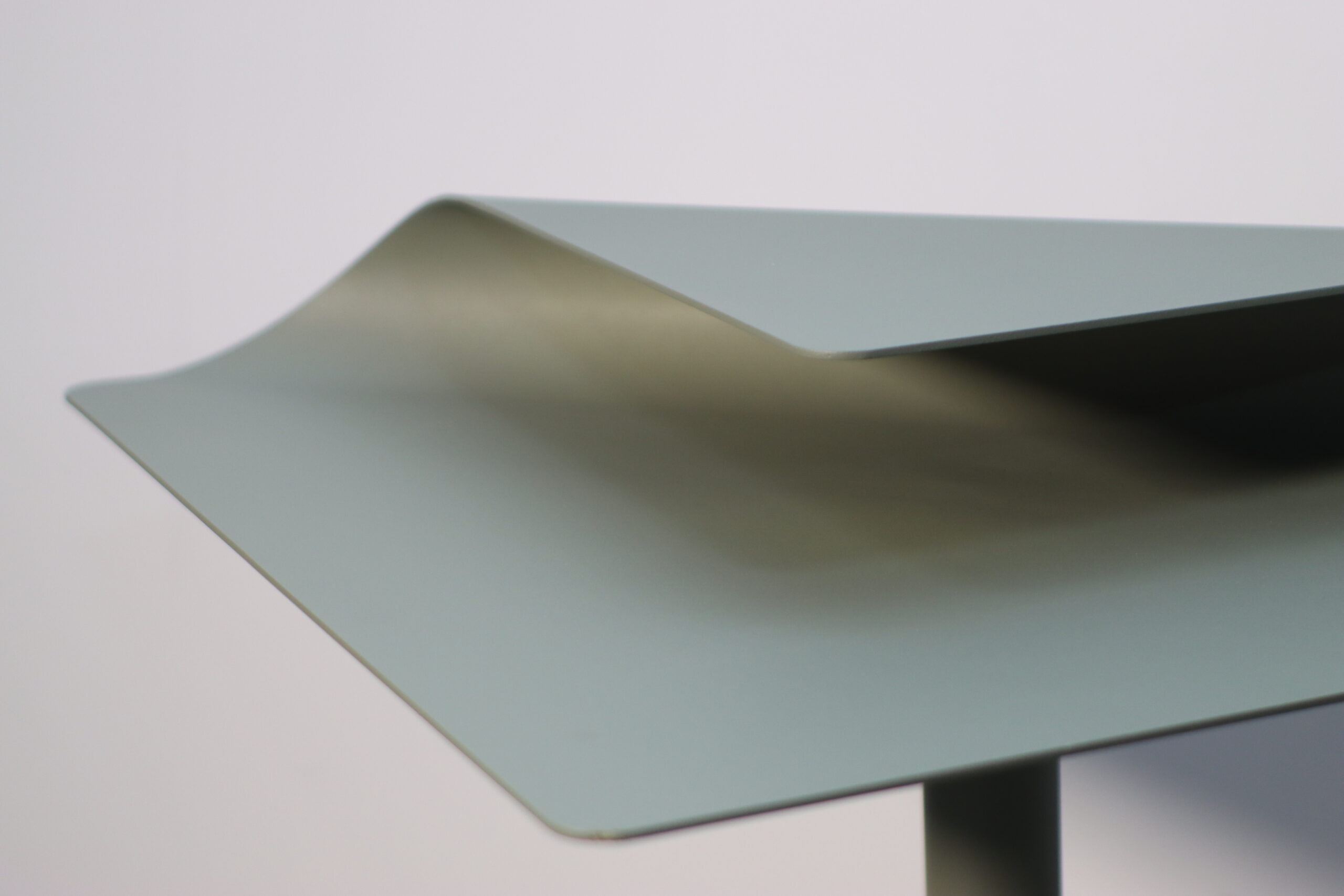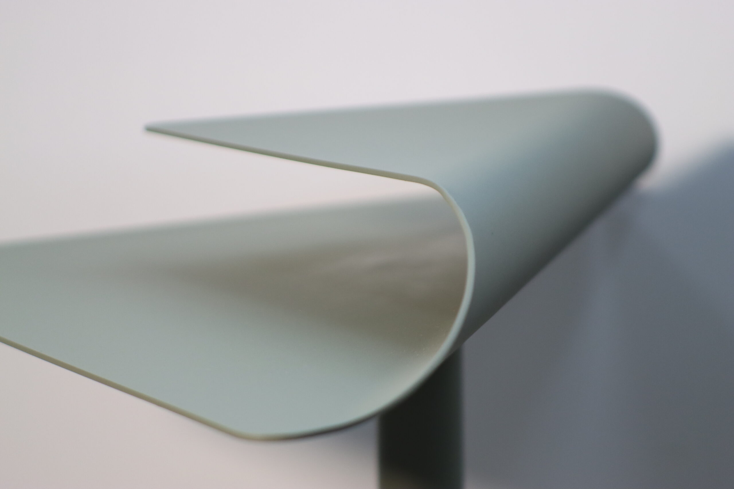 一枚の薄いプレートを折り重ねたような「フォールディング(折り)」のデザインと、柔らかなセージグリーンの質感が、空間にグラフィカルな躍動感とモダンな知性を付与します。