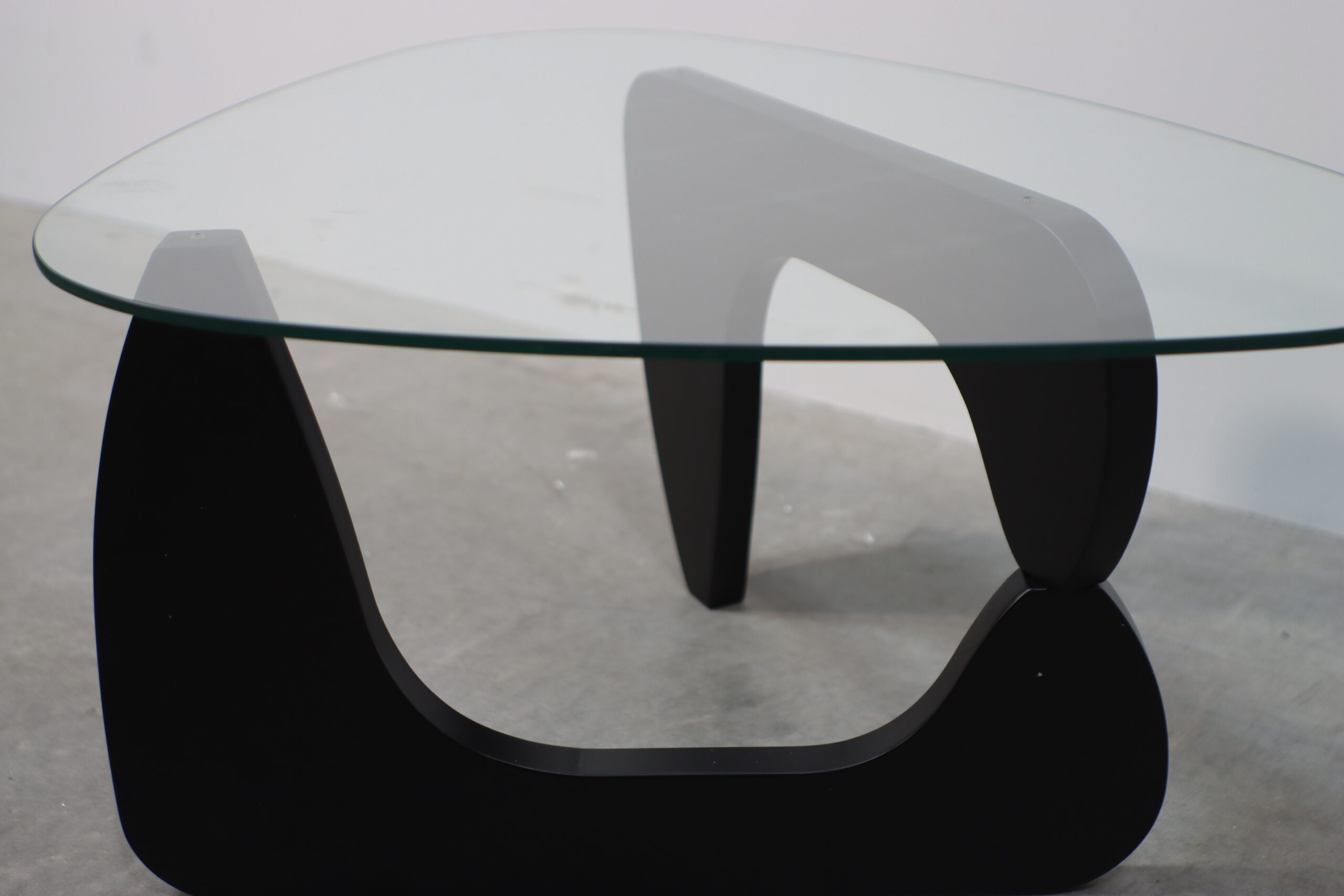 有機的なフォルムのブラックウッド脚と、厚みのある三角形のガラス天板が融合し、空間にアートピースのような洗練された品格をもたらします。