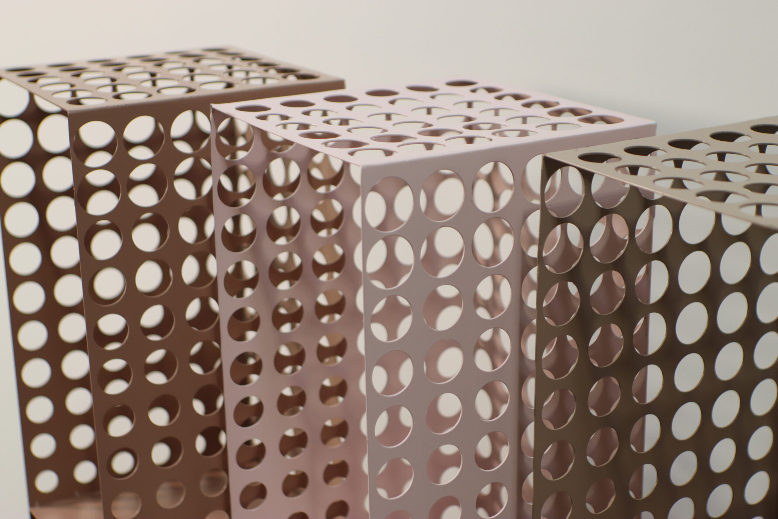緻密に配置された円形のパンチング(穿孔)加工が、空間に「軽やかな透過性」と「グラフィカルなリズム」を付与します。