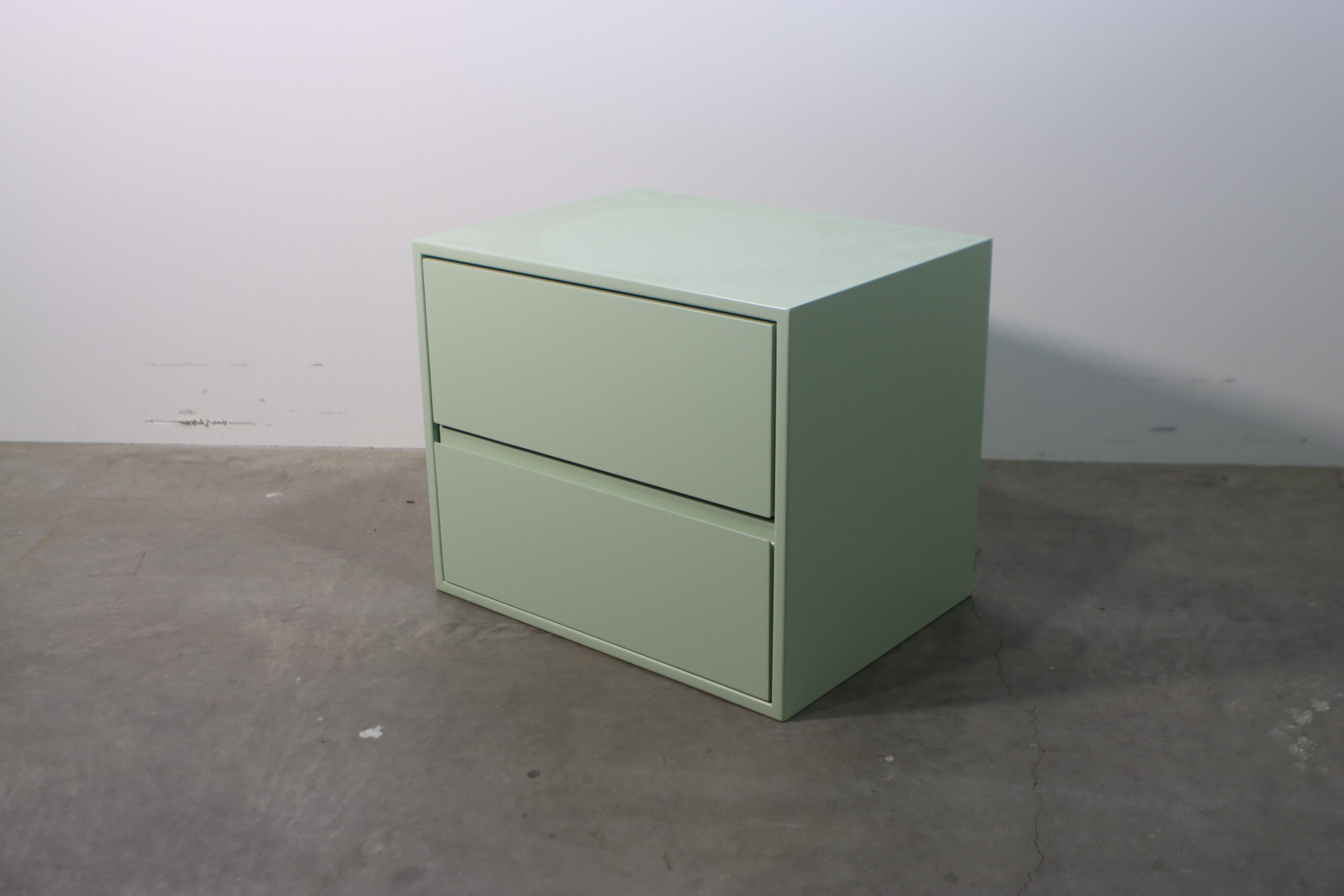 空間を和ませる柔らかなセージグリーンのマット仕上げと、無駄を削ぎ落としたスクエアフォルムが、インテリアに「現代的な優しさ」と「秩序あるミニマリズム」を付与します。