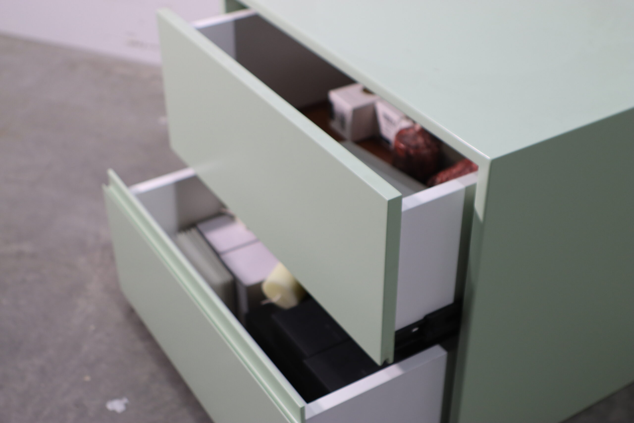 視覚的なノイズとなる取っ手を排除したシームレスな2段引き出し構造は、セット構築において主張しすぎることなく背景と調和し、洗練された「機能的な美学」を演出します。