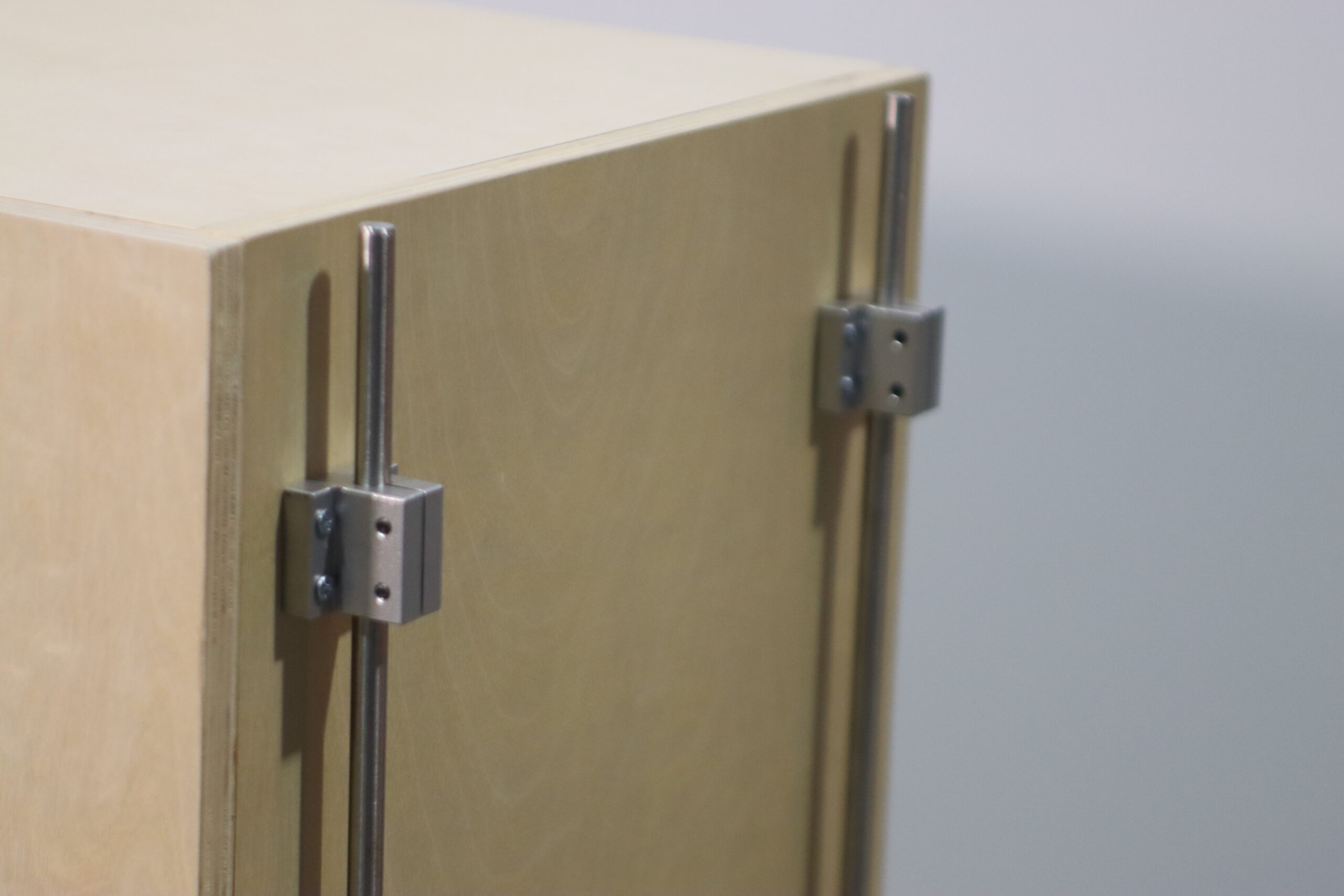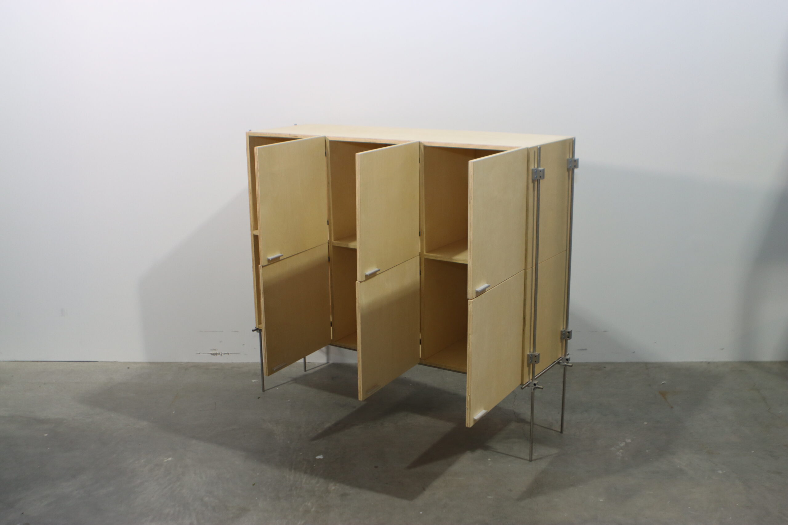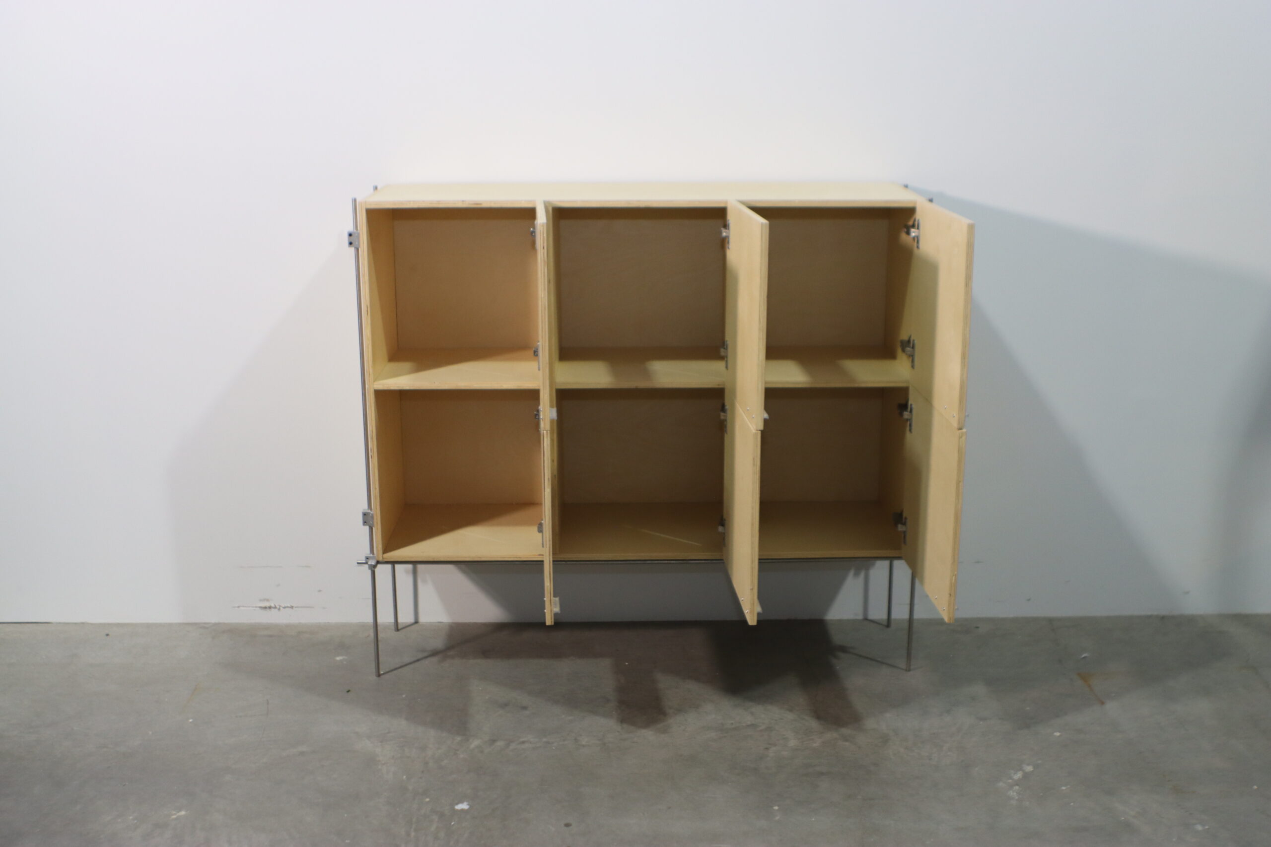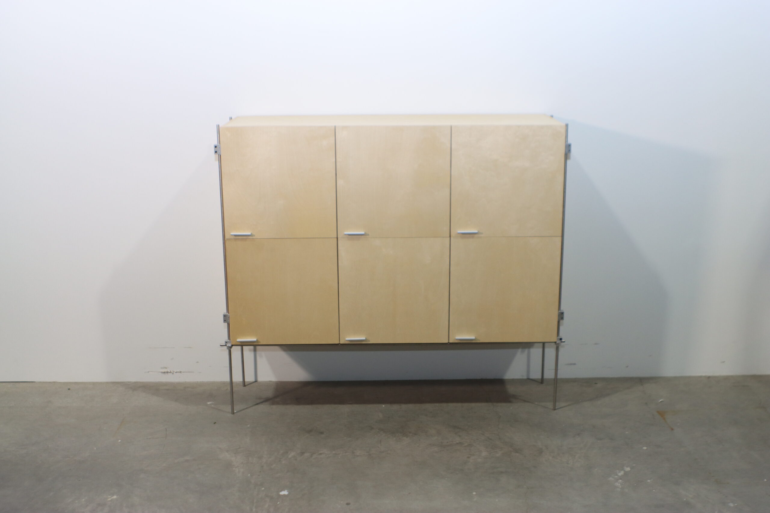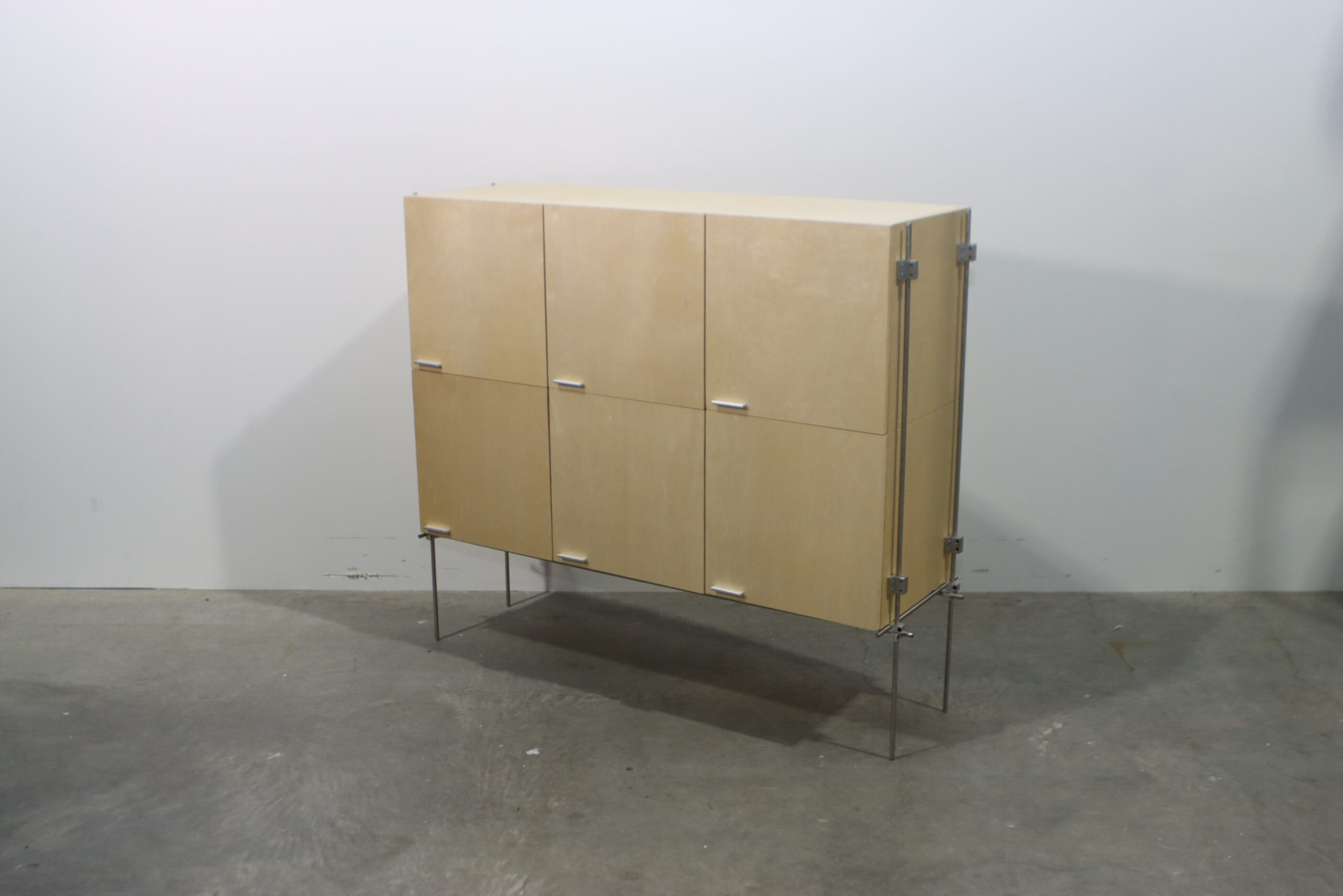 【注意事項】 非常に繊細なラインの脚部で全体を支える設計のため、過度な重量物の収納や、扉を開けた際の前方への重心移動には十分な配慮が必要です。また、合板の表面は湿気や直射日光に影響を受けやすいため、設置環境の維持が推奨されます。