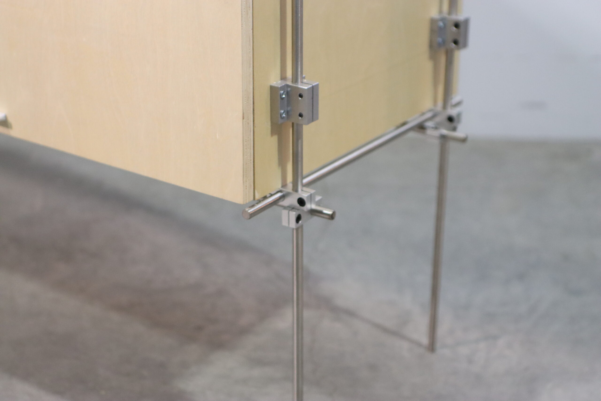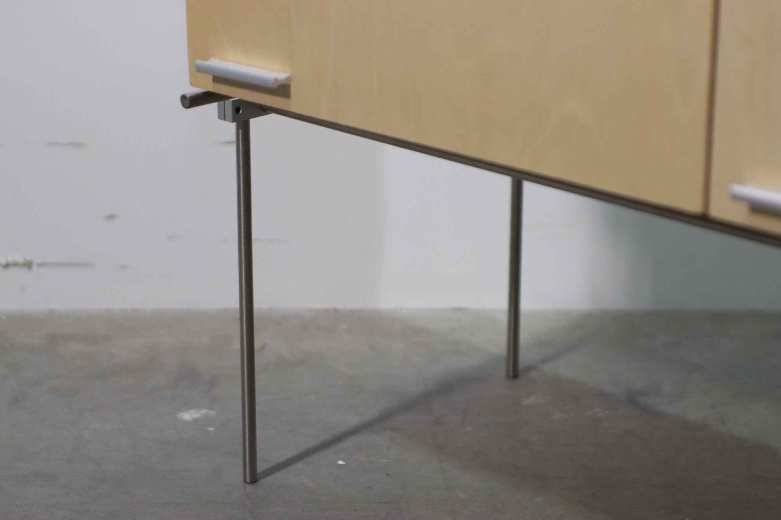 合板(プライウッド)特有の素朴で有機的な質感と、極細のスチール脚が織りなす「浮遊感」のある対比が、空間に現代的な軽やかさと温もりを付与します。