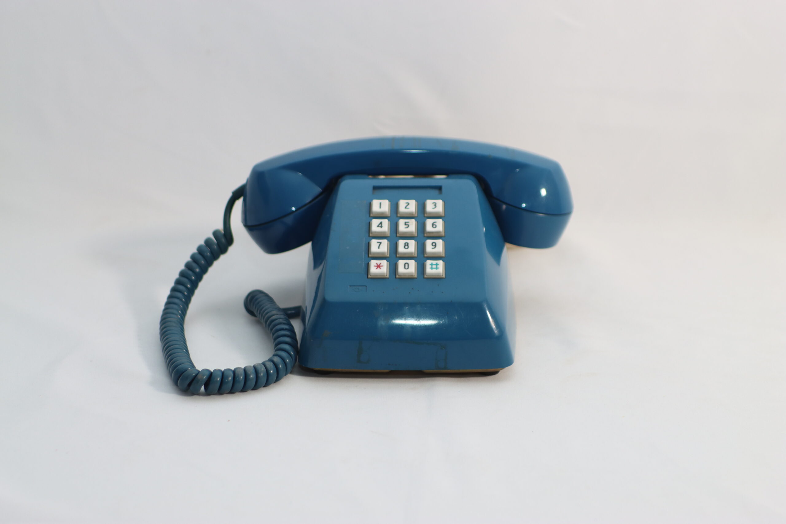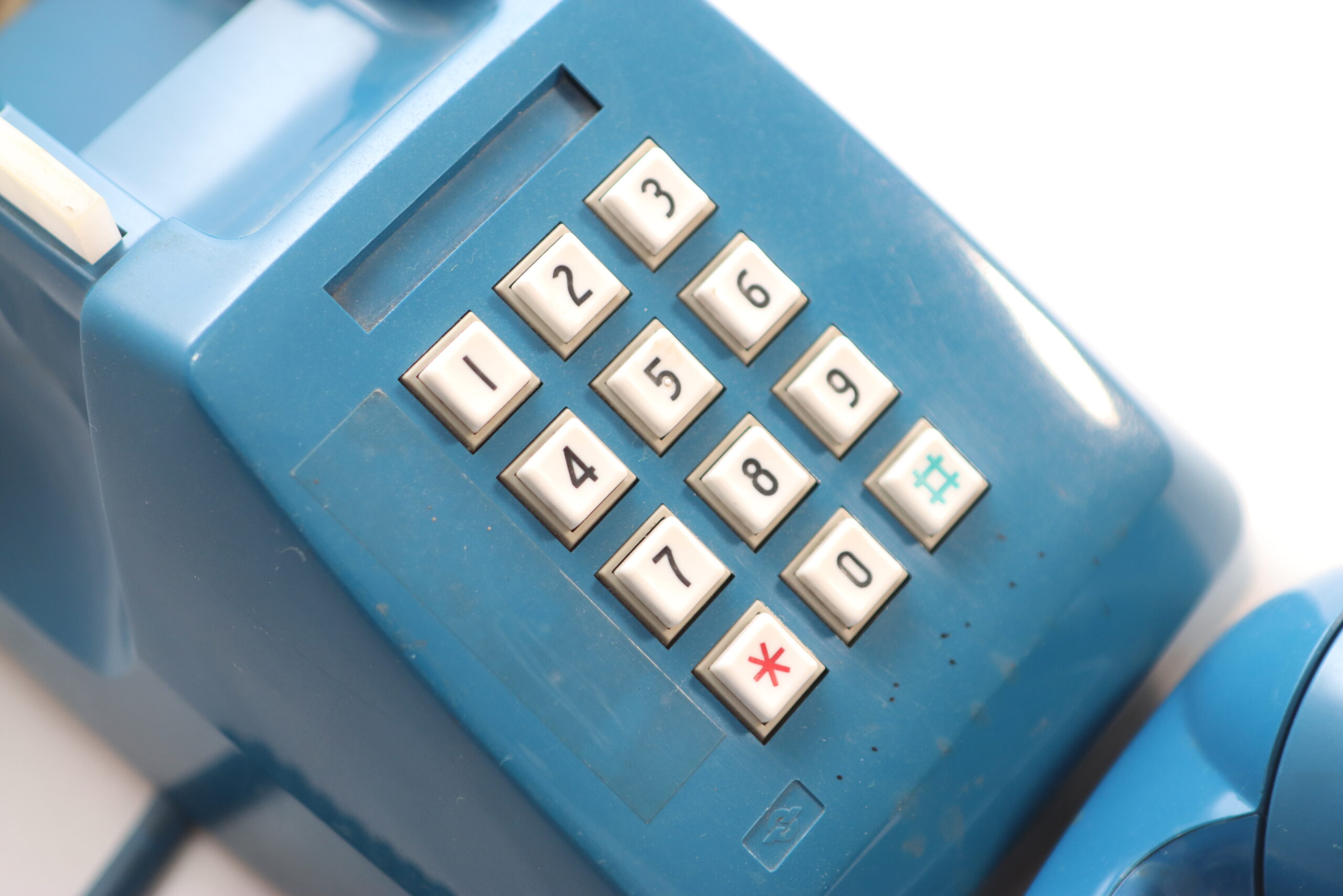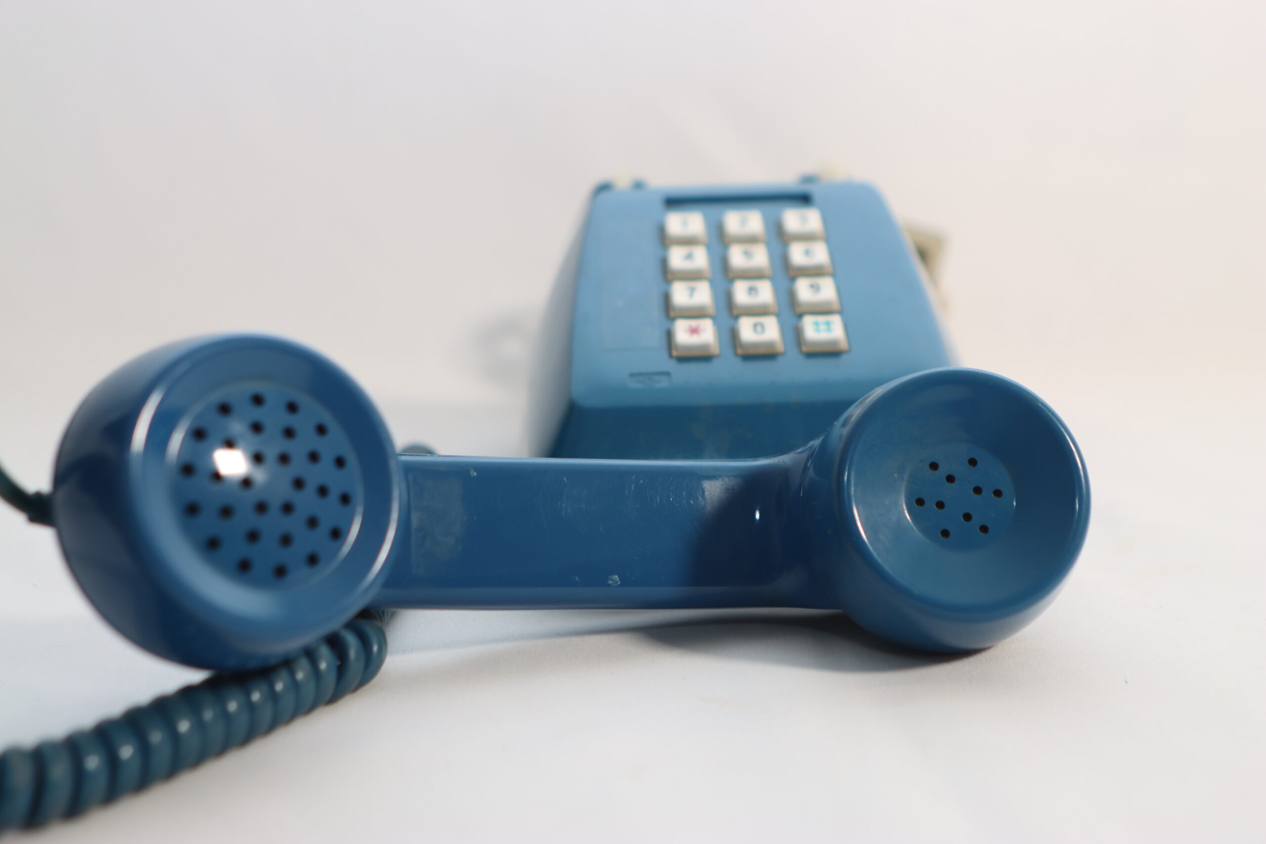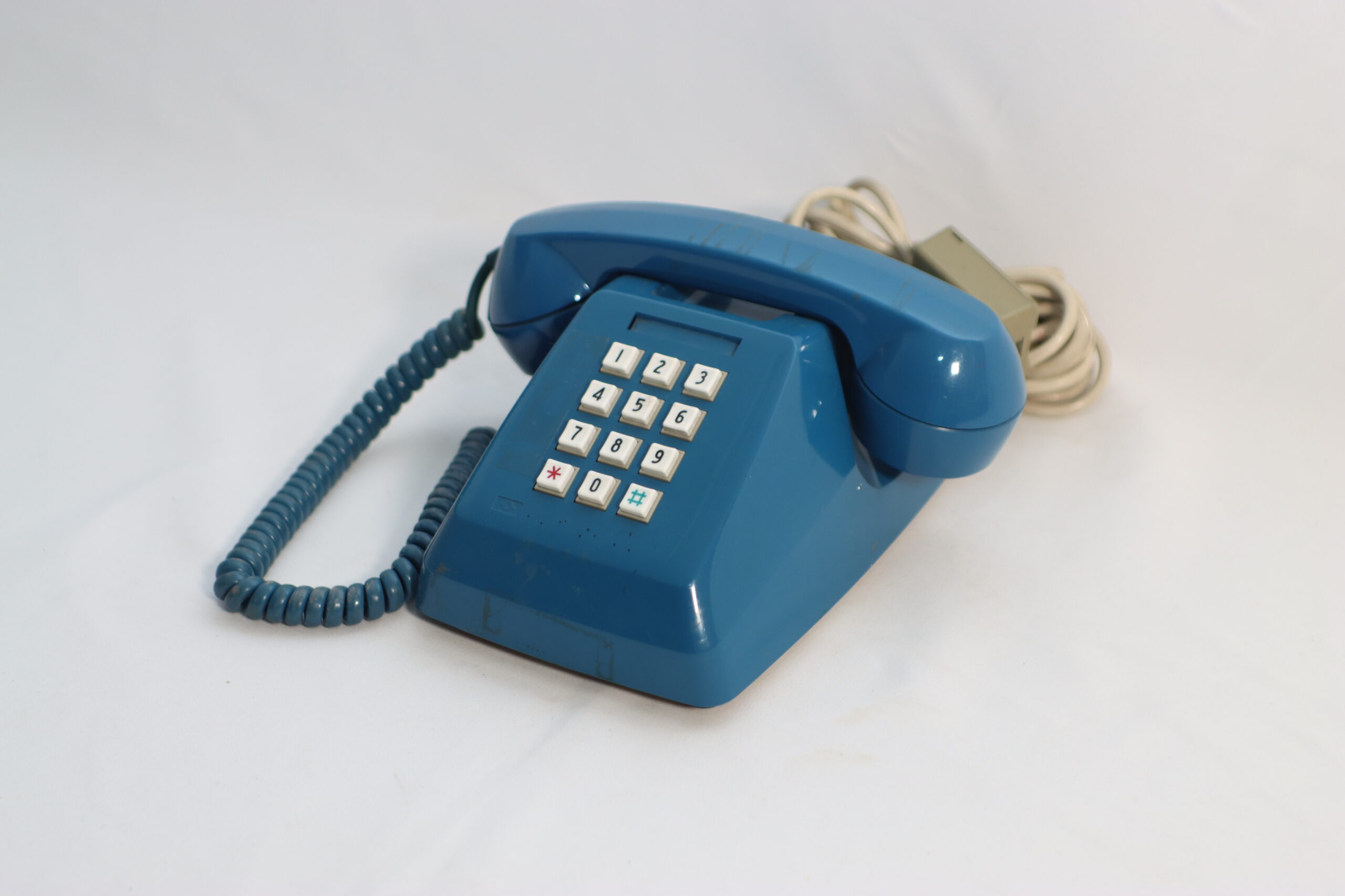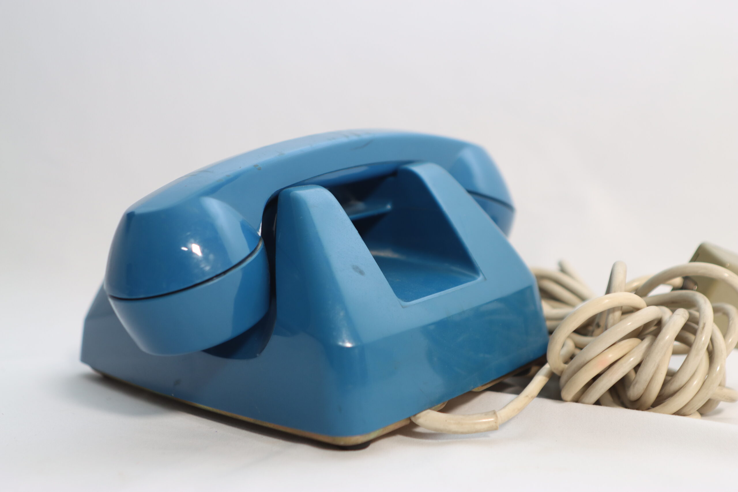 鮮やかなスカイブルーが目を引くプッシュ式電話機です。1970〜80年代のオフィスや家庭を象徴するこのアイテムは、置くだけで画面のカラーアクセントとなり、空間に時代背景という確かな情報を付与します。」