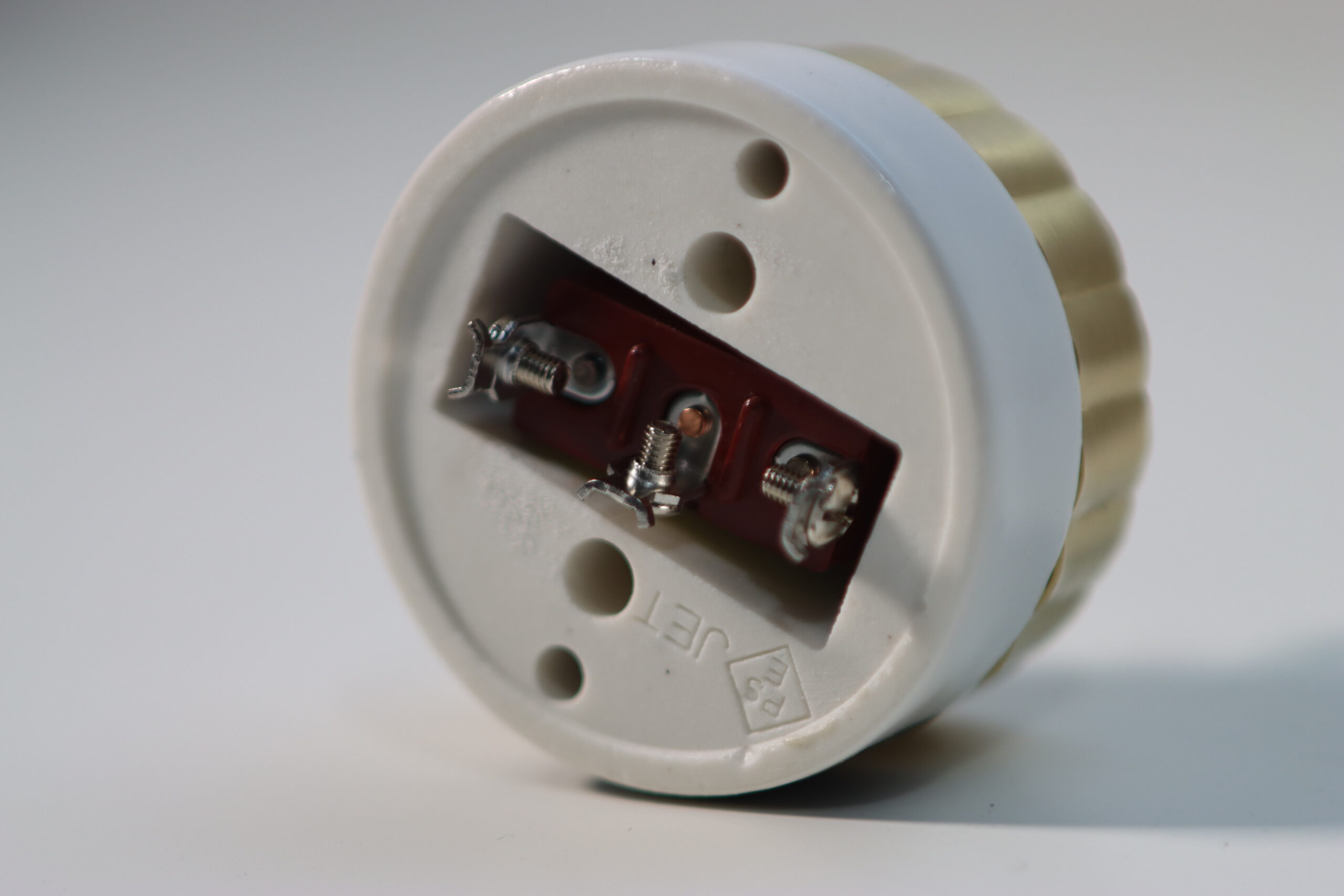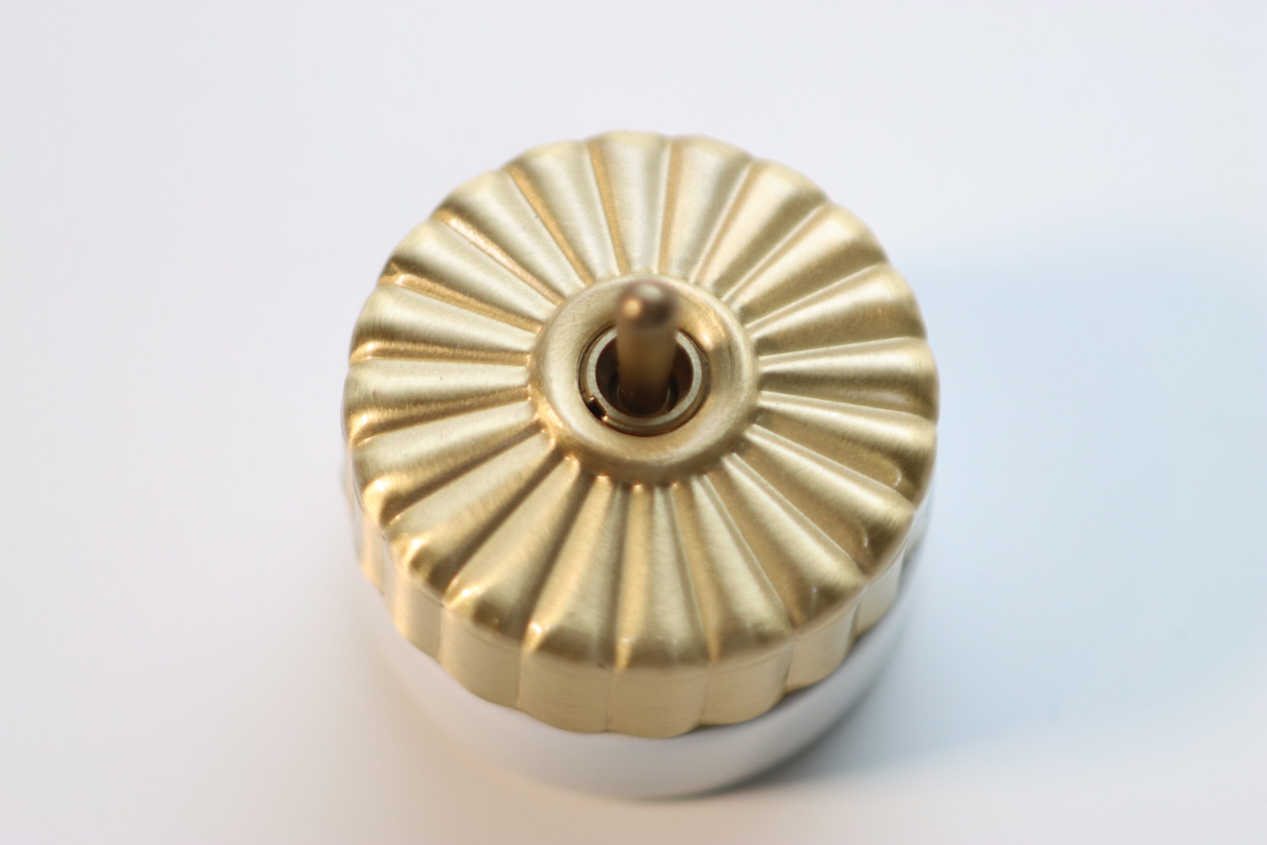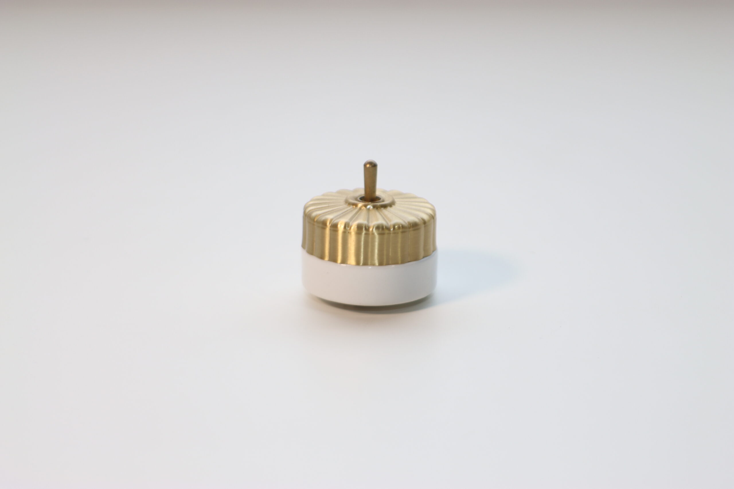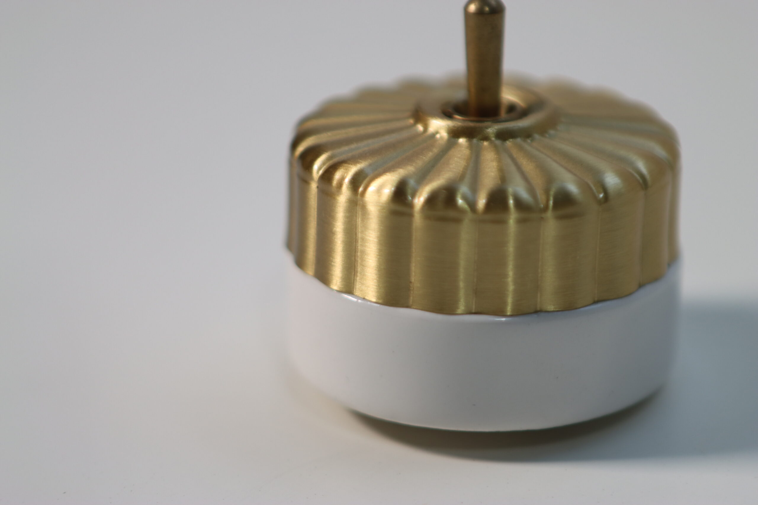 ジュエリーのような輝き: 緻密な凹凸が施されたゴールドの金属パーツと、清潔感のあるホワイトセラミックの組み合わせが、空間に圧倒的な気品と「小さな主役」としての存在感を付与します。