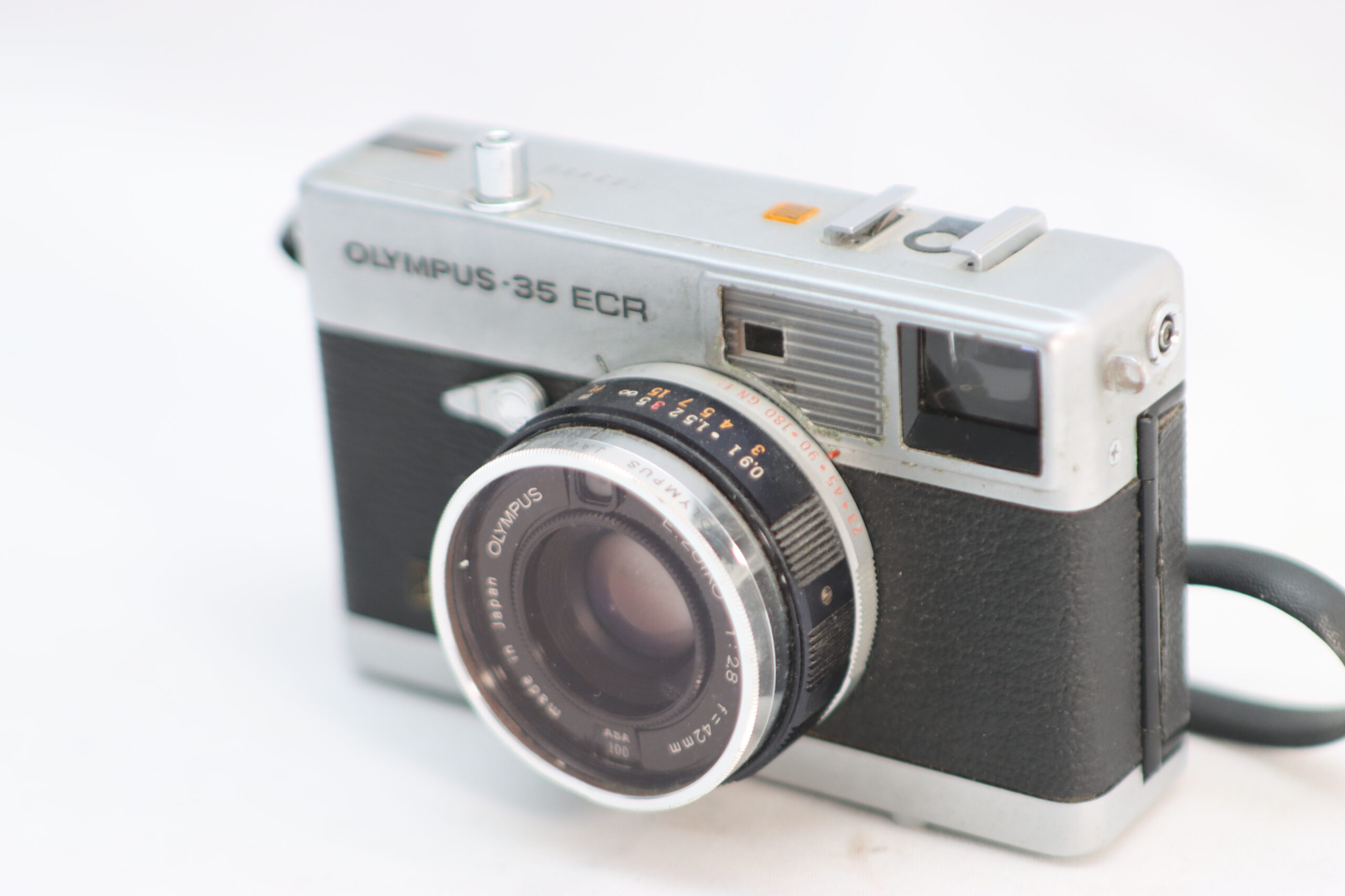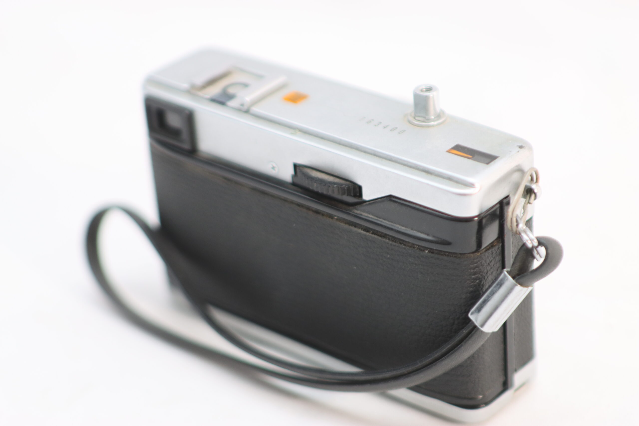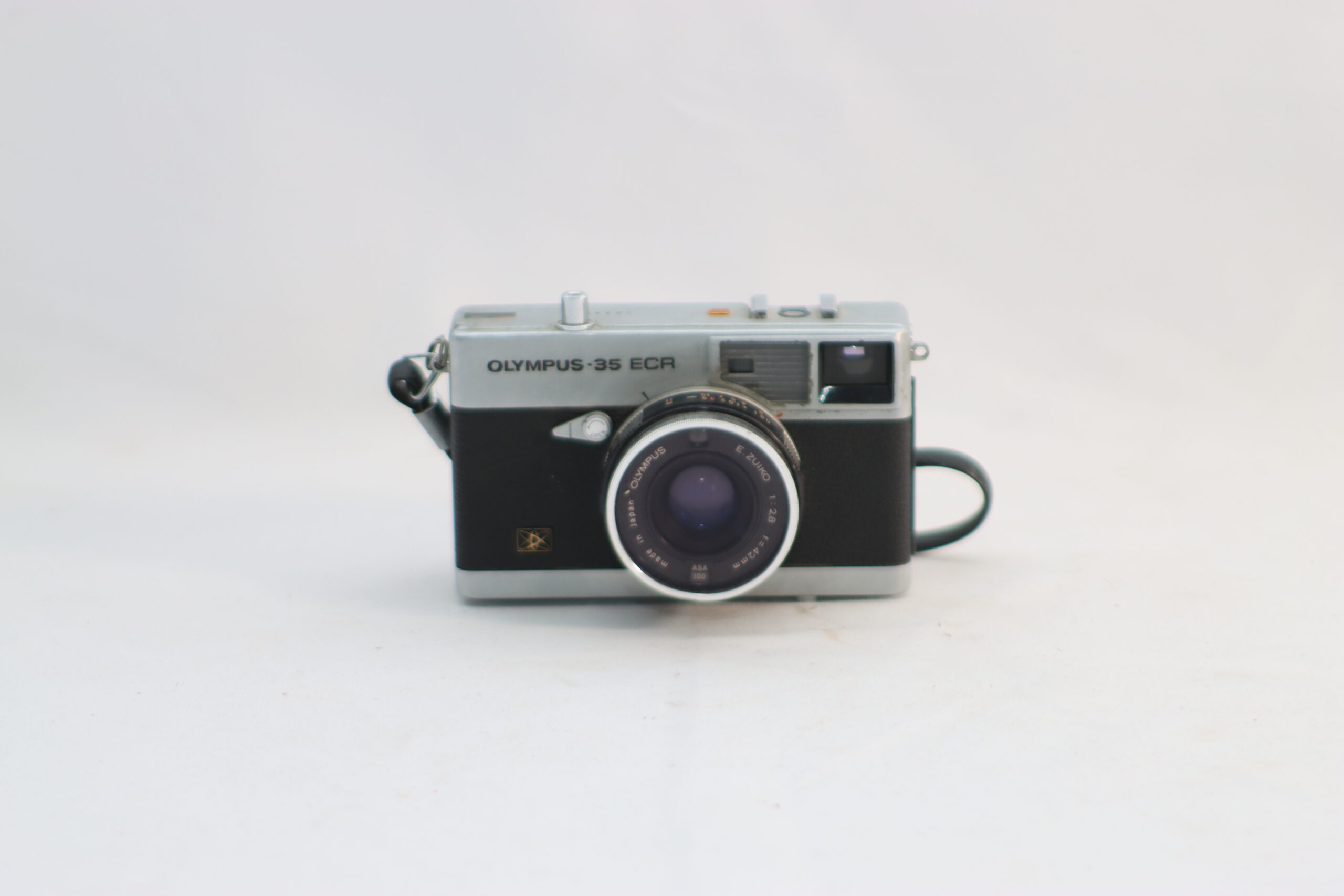 シルバーのトップカバーに刻まれた端正な「OLYMPUS-35 ECR」のロゴと、マットなシボ革調の質感が、空間に「昭和のモダニズム」と「洗練された機械美」を付与します。