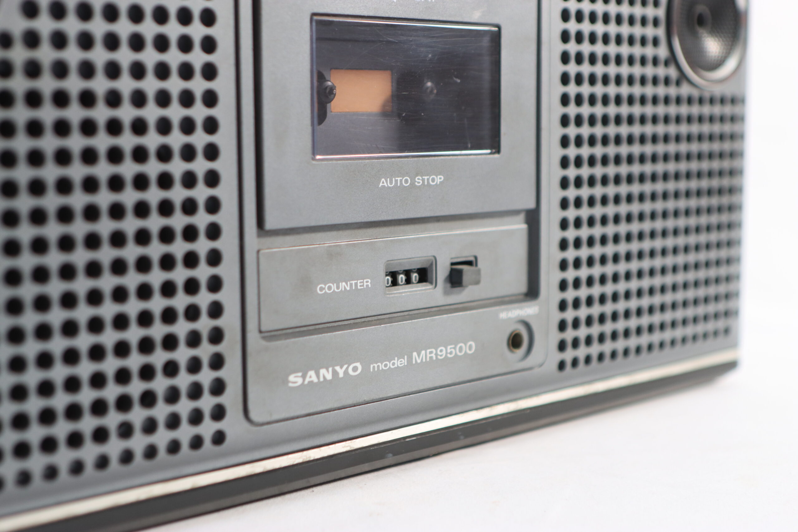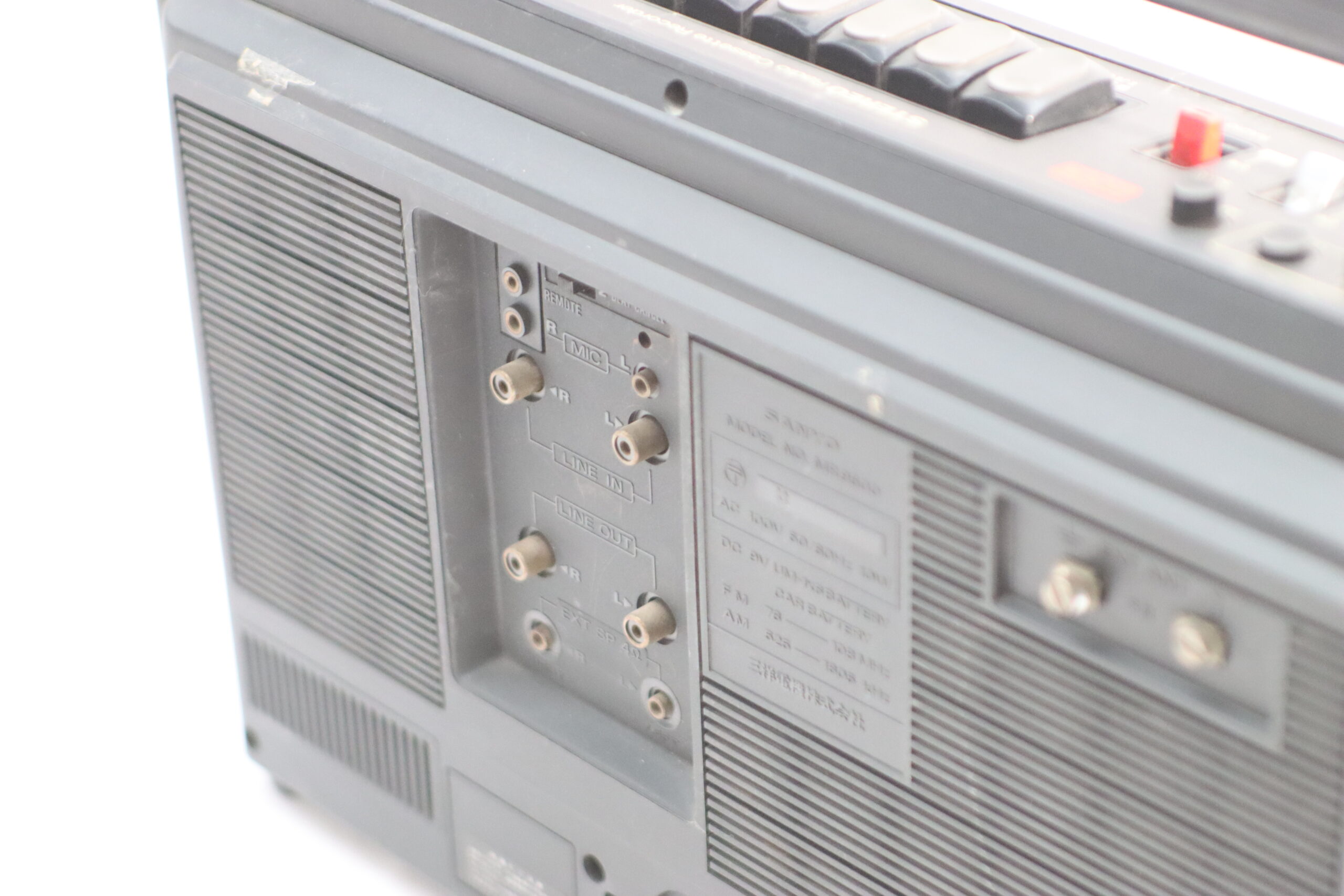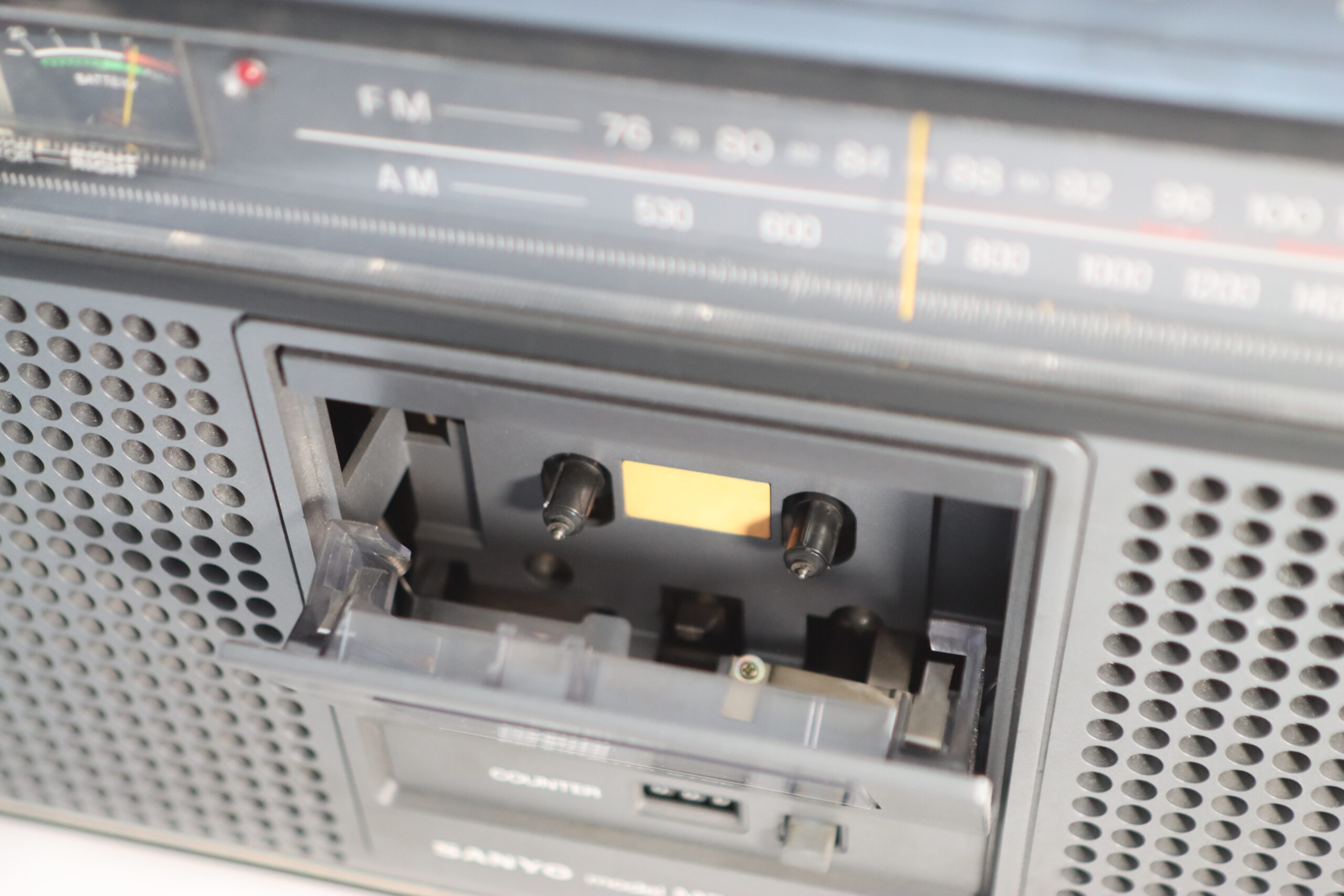 視認性の高いアナログVUメーターと、赤い録音ボタンがアクセントとなる操作パネルは、セット構築において、空間に「現場の道具」としての機能美と、当時の三洋電機らしい実直なプロフェッショナリズムをもたらすプロップとして機能します。