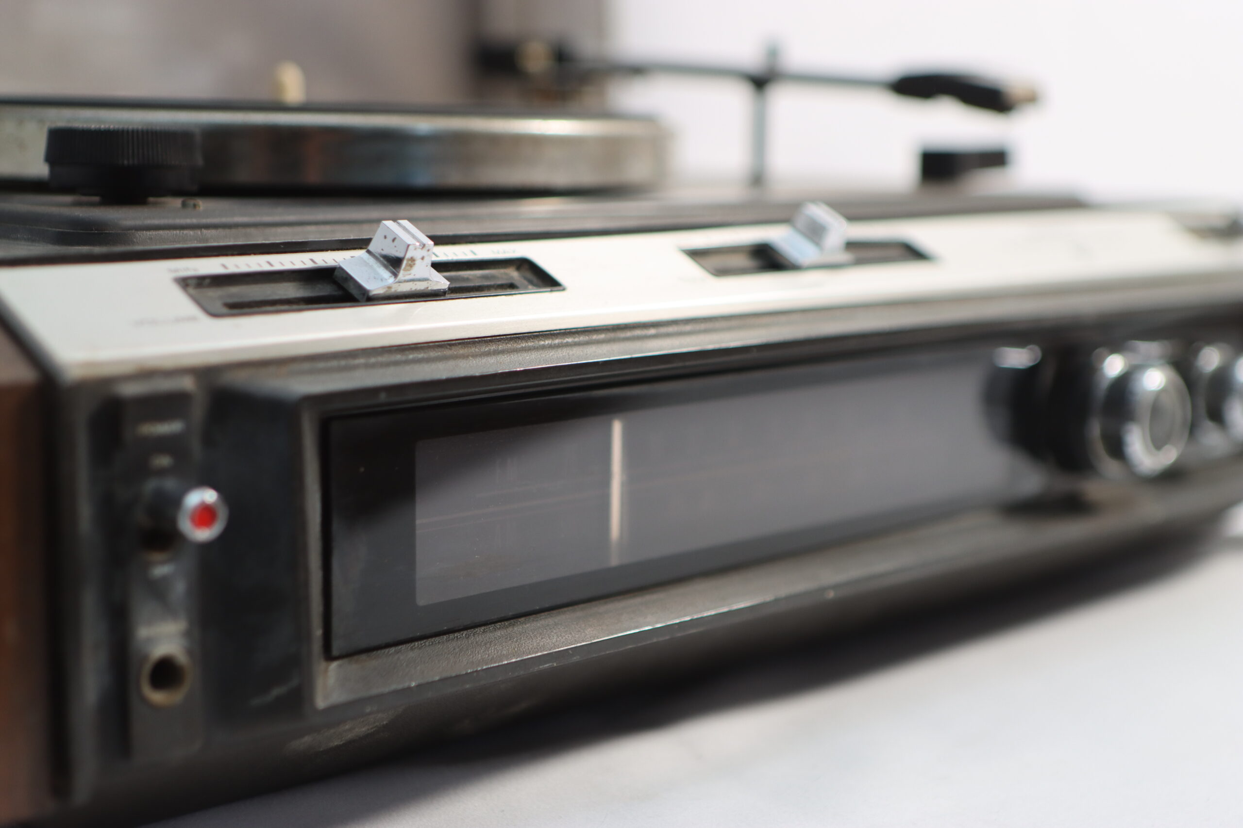 スモークがかったダストカバーと、シルバーの操作パネルに並ぶスライド式ボリュームが、空間に「1970年代の本格オーディオ」の重厚さと贅沢な空気感を付与します。