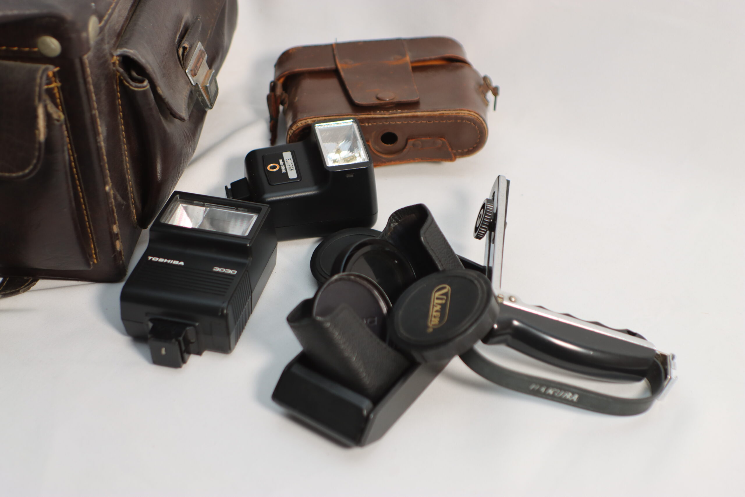 TOSHIBA製の外付けフラッシュ(3030)や露出計などの実戦的な小物がセットになっており、セット構築において、撮影旅行の準備中や、かつての現像所の片隅を演出する、生活感とプロフェッショナリズムが同居したプロップとして機能します。