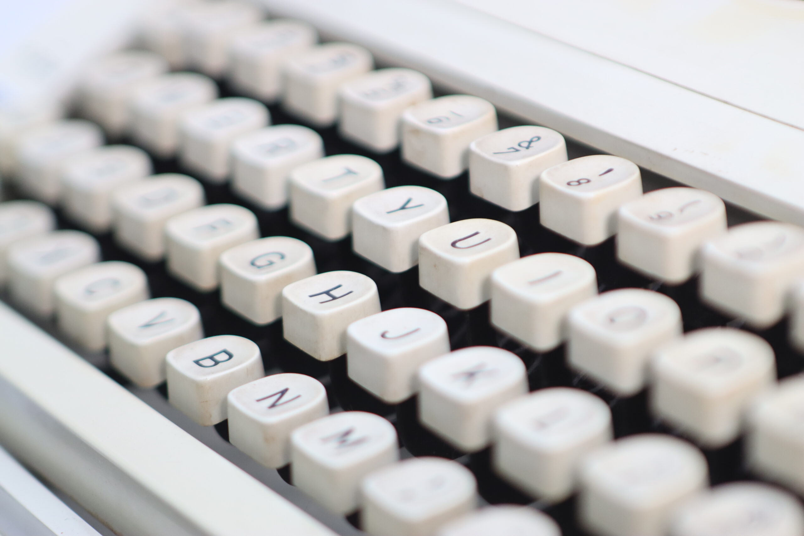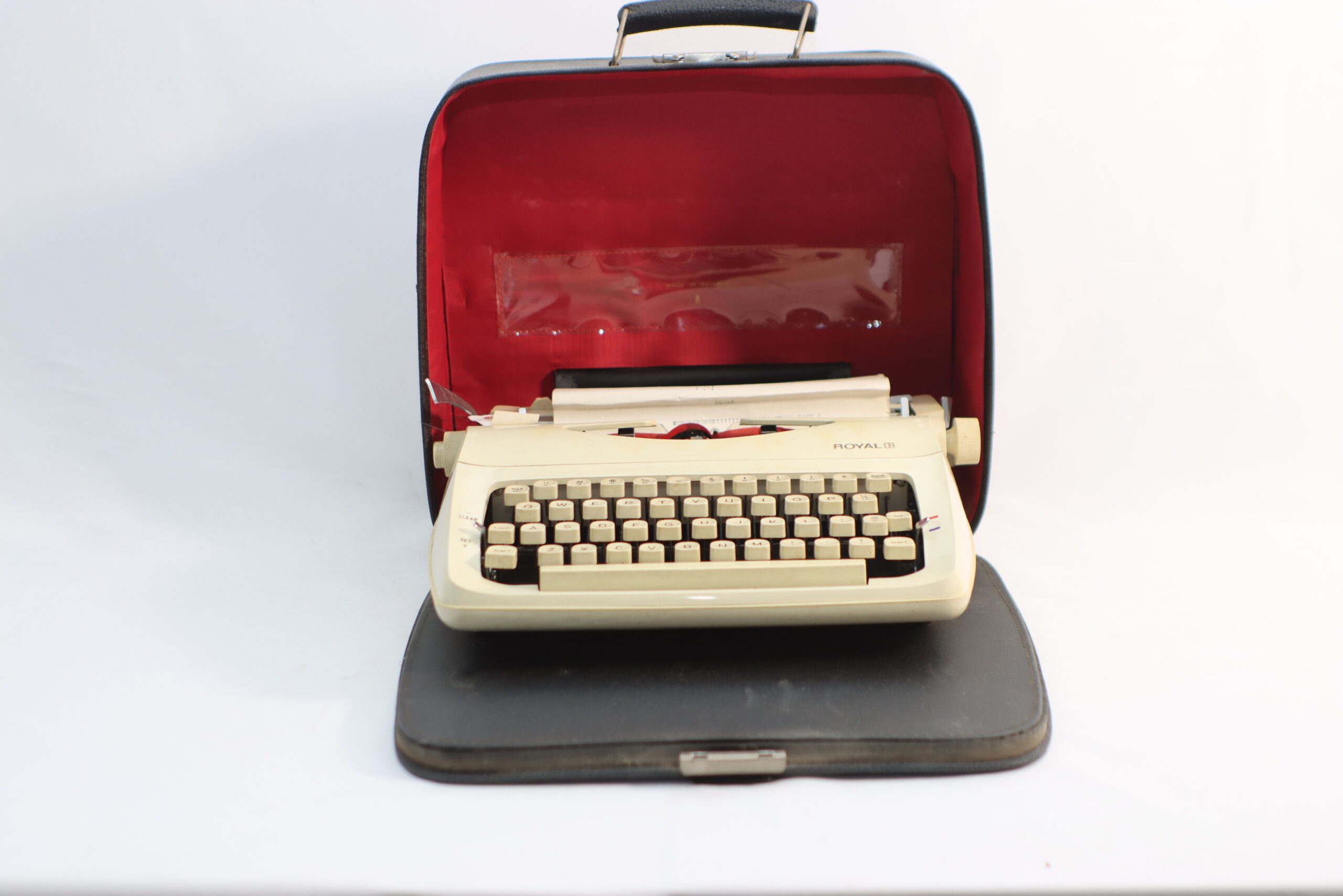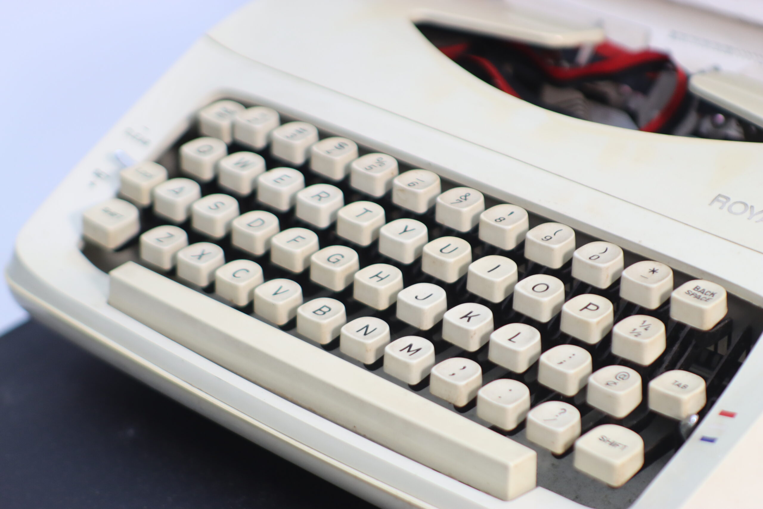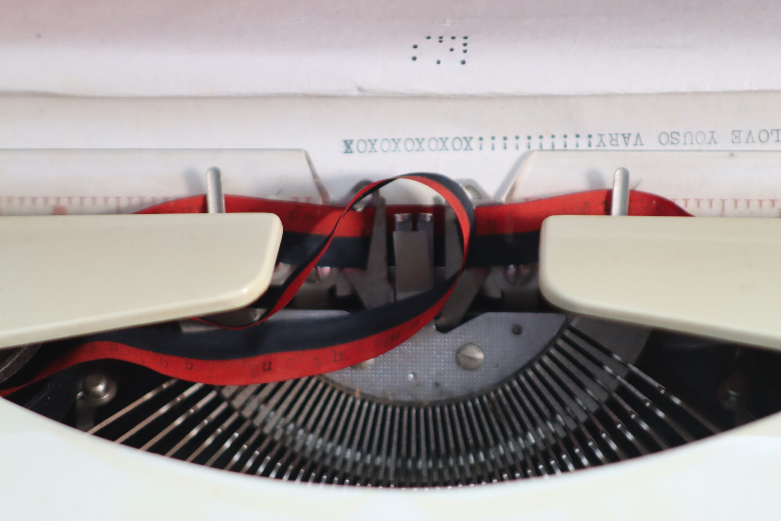 赤と黒の2色リボンが露出したメカニカルな構造と、実際に紙がセットされた佇まいは、セット構築において、空間に「作家の書斎」や「報道機関の編集デスク」のような、思考が形になる瞬間のリアリティをもたらす主役級のプロップとして機能します。