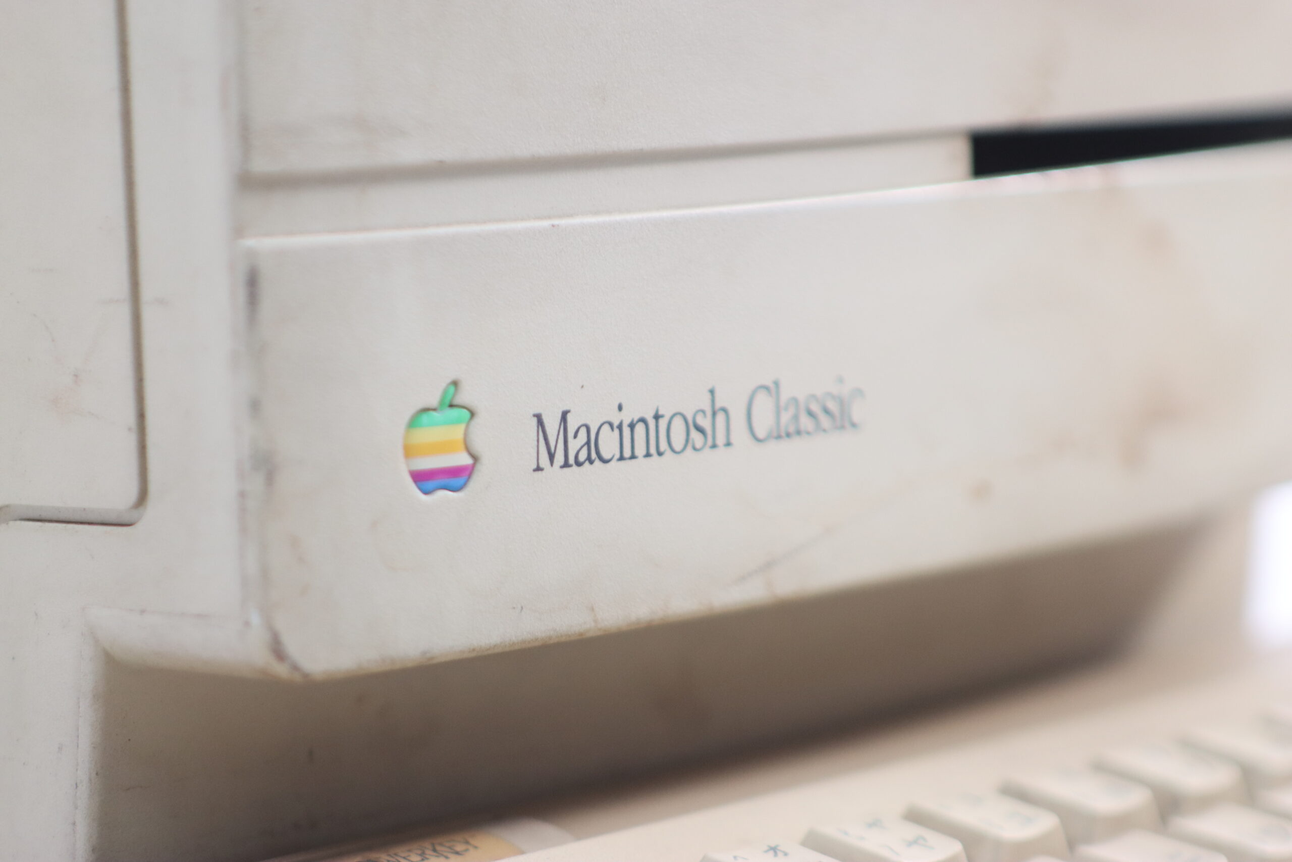 990年代初頭のDTP革命を支えた、親しみやすい「オールインワン」フォルムと、左下に輝く象徴的なレインボーロゴが、空間に「デジタルクリエイティビティの夜明け」という強いメッセージを付与します。