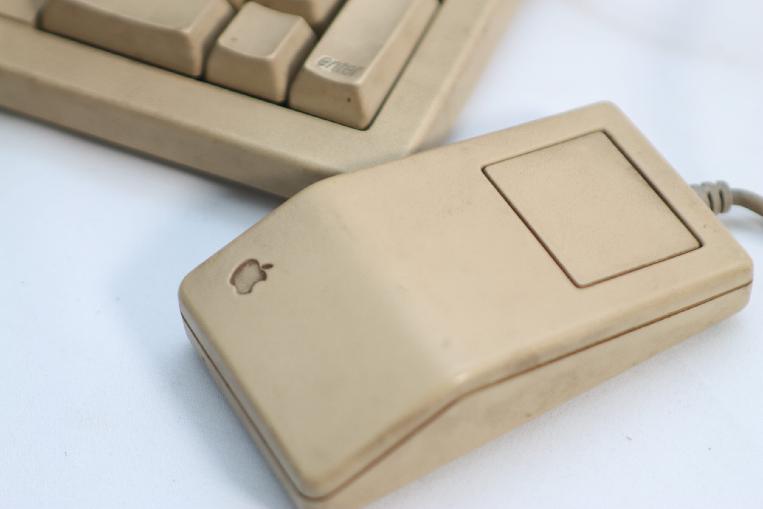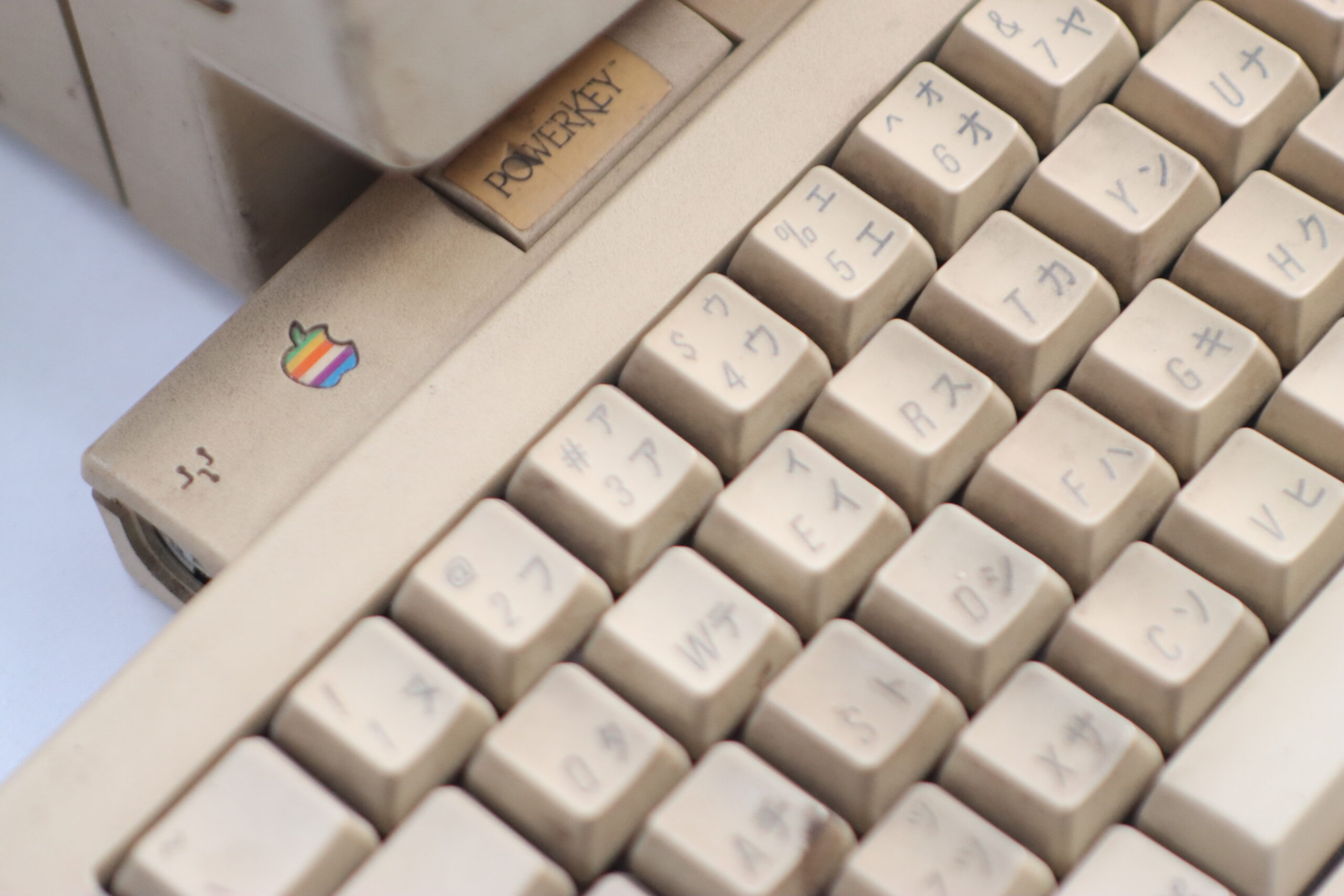 経年によるプラスチックの独特な風合いを纏った本体、キーボード、そして角張ったワンボタンマウスのセットは、セット構築において、初期のITベンチャー企業や、クリエイターの秘密基地のような空間のリアリティを演出する、圧倒的な存在感を持つプロップとして機能します。