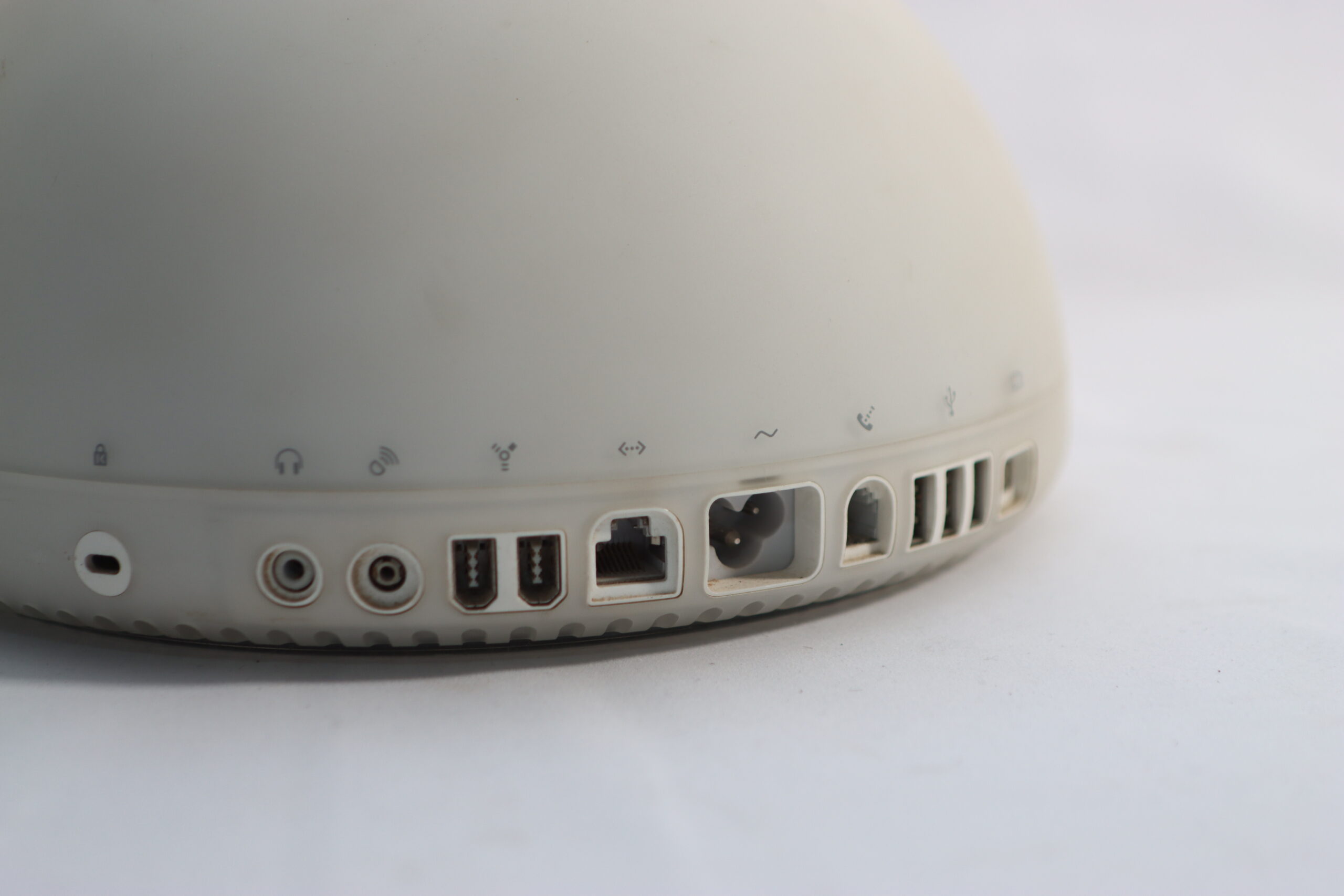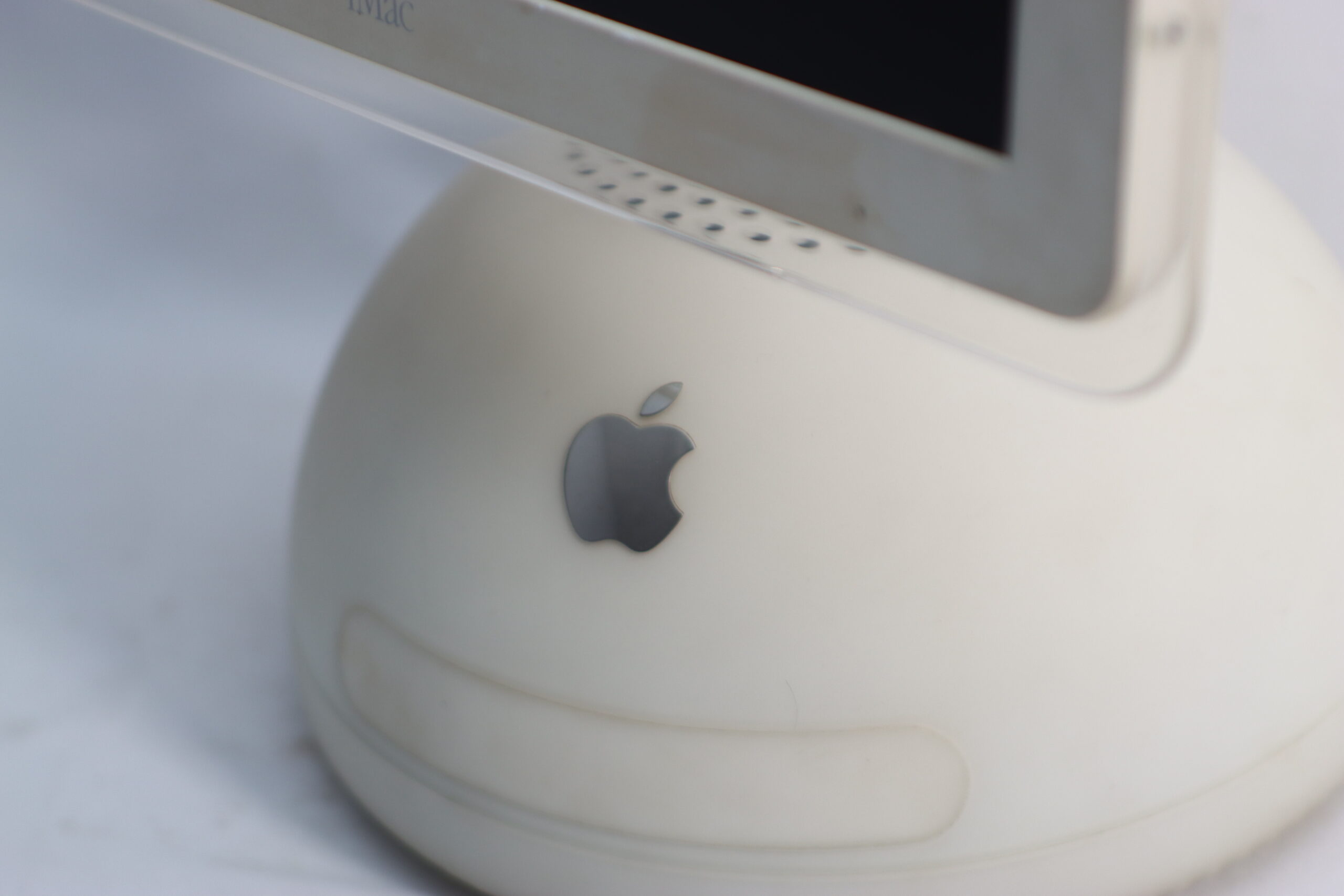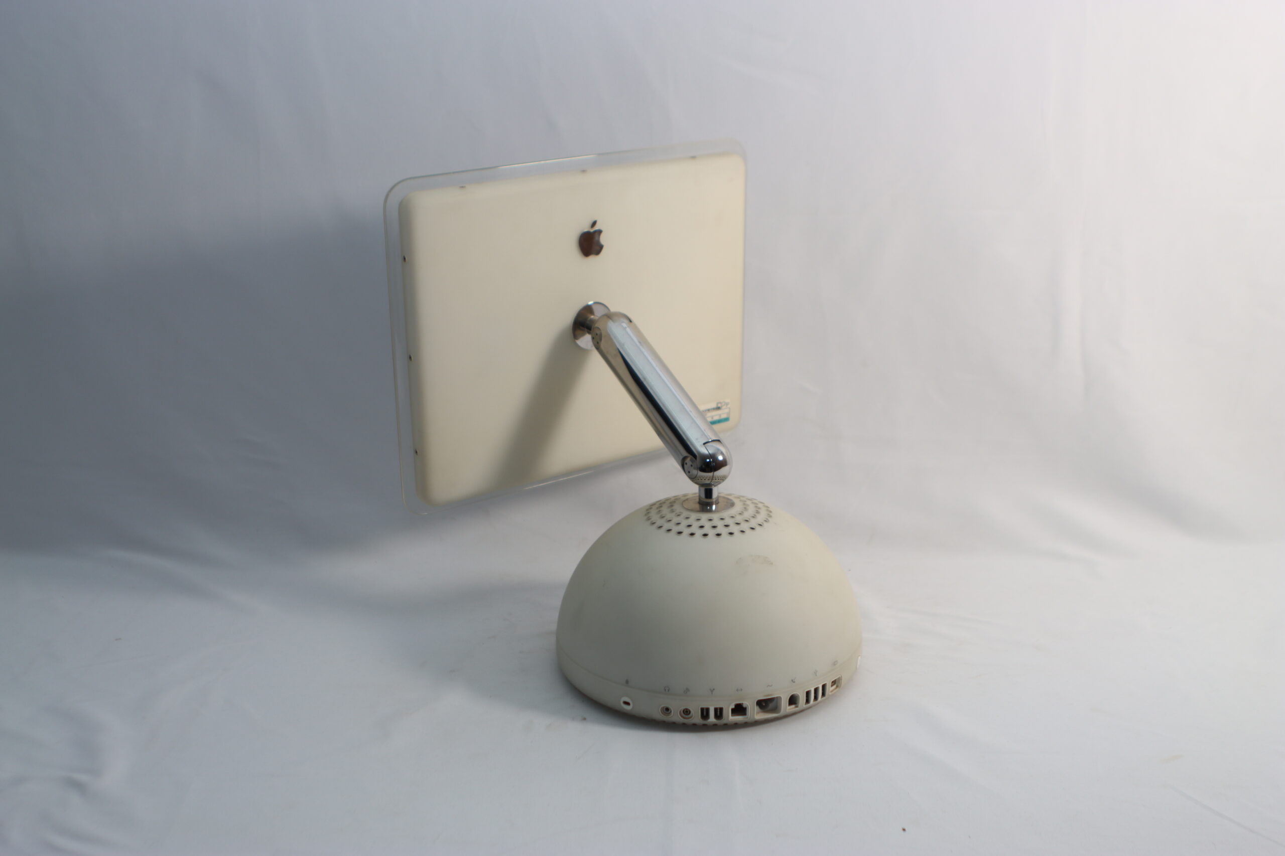 透明なベゼルに囲まれた液晶画面と、半球上部に整然と並ぶ排気孔、そして中央のAppleロゴは、セット構築において、2000年代のモダンなクリエイティブスタジオや、最先端を追求したパーソナルデスクのリアリティを演出する、アイコンとしての存在感を放ちます。