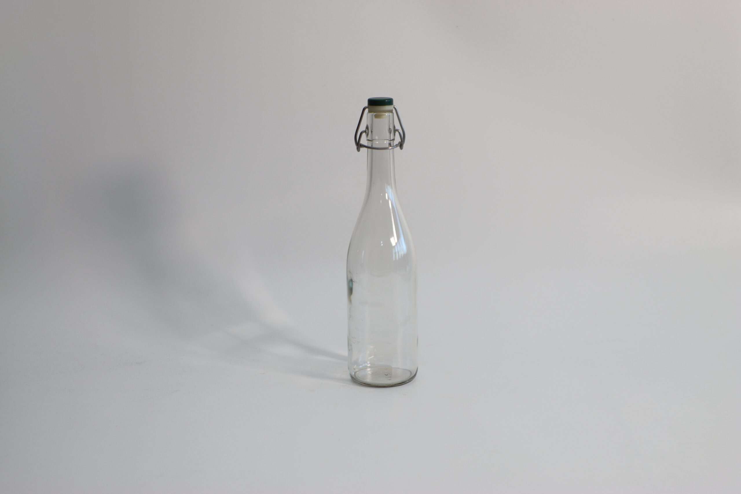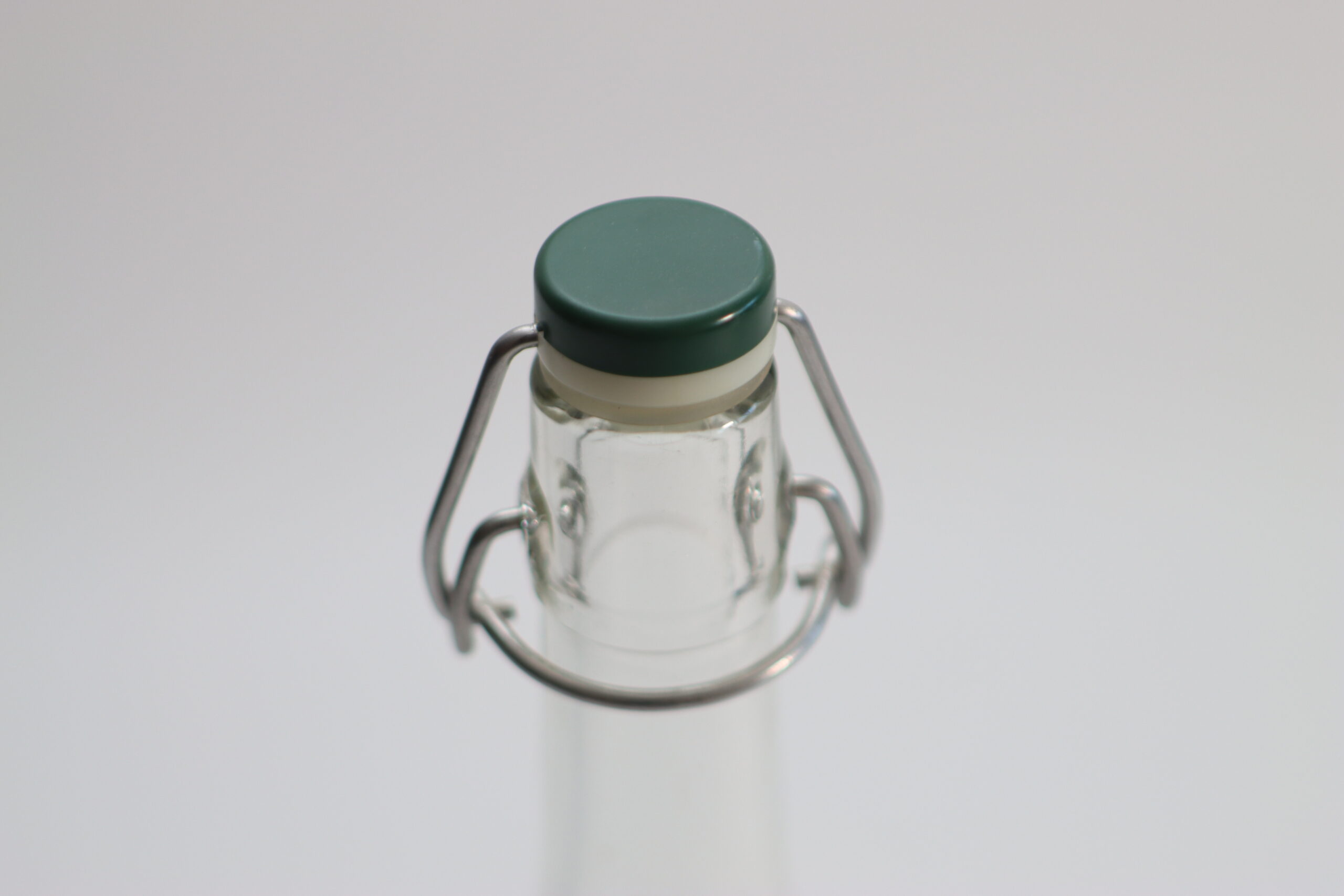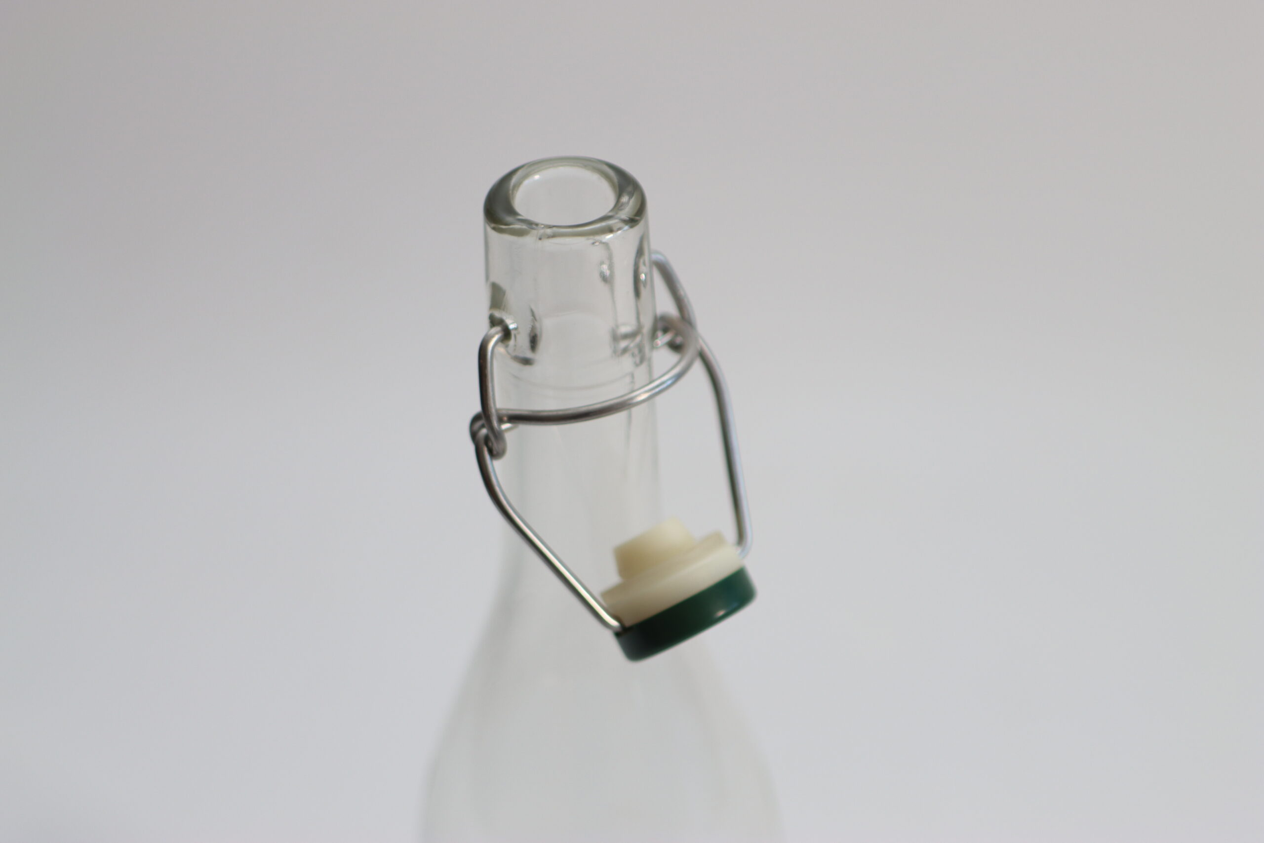 金属の留め具が付いた、スイングトップ仕様のクリアガラスボトル。