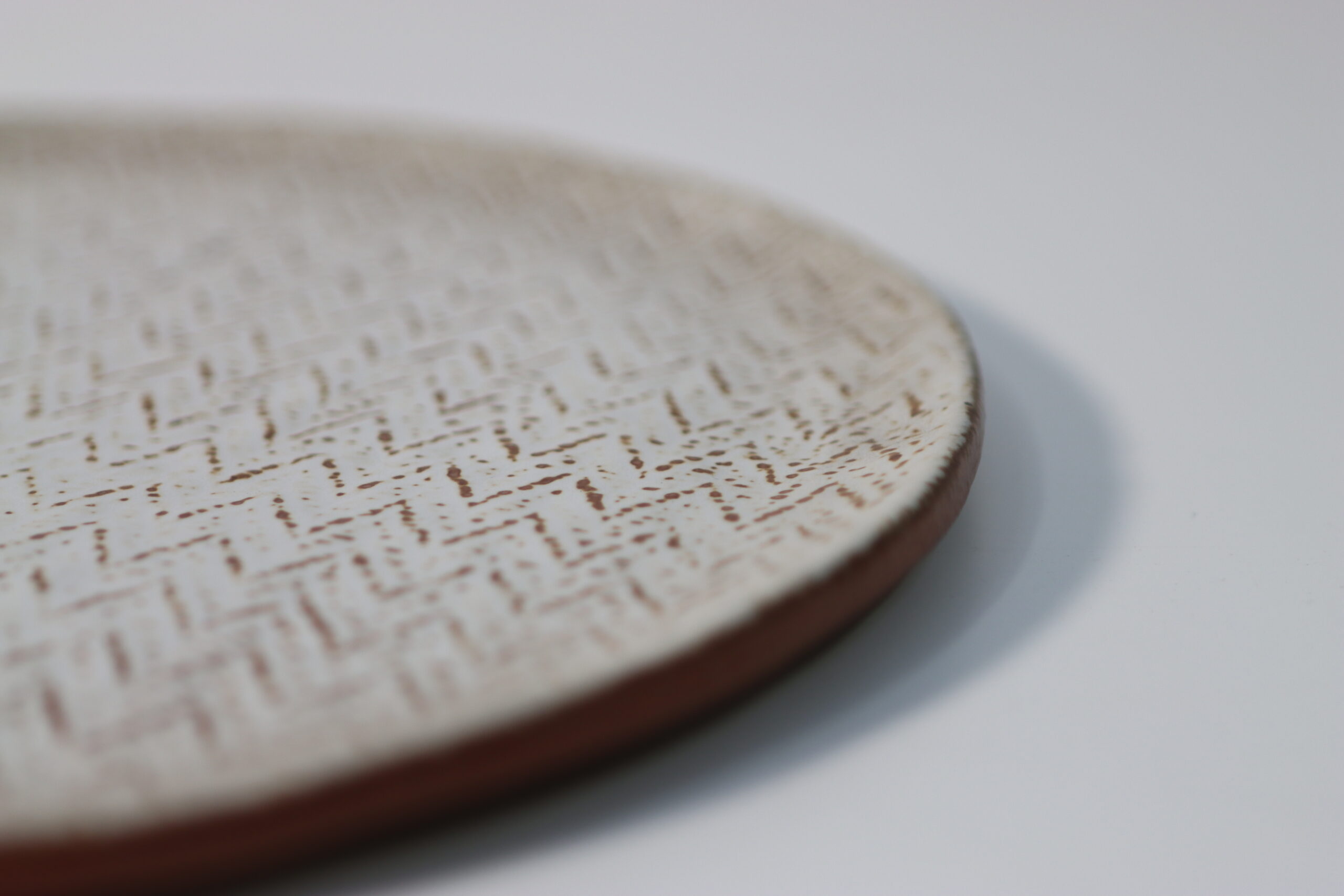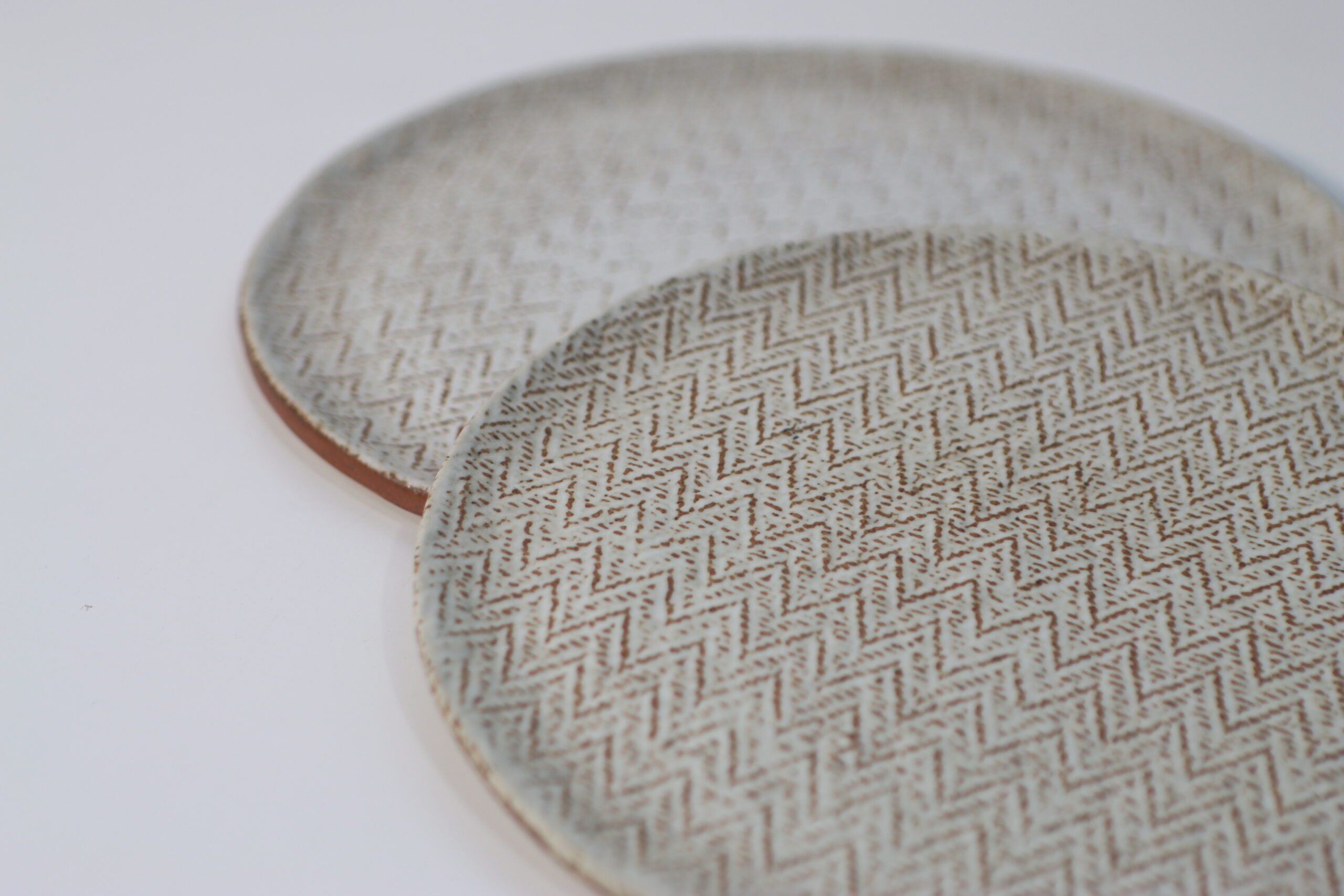 本製品は、ヘリンボーン模様と麻の風合いを活かした鑑賞・装飾用、または撮影用プロップであり、実際の食器としての実用性(水分や油分を含む食材の直接の盛り付け、繰り返しの洗浄に対する耐久性等)は考慮されておりません。先に紹介した 「中」サイズの無地モデル と組み合わせることで、模様とサイズのコントラストを活かした、より奥行きのあるテーブルコーディネートが可能になります。