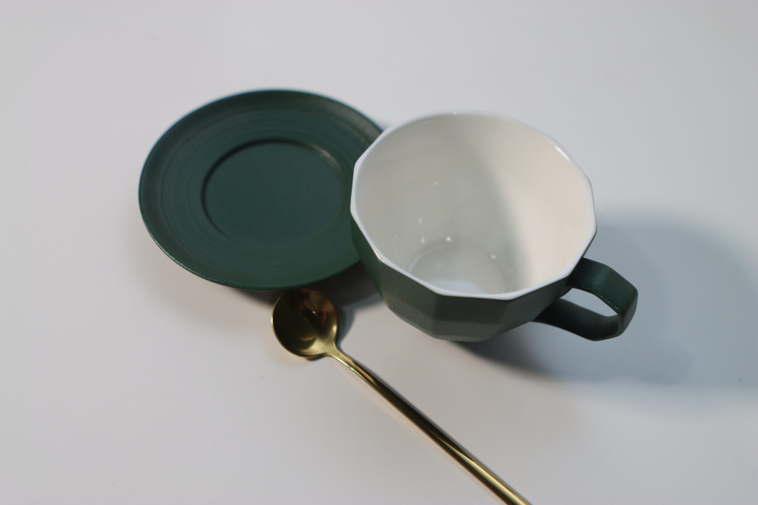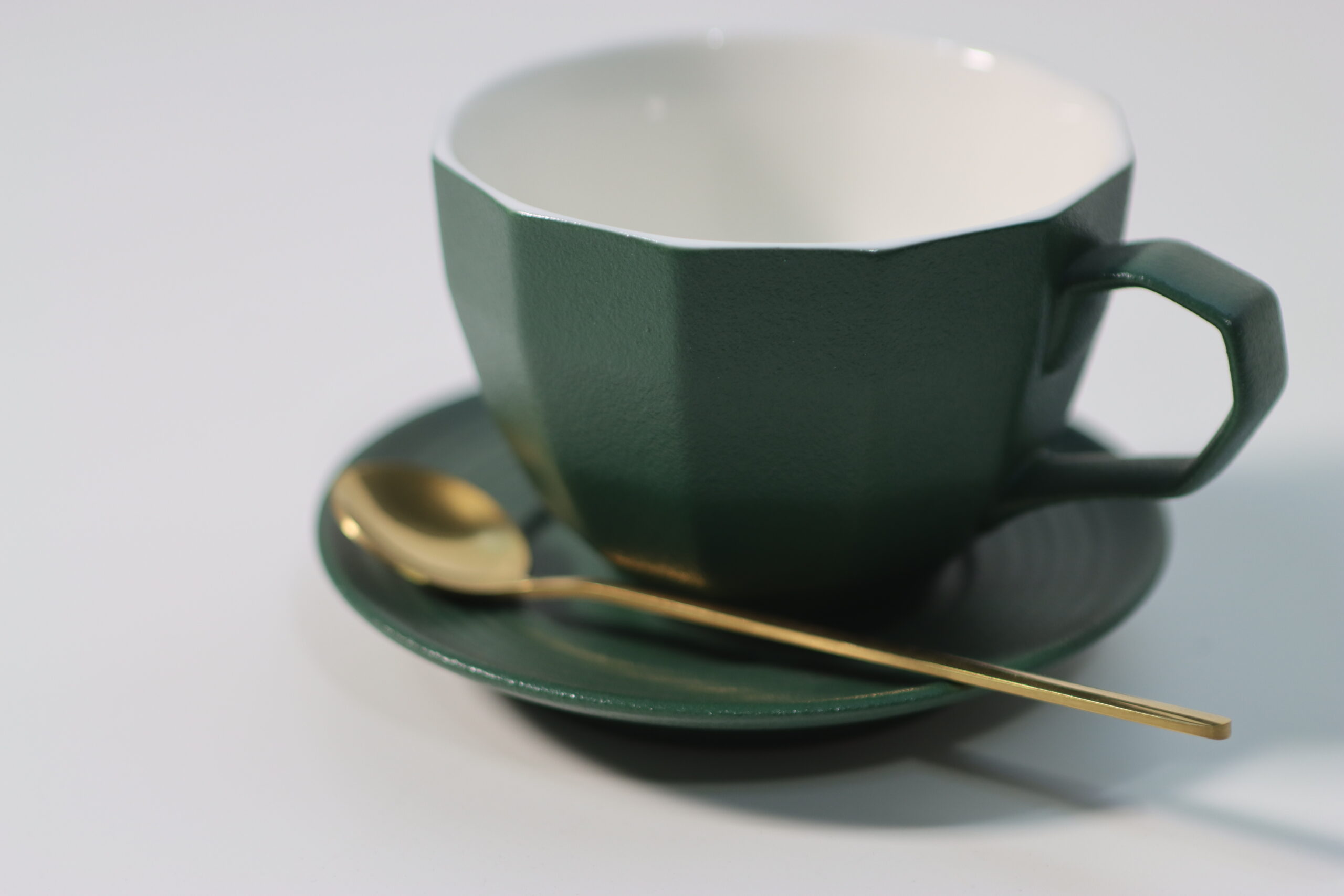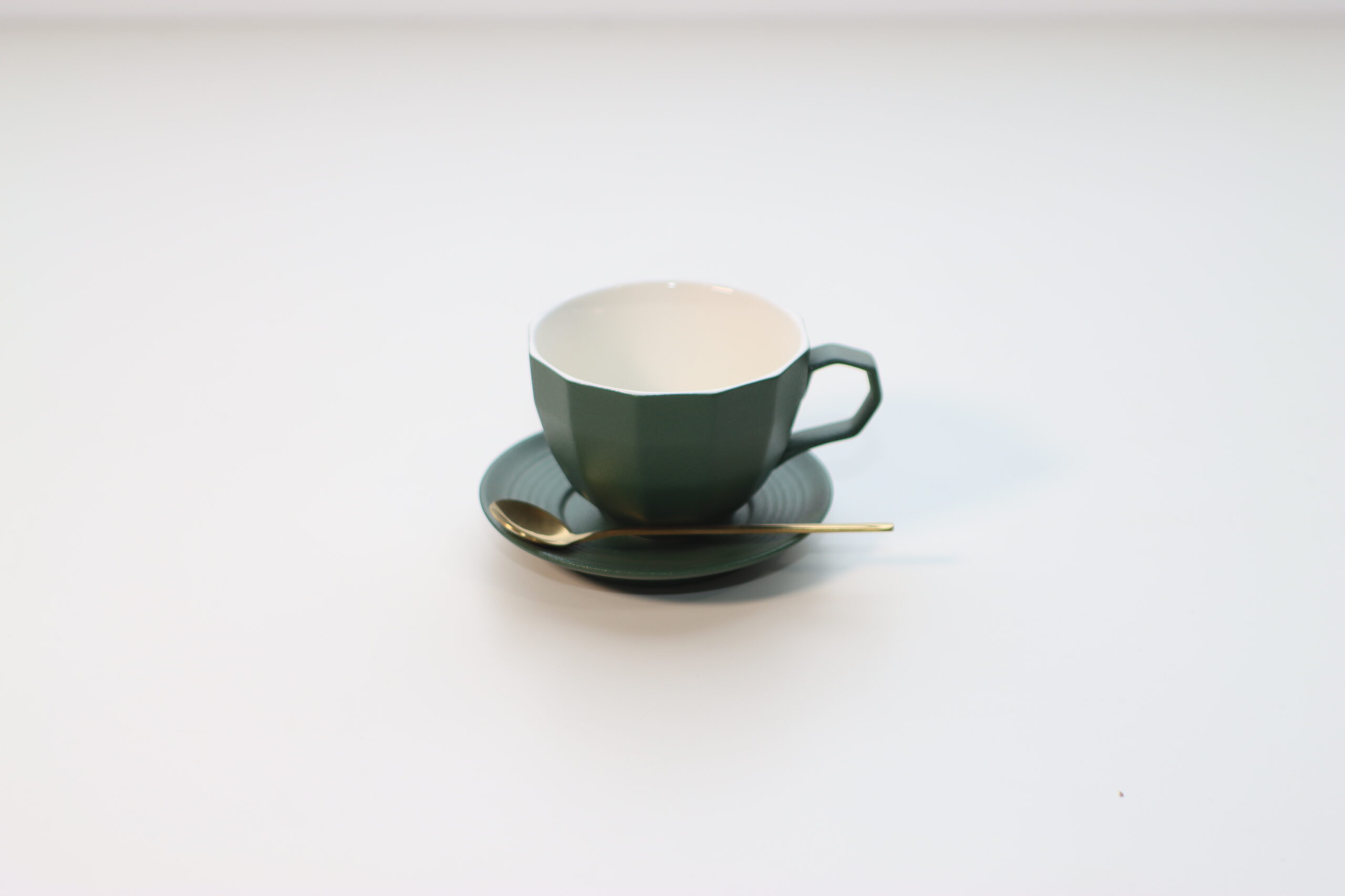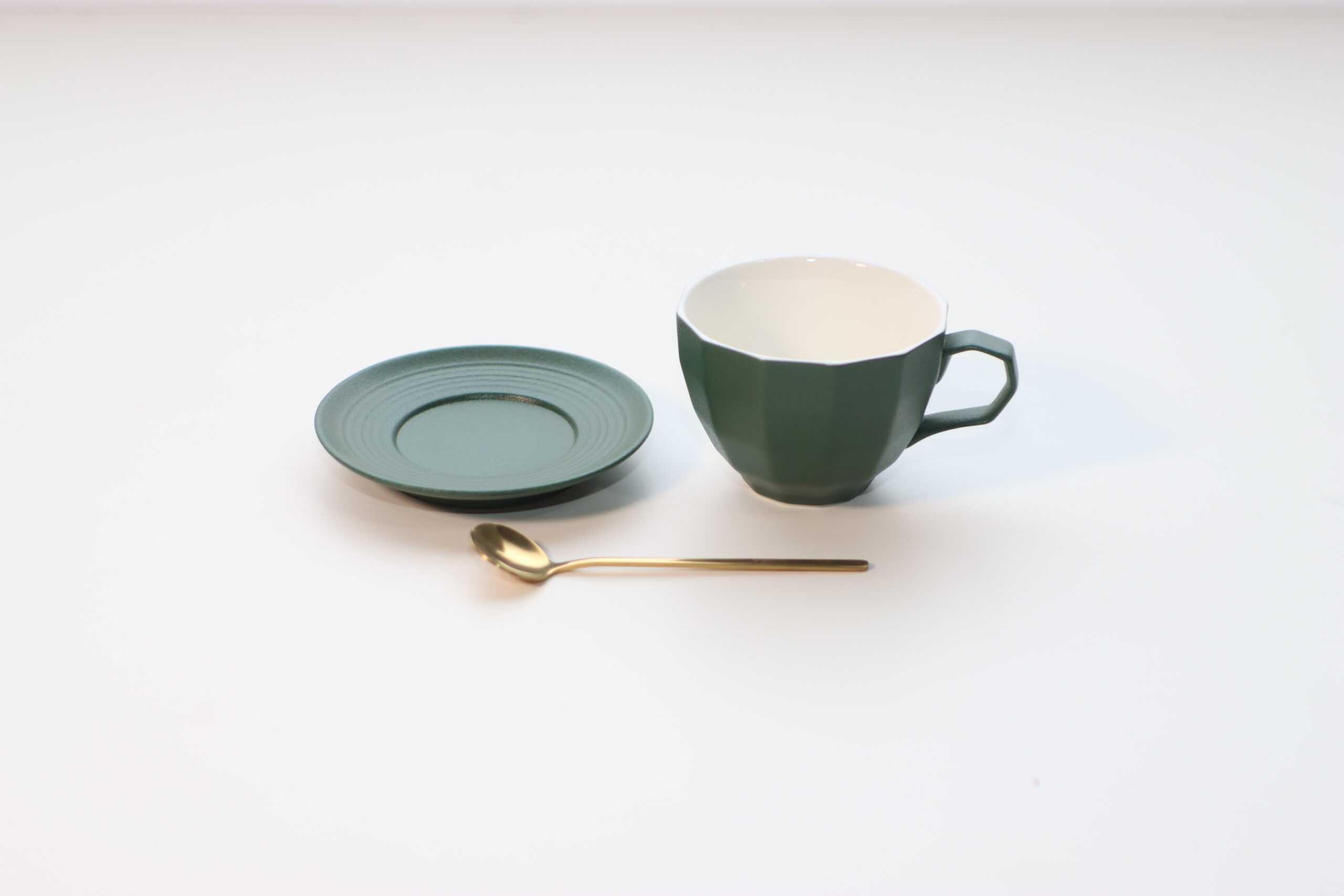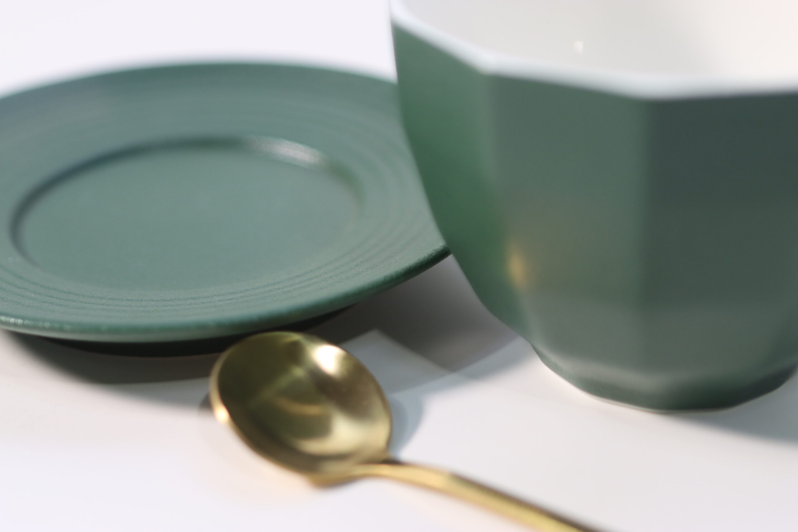 静謐なディープグリーン: 深みのあるグリーンの色彩と、付属するゴールドカラーのスプーンが高級感を演出し、一杯のコーヒーを特別な「体験」へと格上げします。