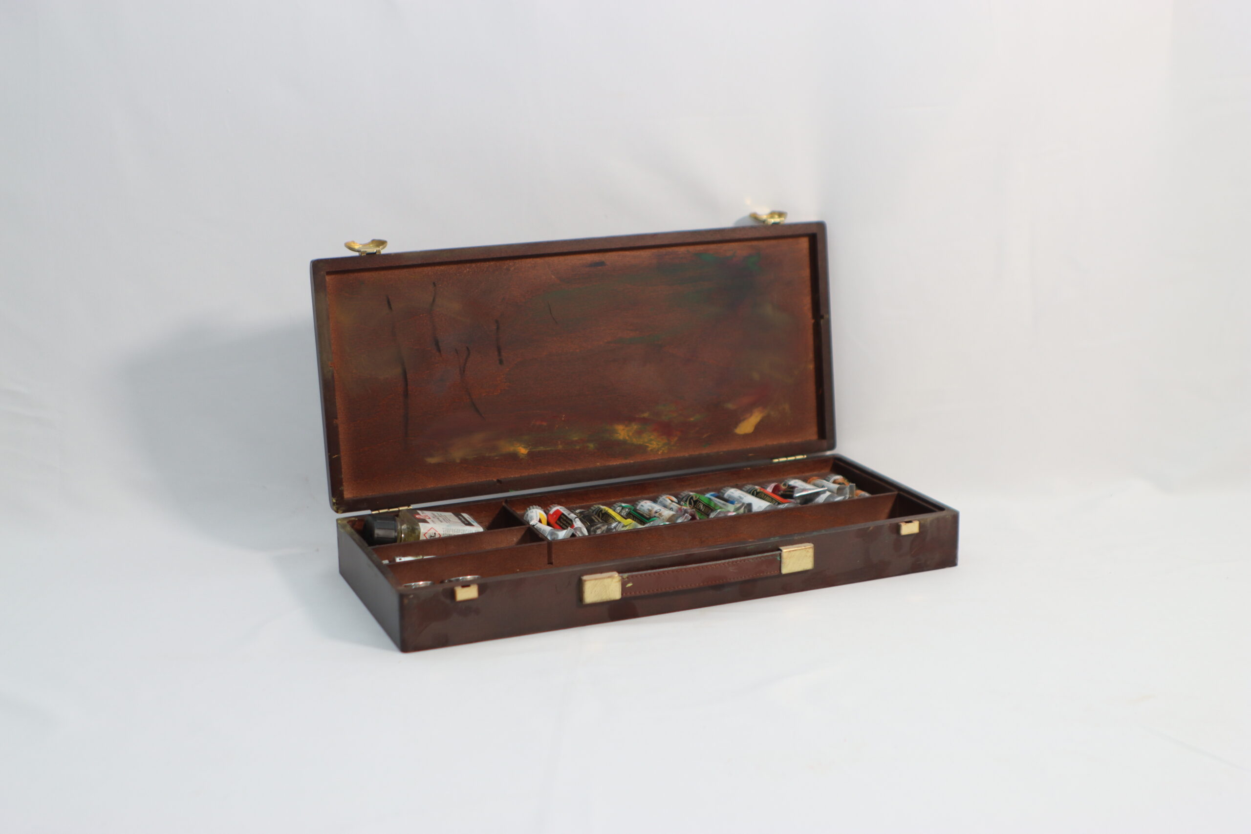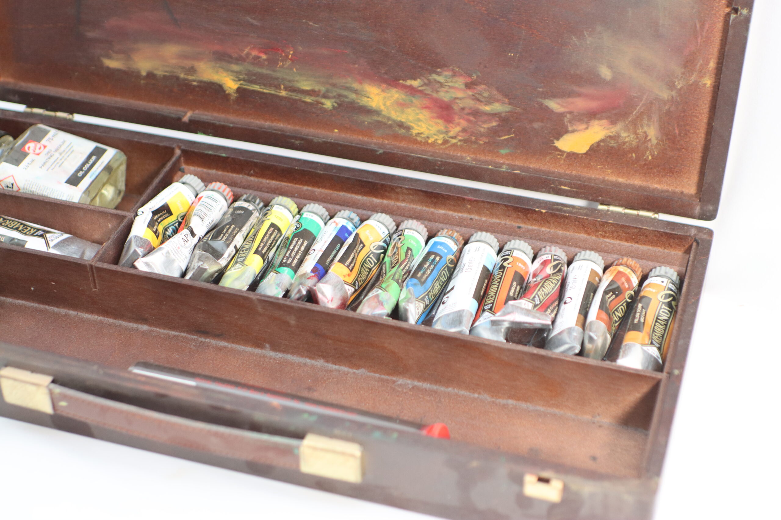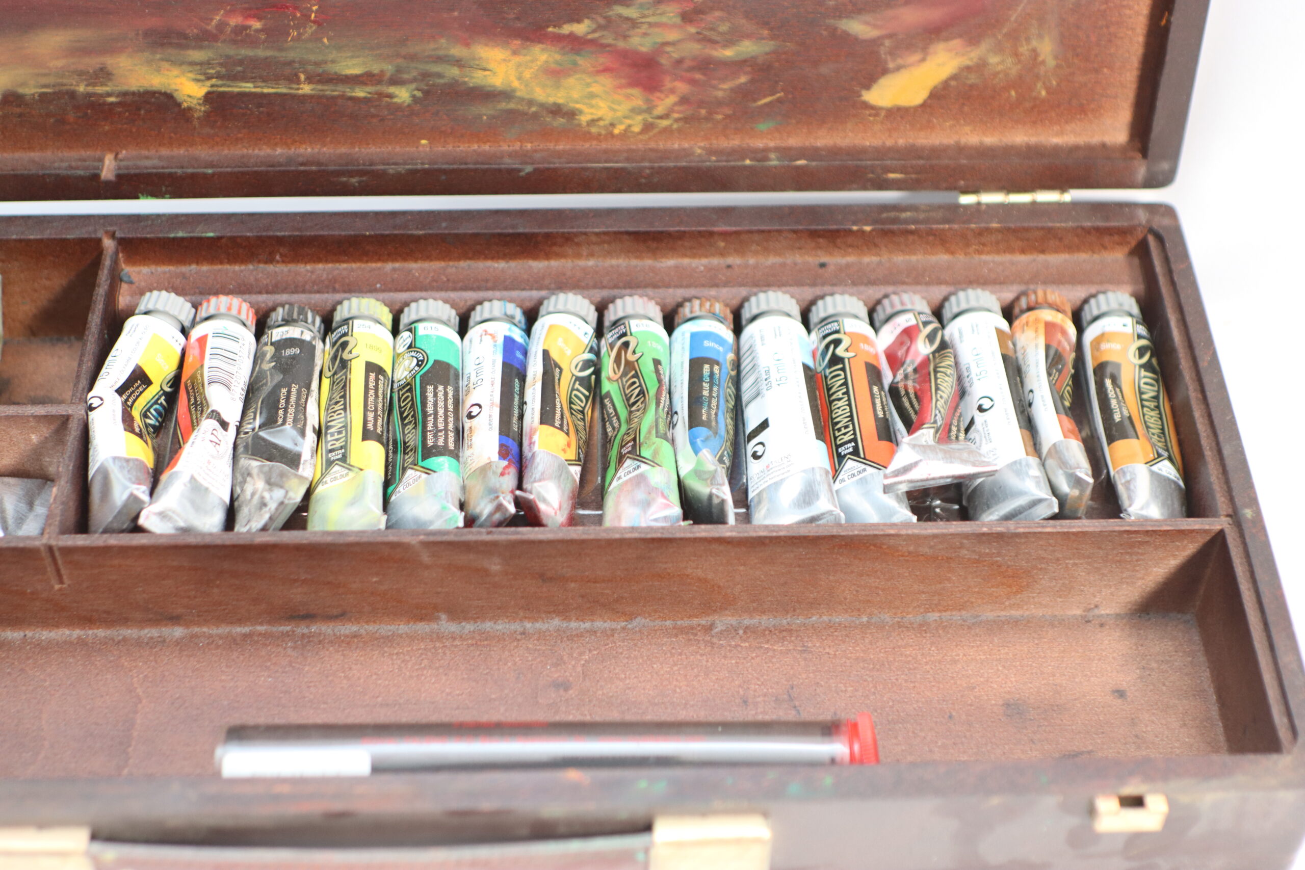 使い込まれた風合いの木製ケースに、色彩豊かなチューブ絵具が収められた本格的なアーティスティック・プロップスです。