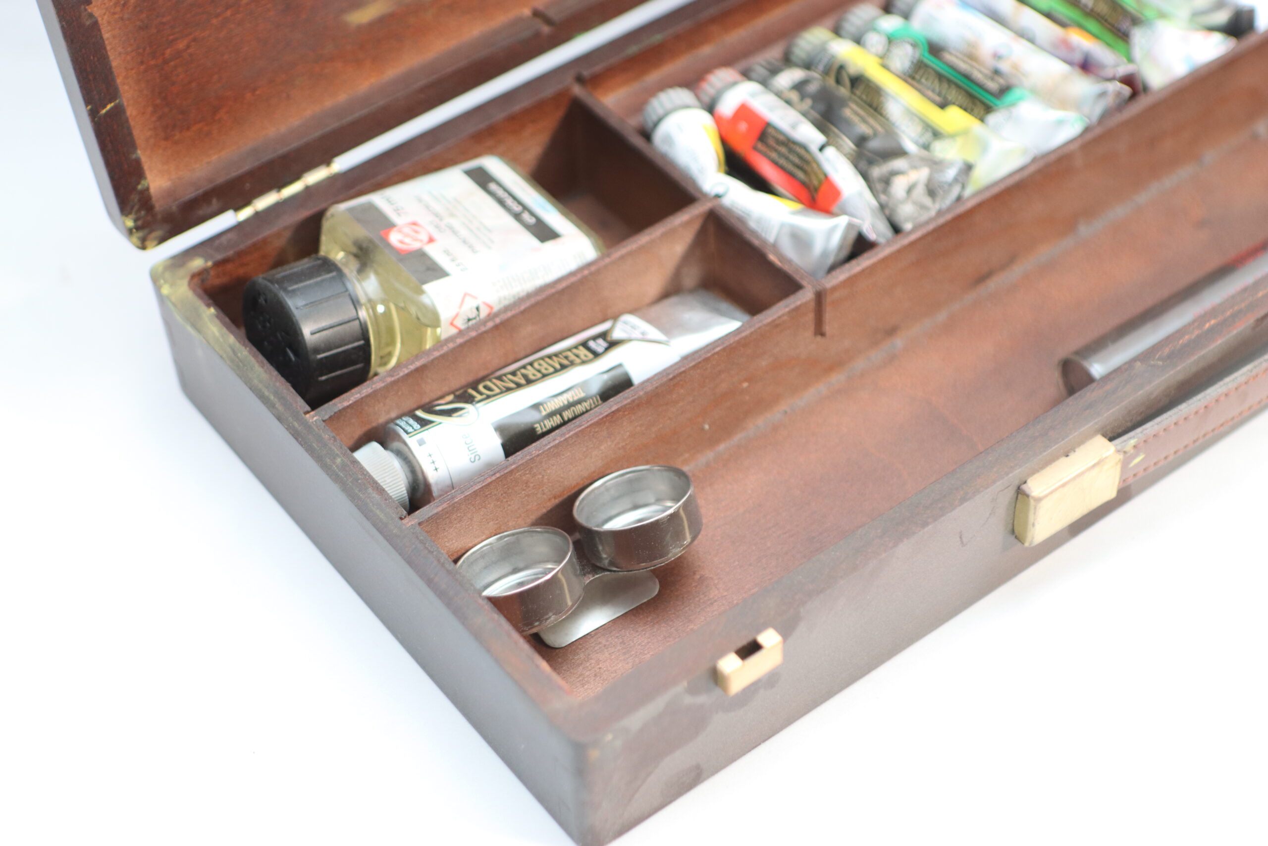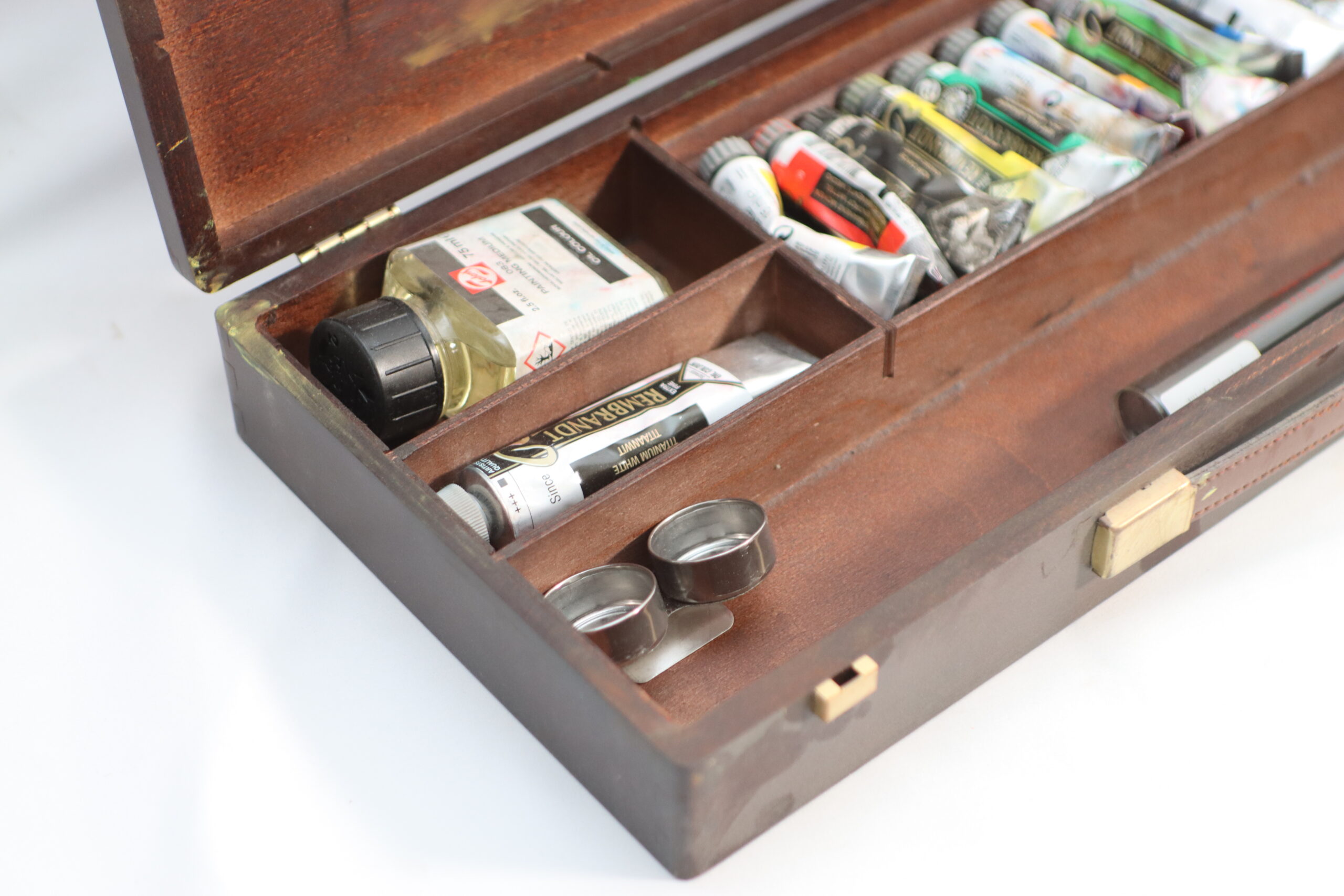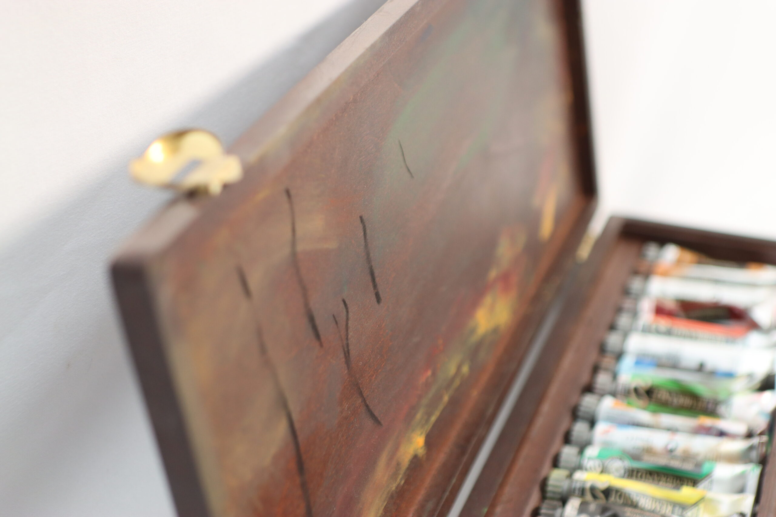 使い込まれた風合いの木製ケースに、色彩豊かなチューブ絵具が収められた本格的なアーティスティック・プロップスです。