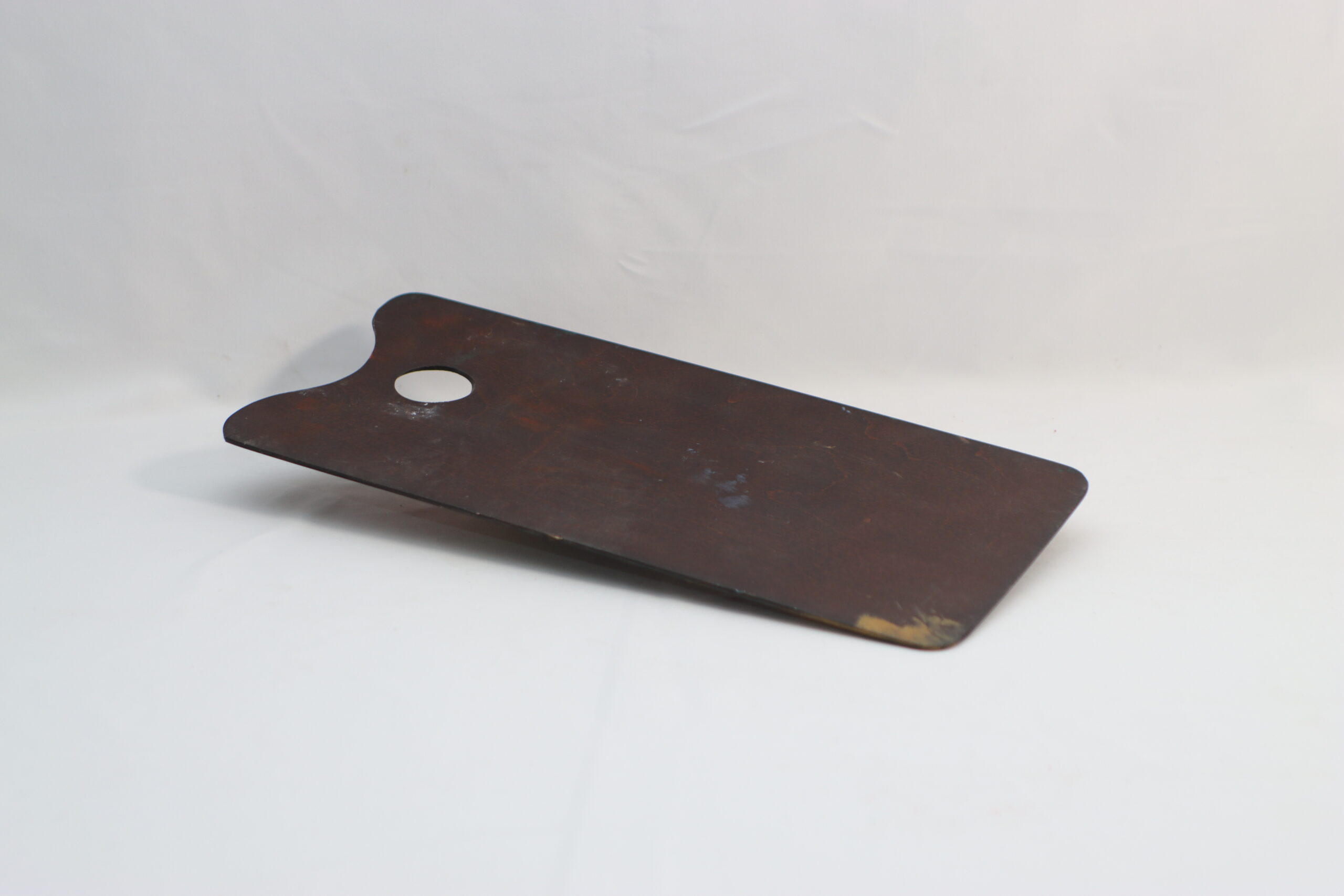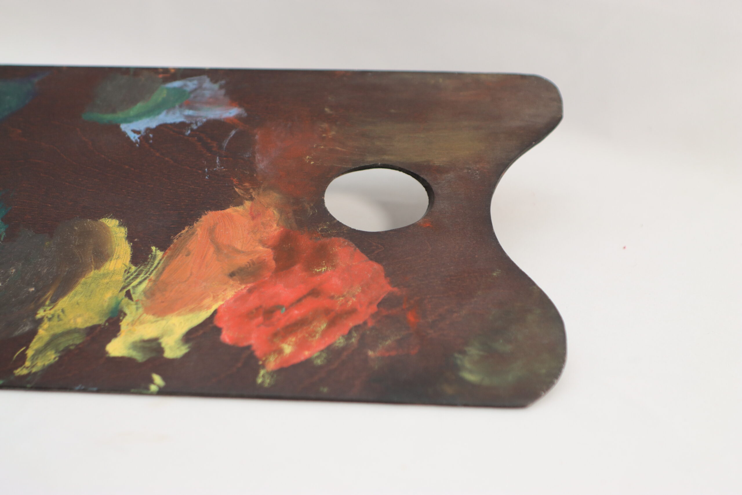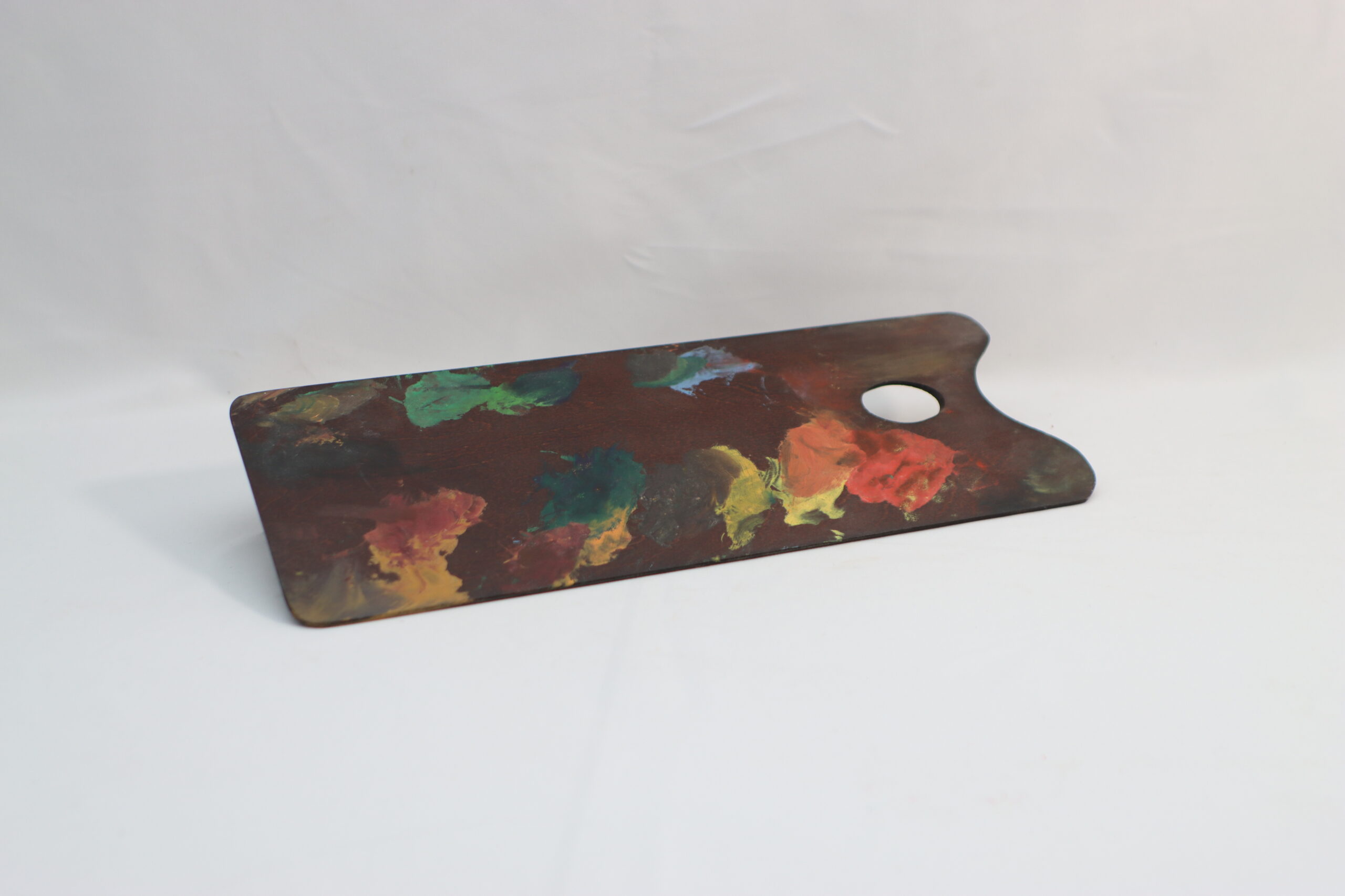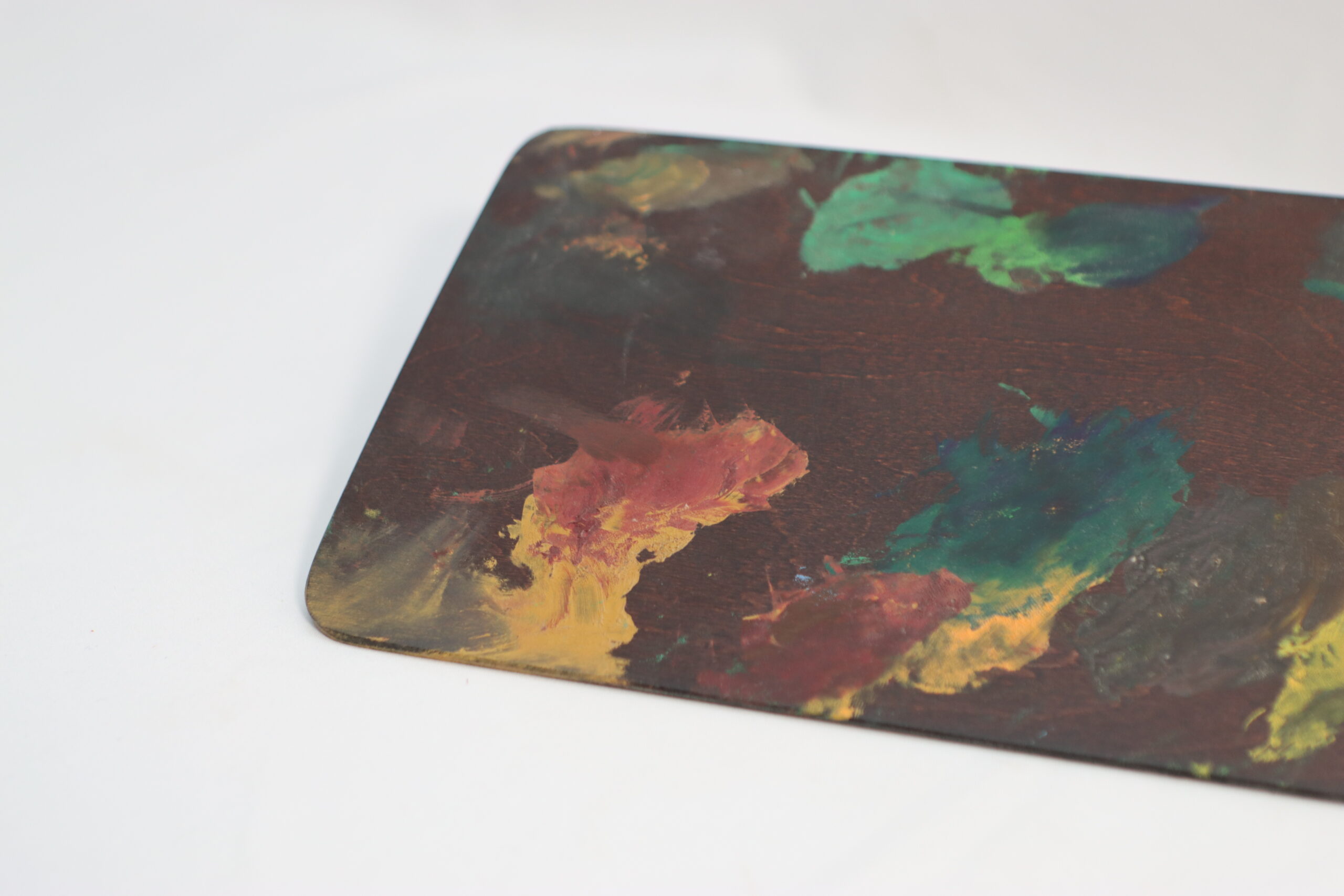 実際に絵具が塗り重ねられた、力強い使用痕が残る木製の大型パレットです。