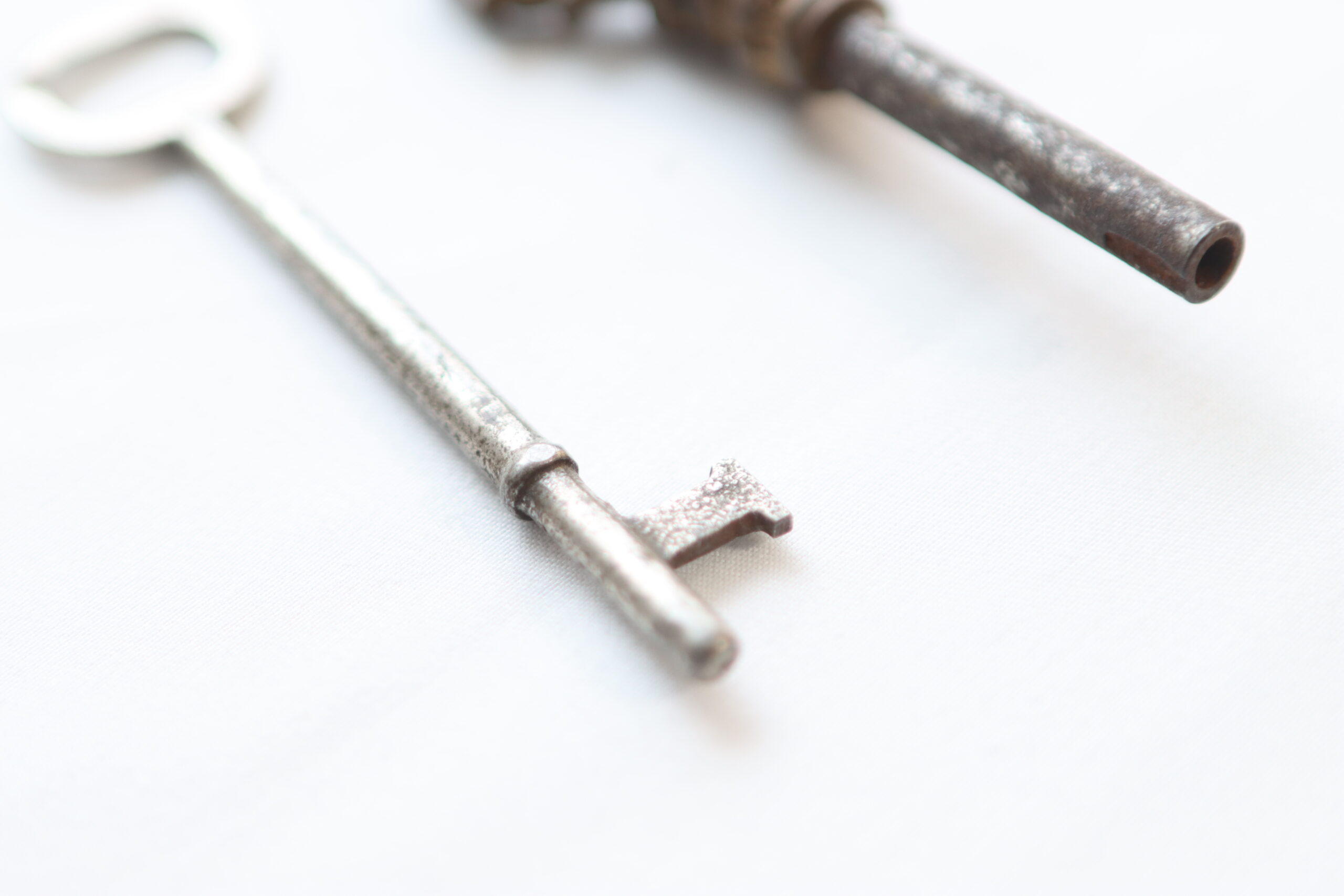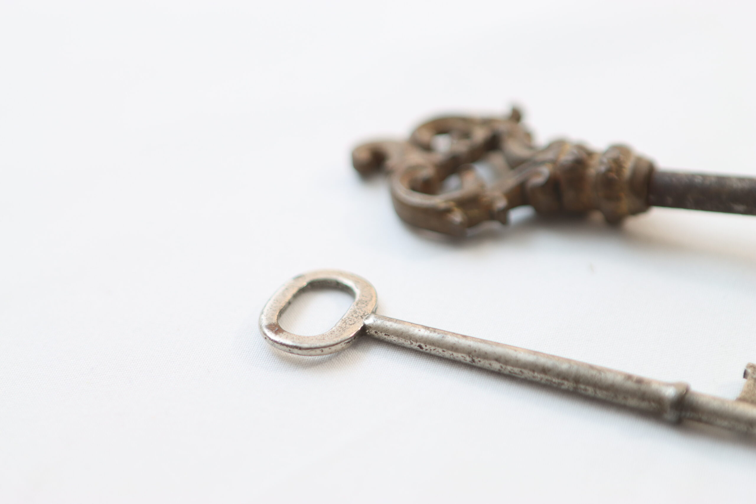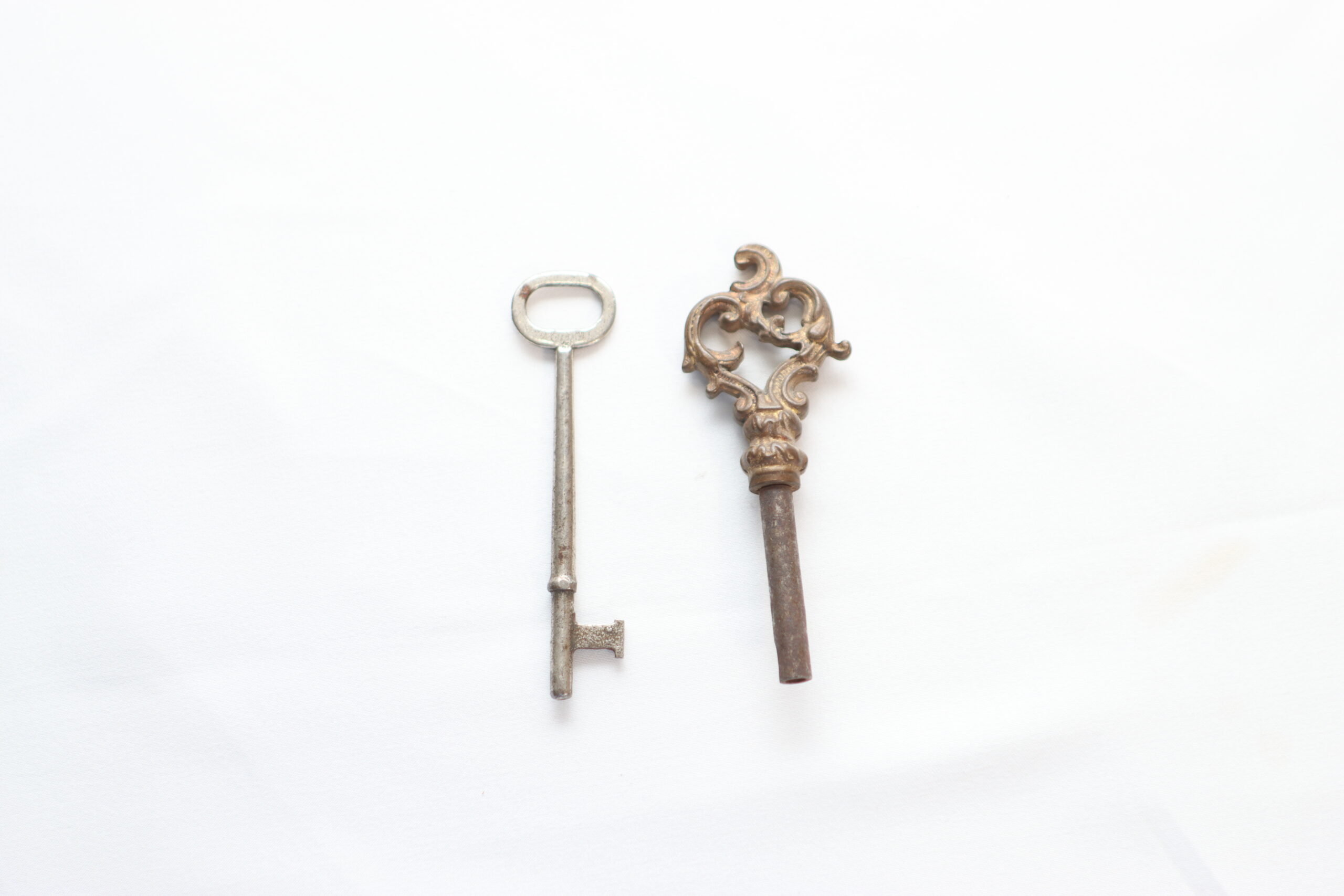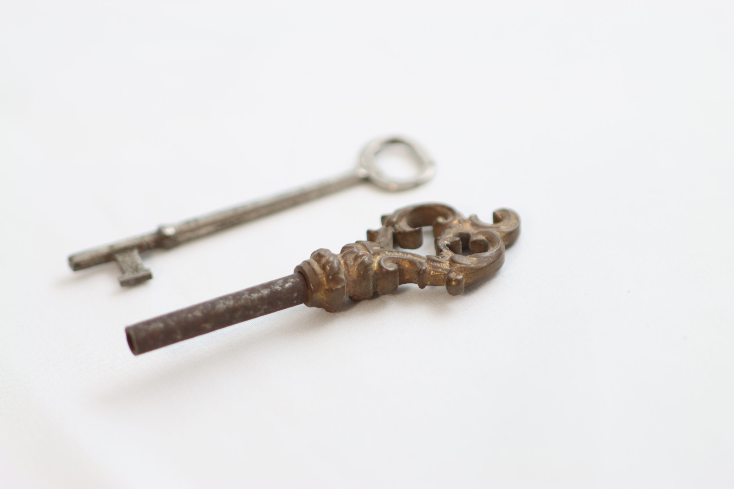 装飾性の高い意匠鍵と、無骨で実用寄りの鍵を組み合わせたアンティークキー。