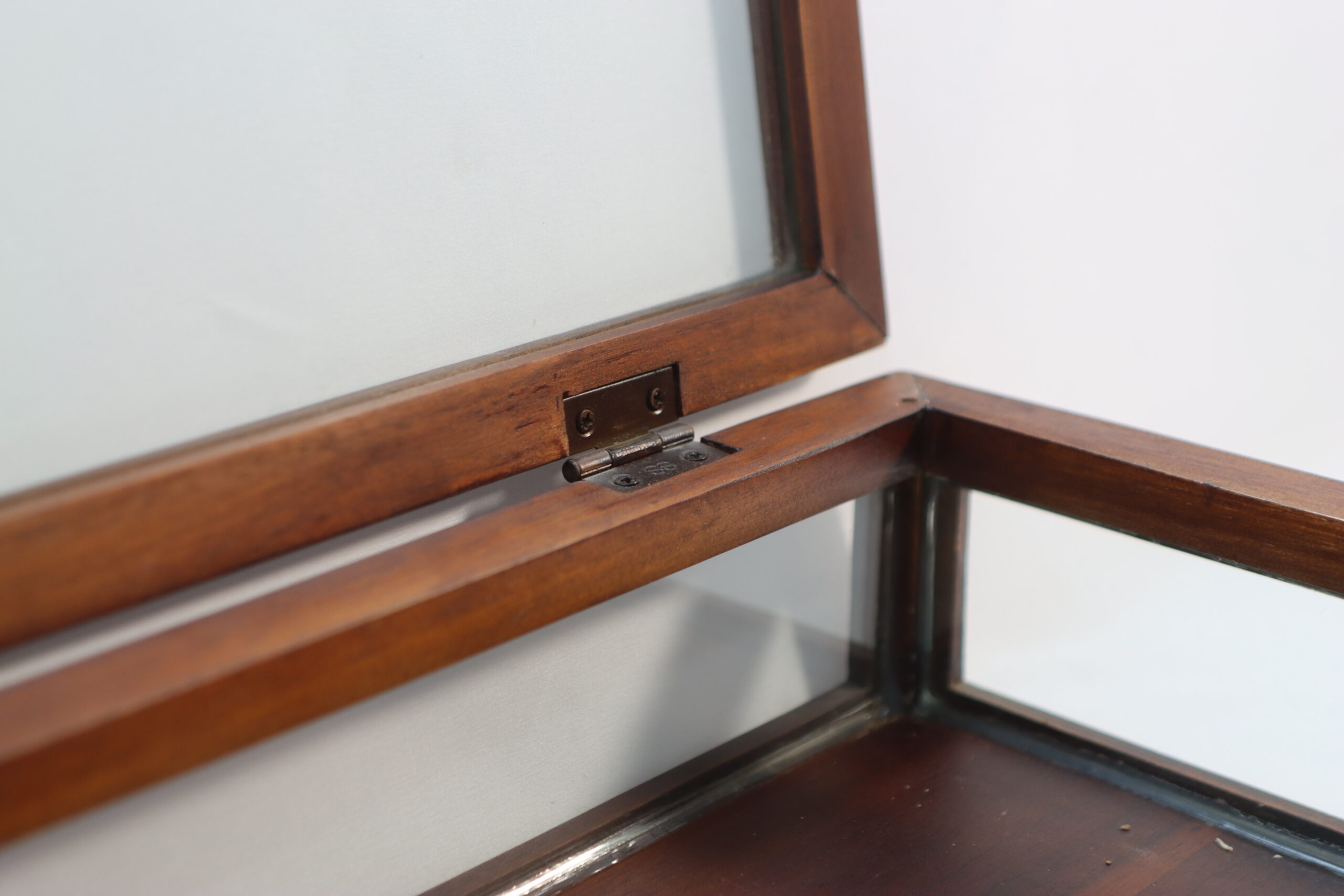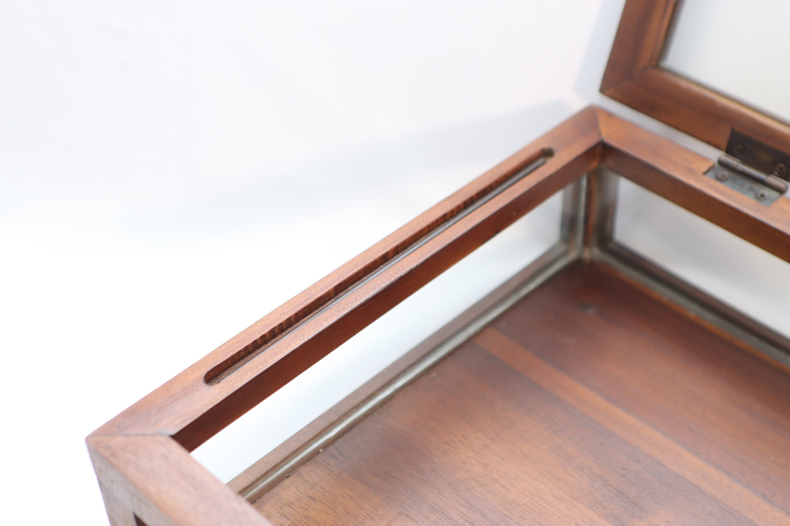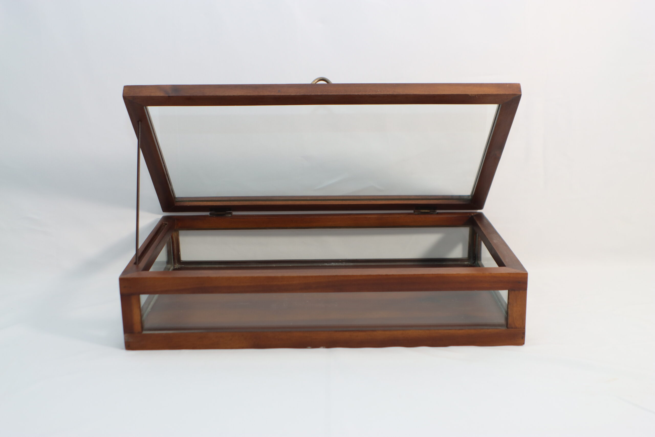 「複数のアイテムを一つの『世界観』としてまとめ上げる、横幅のある卓上ショーケースです。 落ち着いたダークトーンの木枠と、前面・天板・側面がガラスで構成されたデザインにより、圧迫感を与えずに高級感のある陳列空間を作り出します。