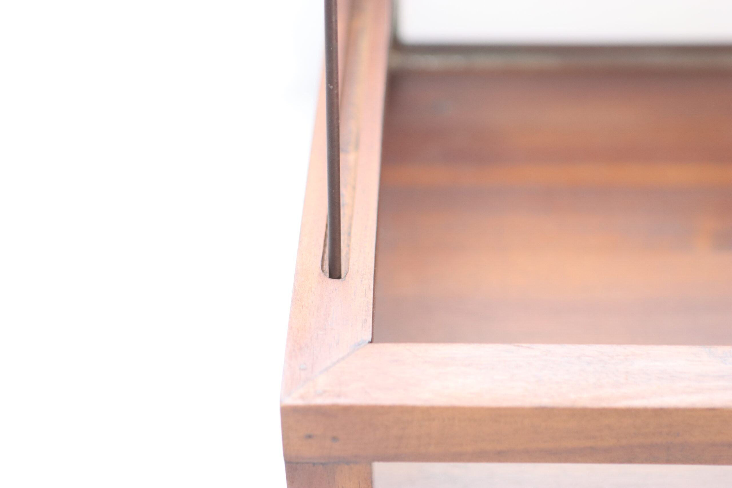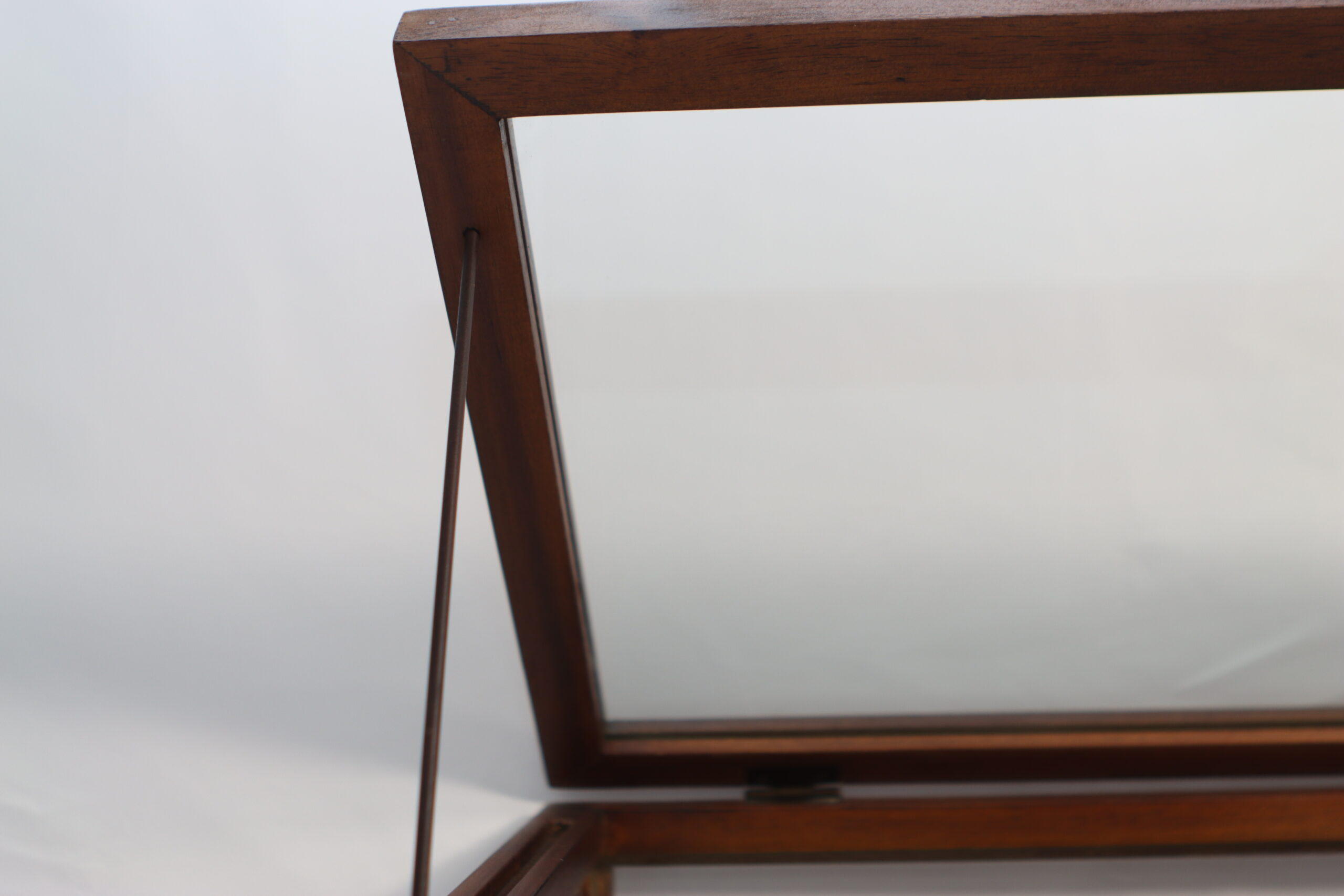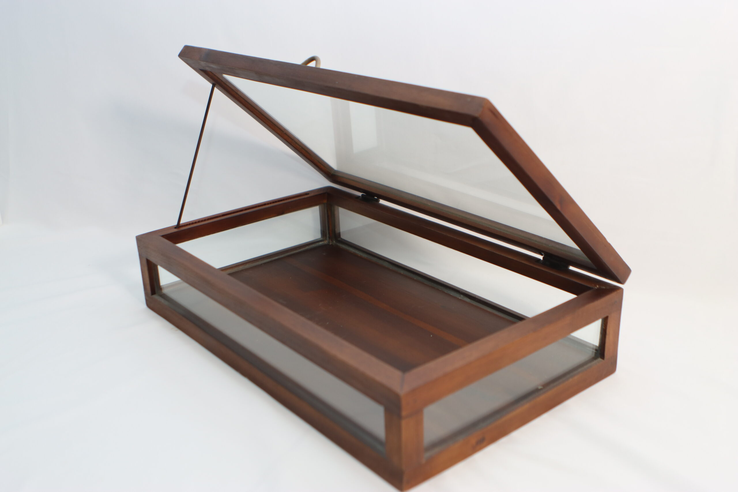 「複数のアイテムを一つの『世界観』としてまとめ上げる、横幅のある卓上ショーケースです。 落ち着いたダークトーンの木枠と、前面・天板・側面がガラスで構成されたデザインにより、圧迫感を与えずに高級感のある陳列空間を作り出します。