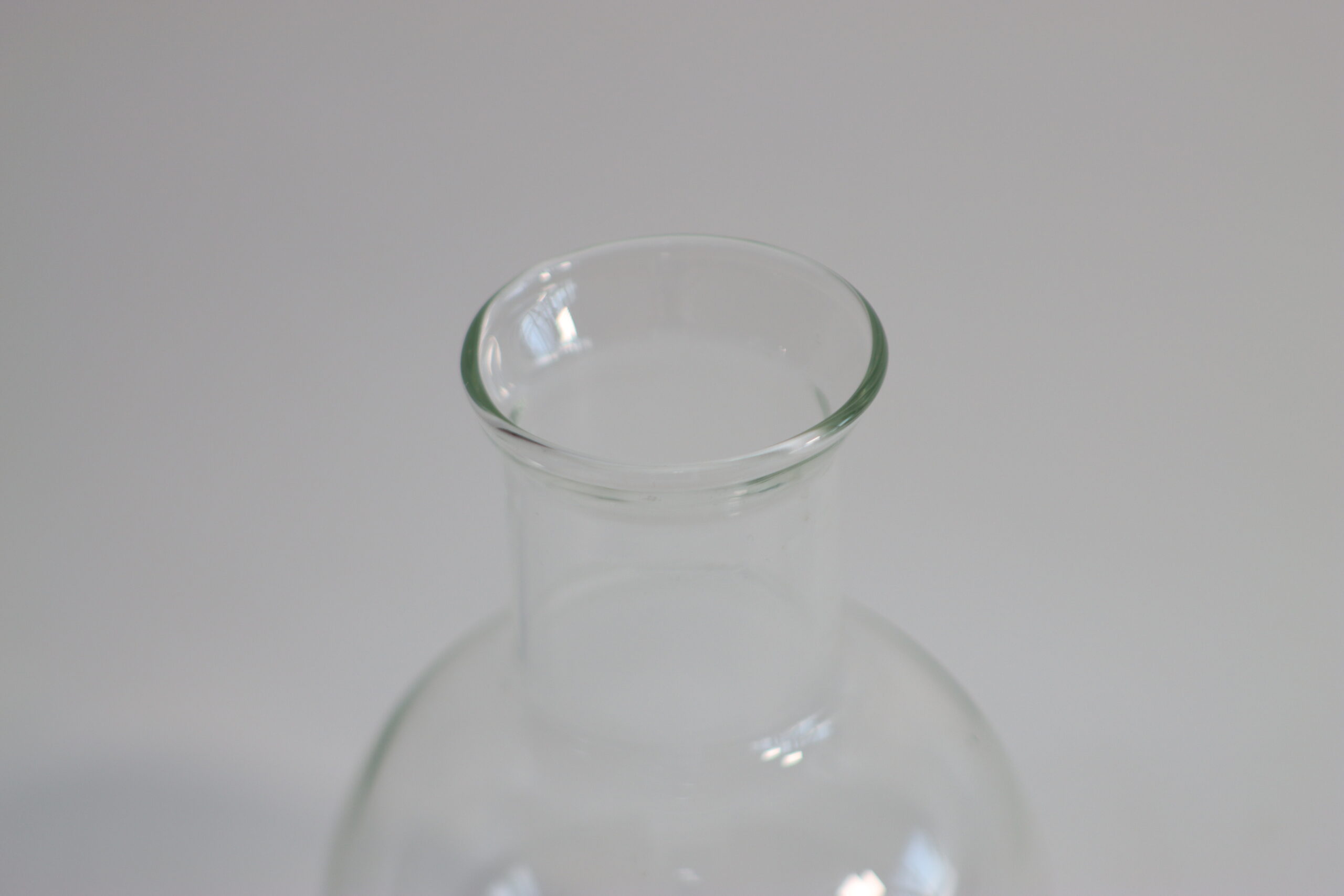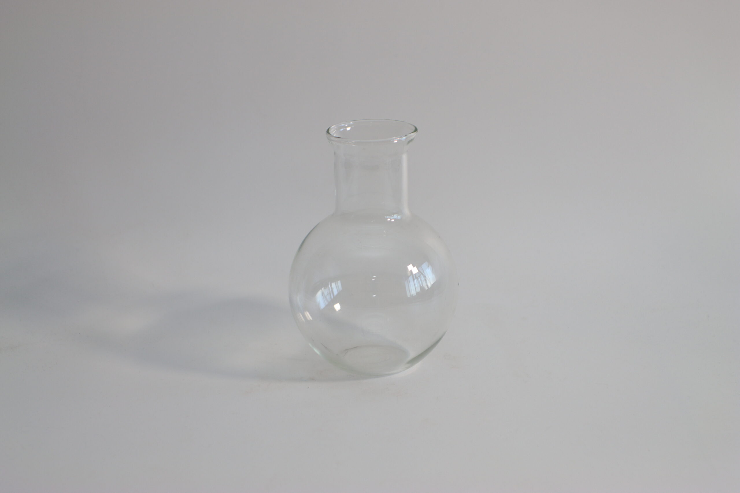 丸みのあるワイドな胴体が特徴的な、ラボガラスのフラスコ型オブジェ。