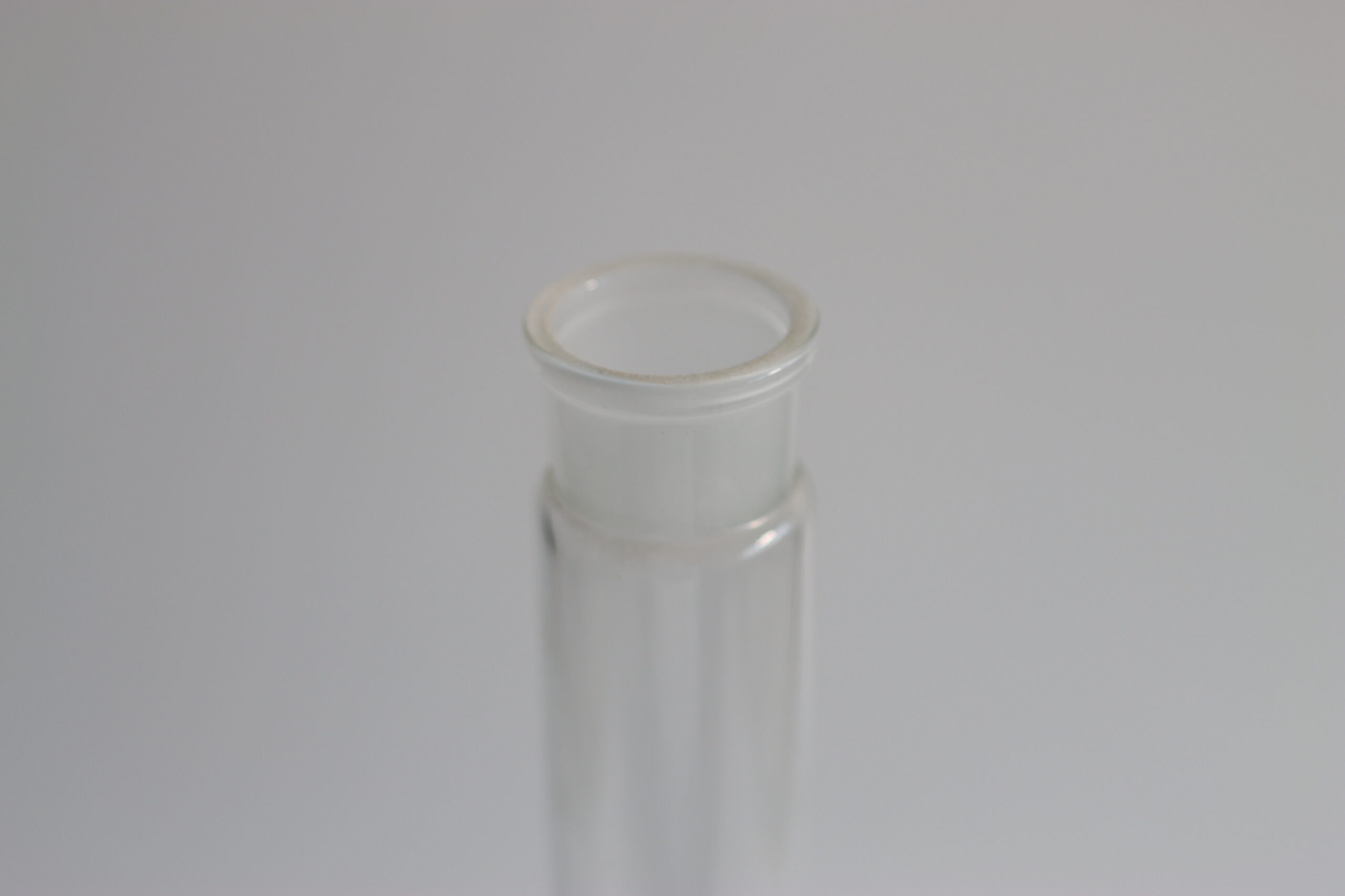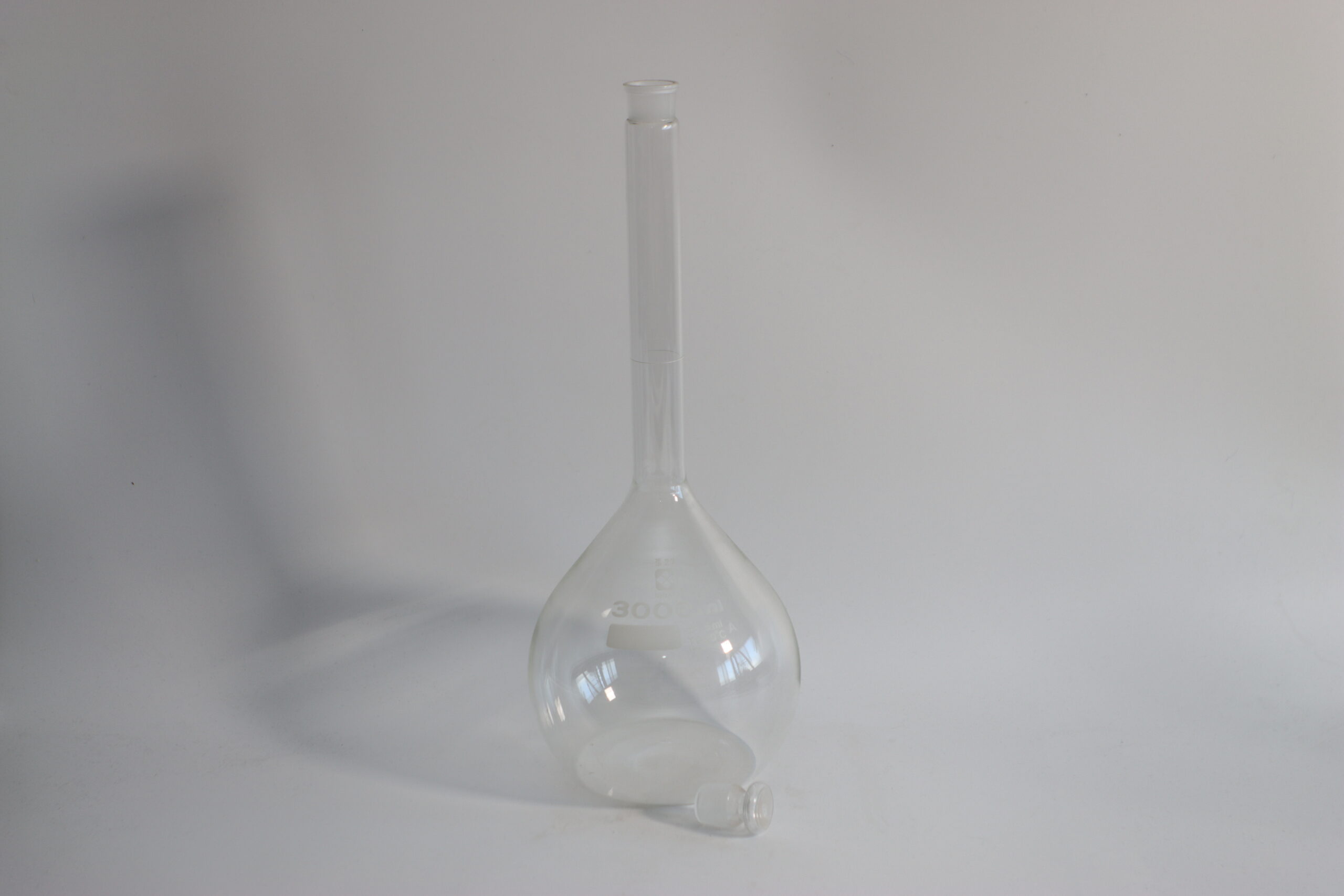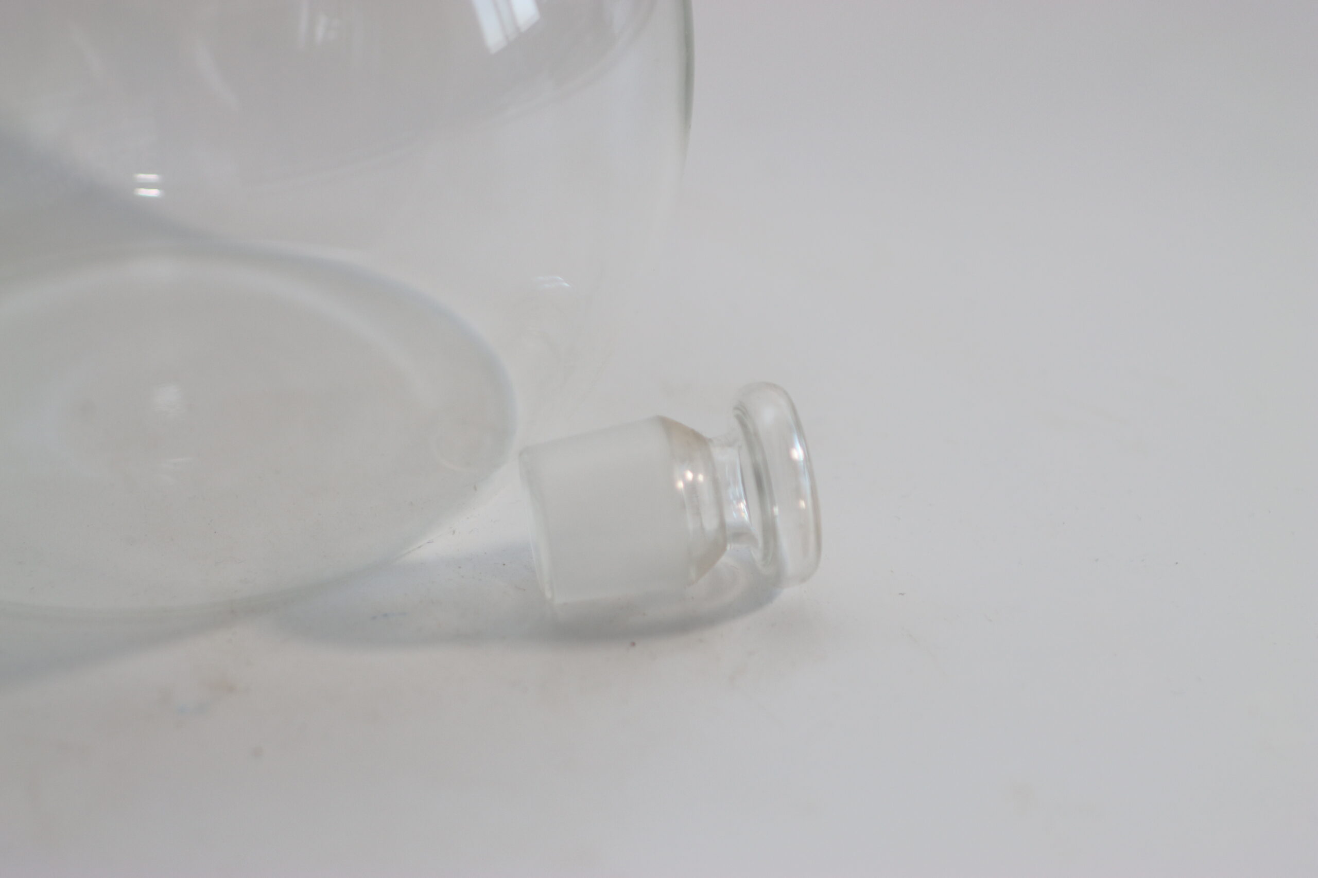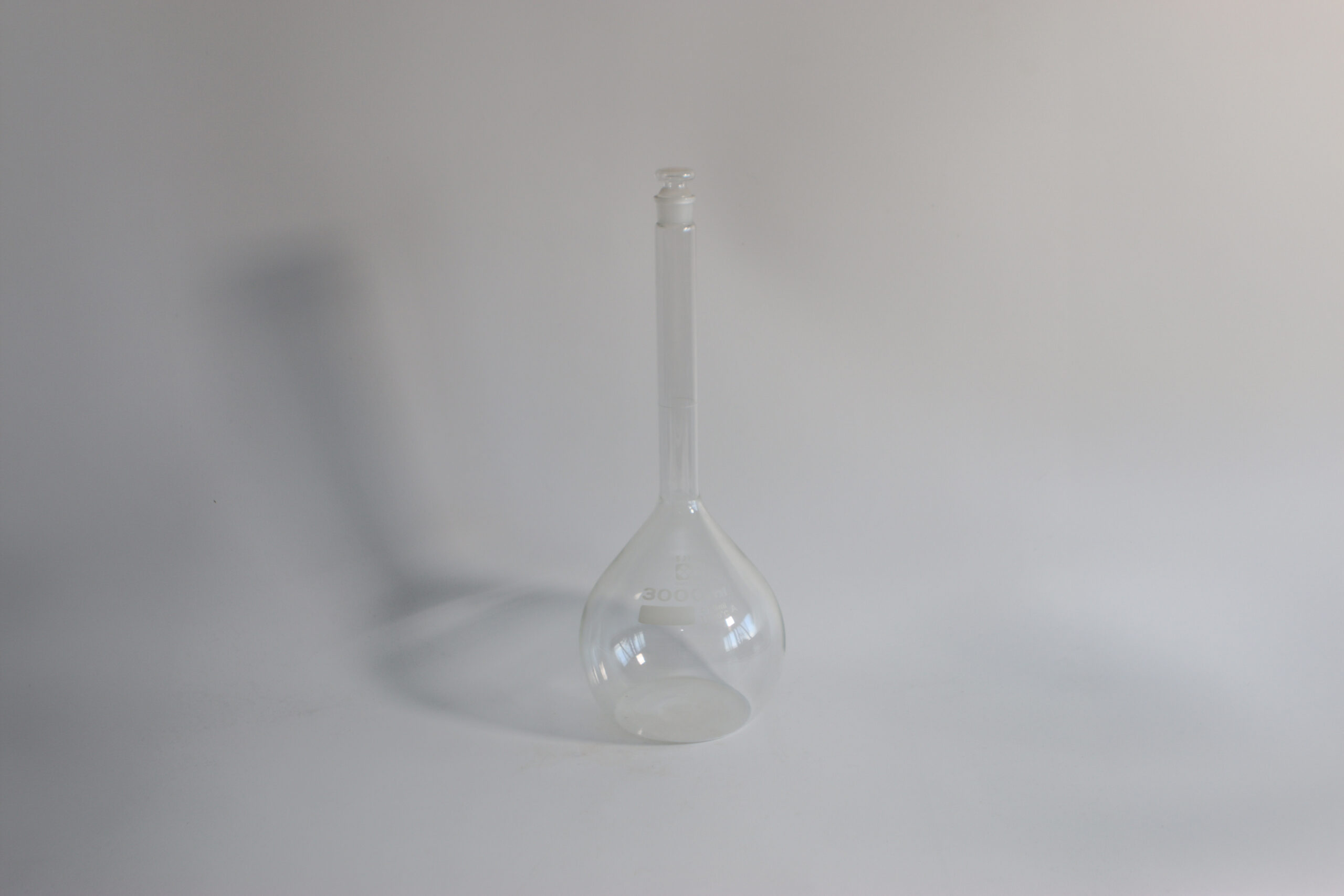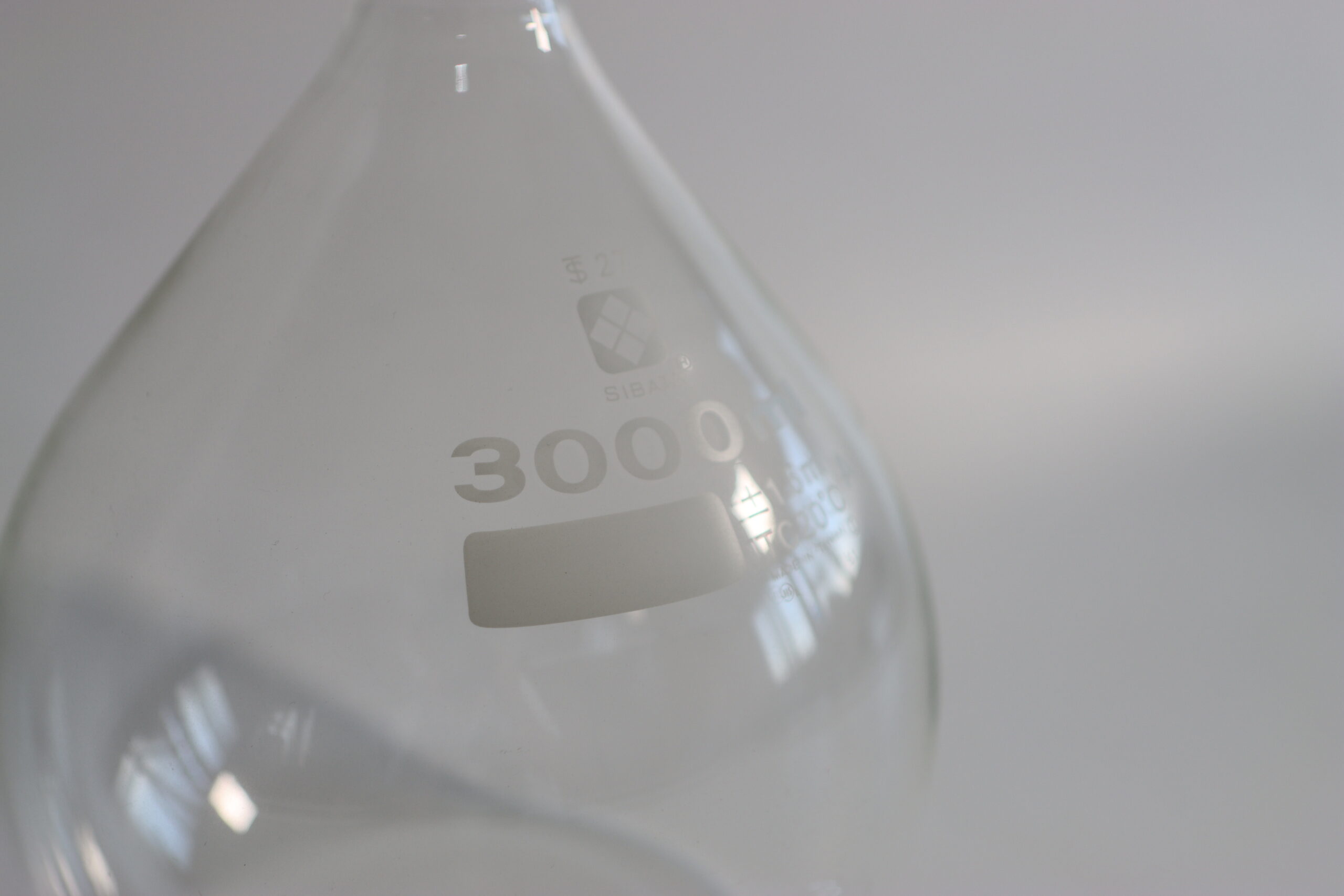 しずくのような有機的フォルムが印象的な、ラボガラスのフラスコ型オブジェ。