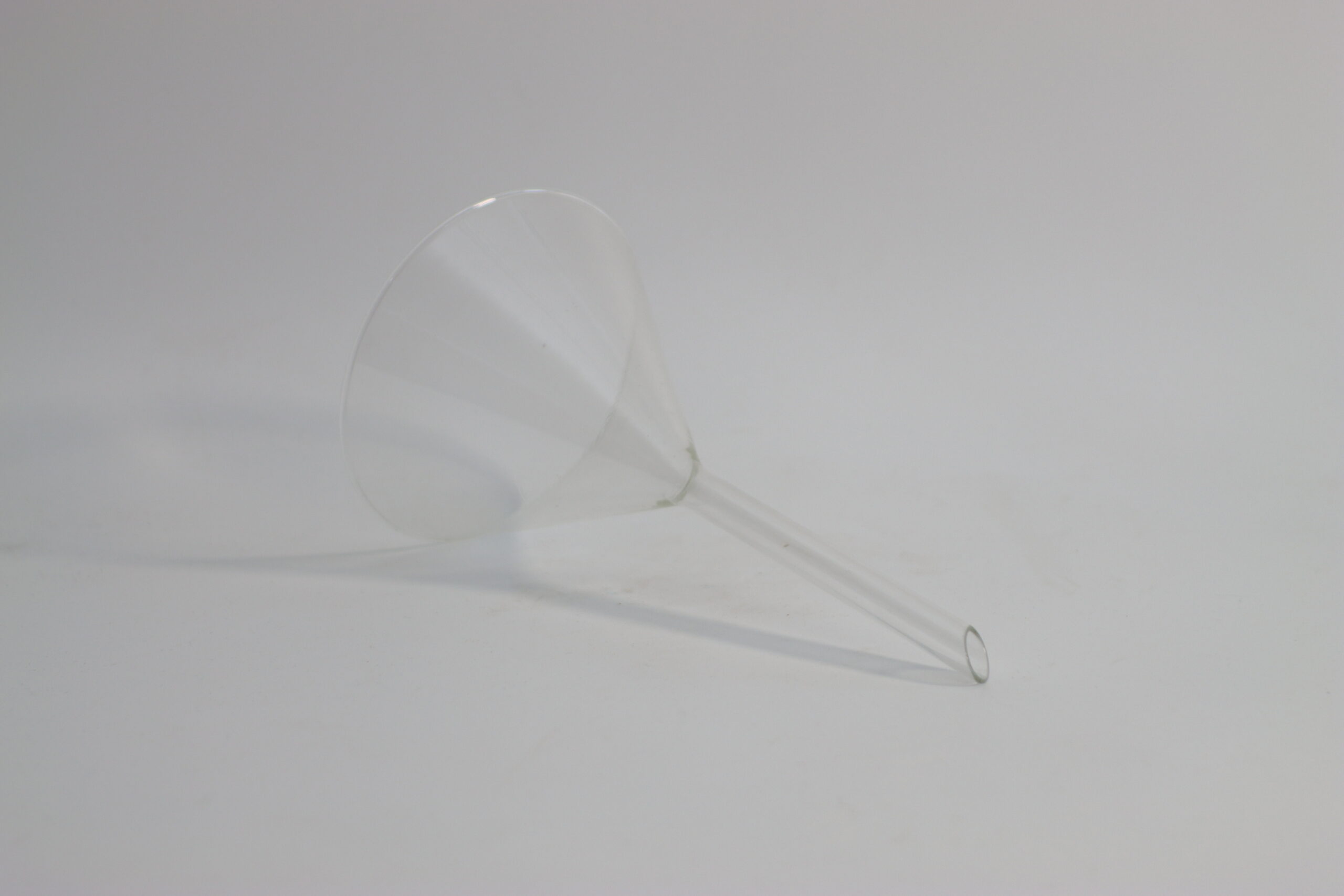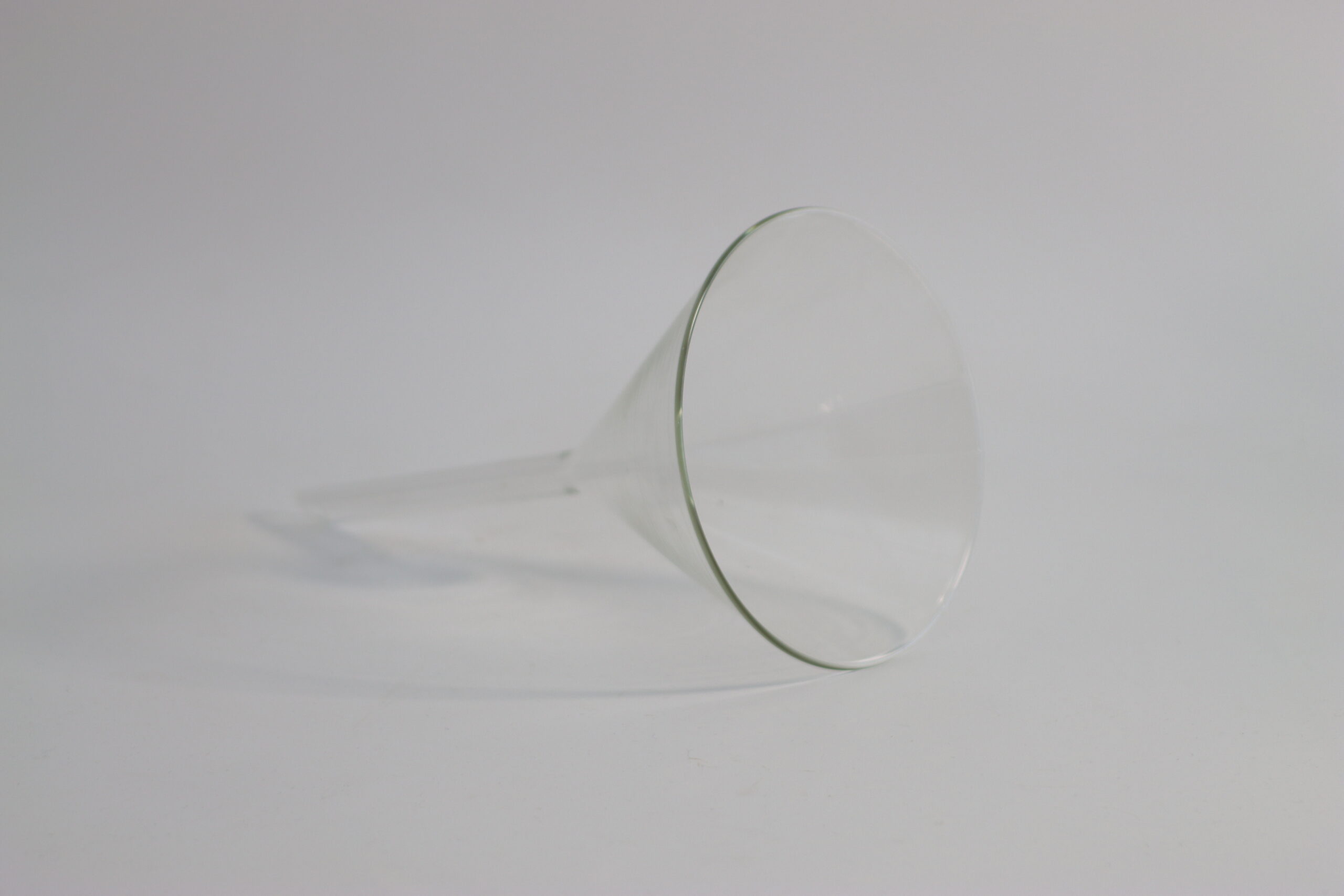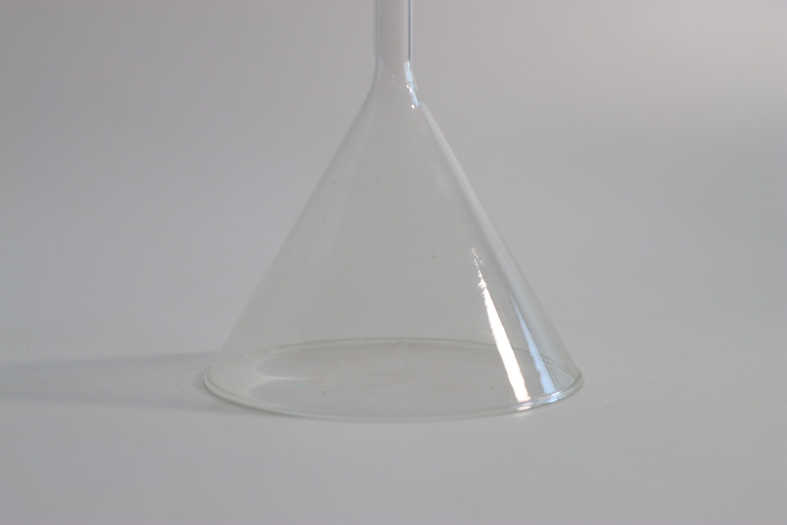 円錐形のボディに細いステム(管)が伸びた、ガラス製のロート。
