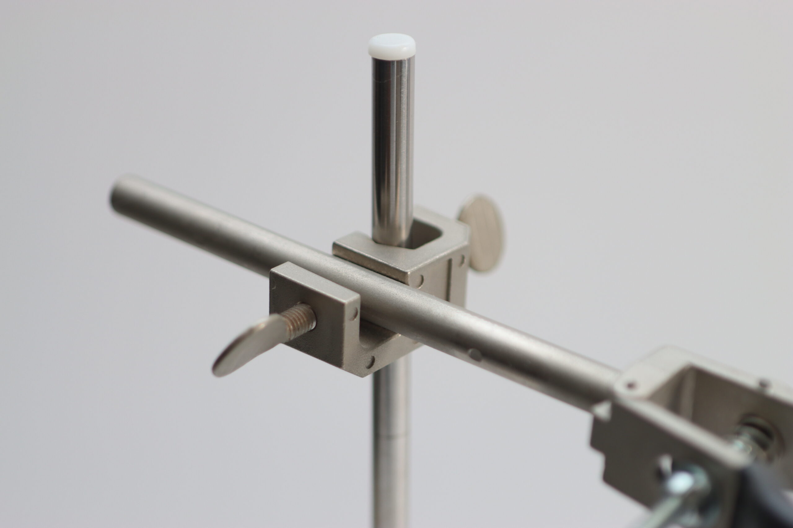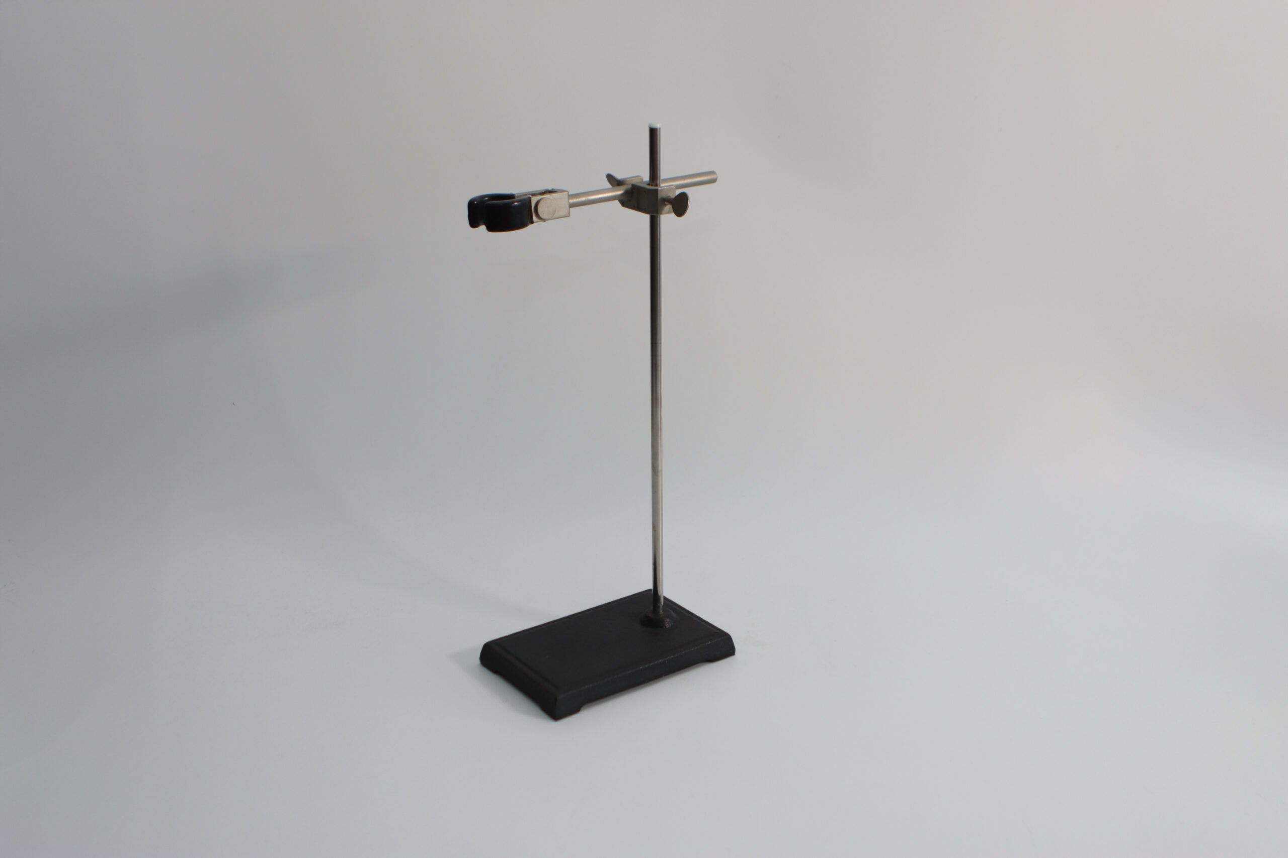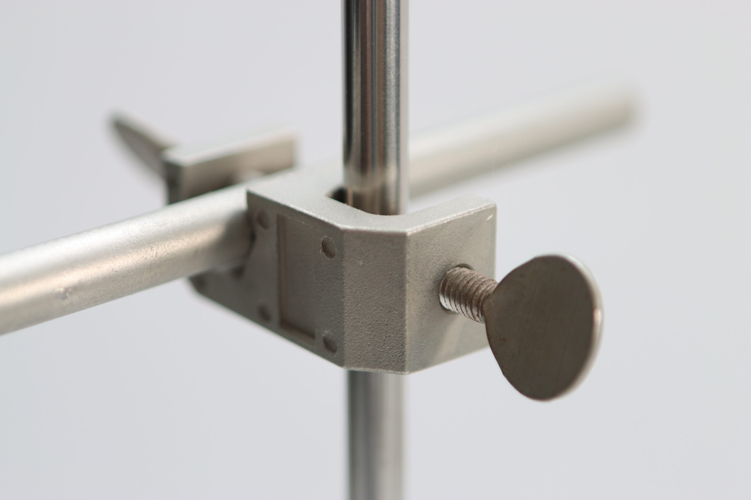 金属製の支柱と横バー、クランプ機構を備えたラボ用スタンド。
