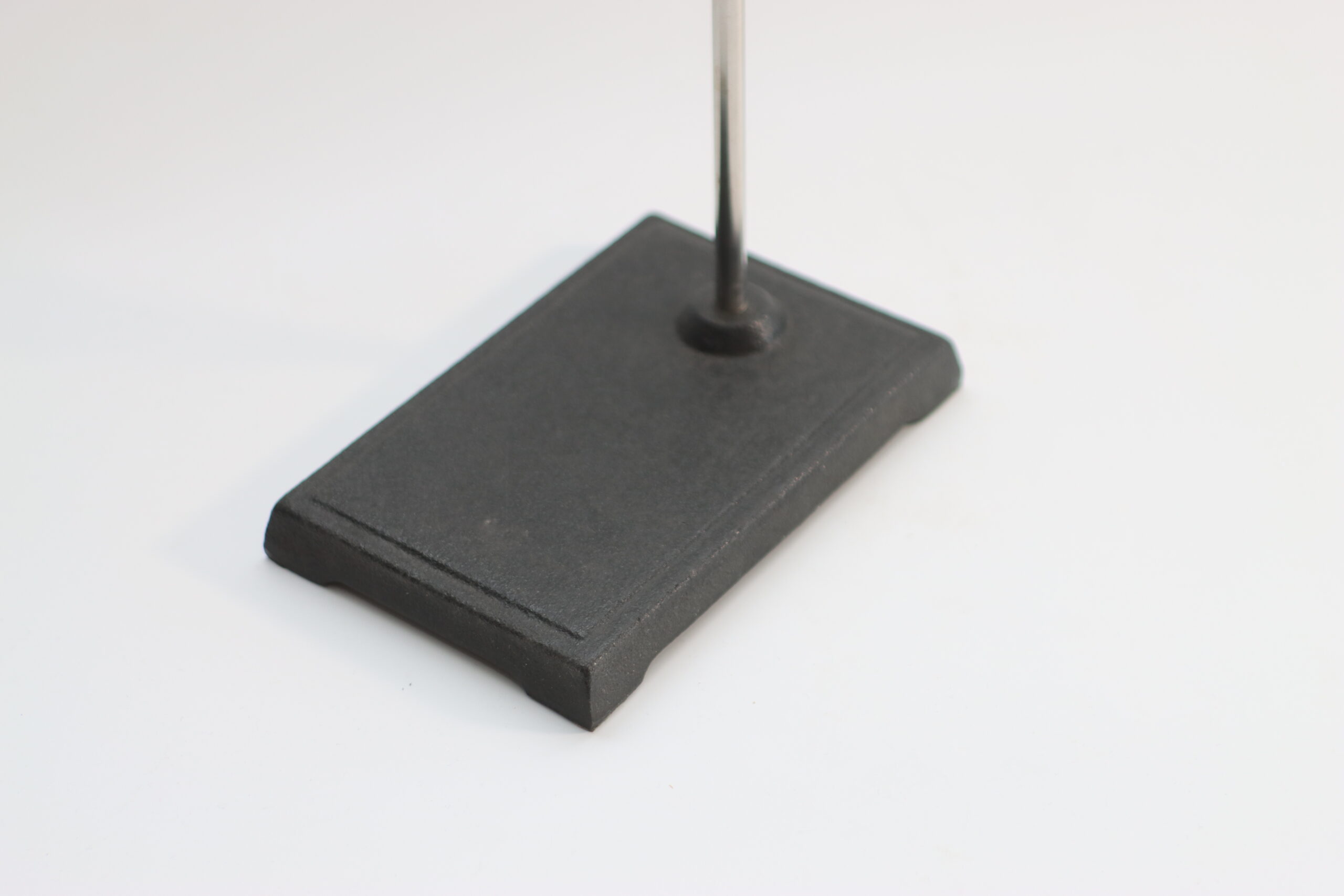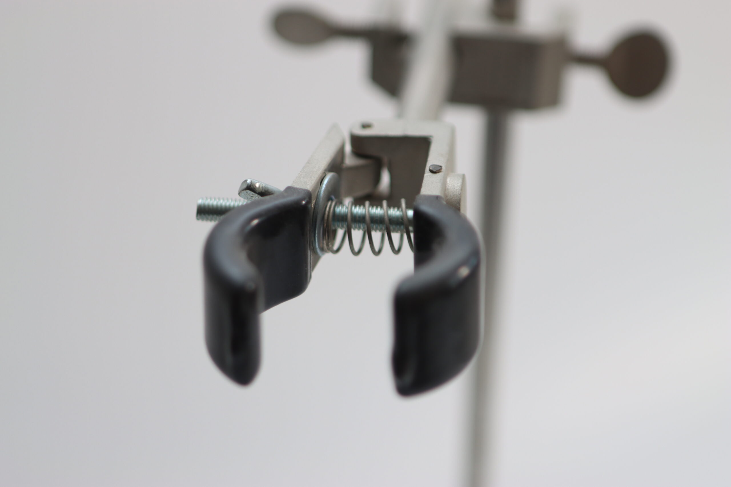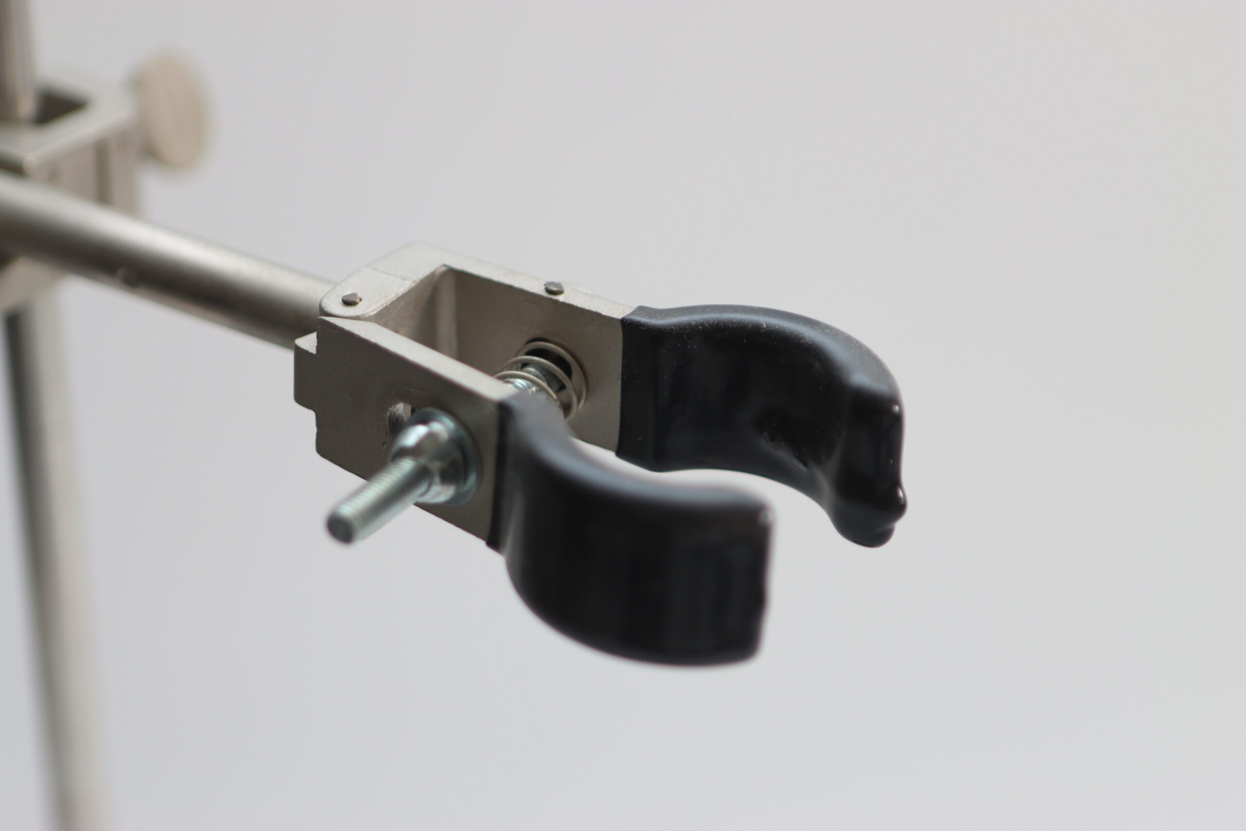 金属製の支柱と横バー、クランプ機構を備えたラボ用スタンド。
