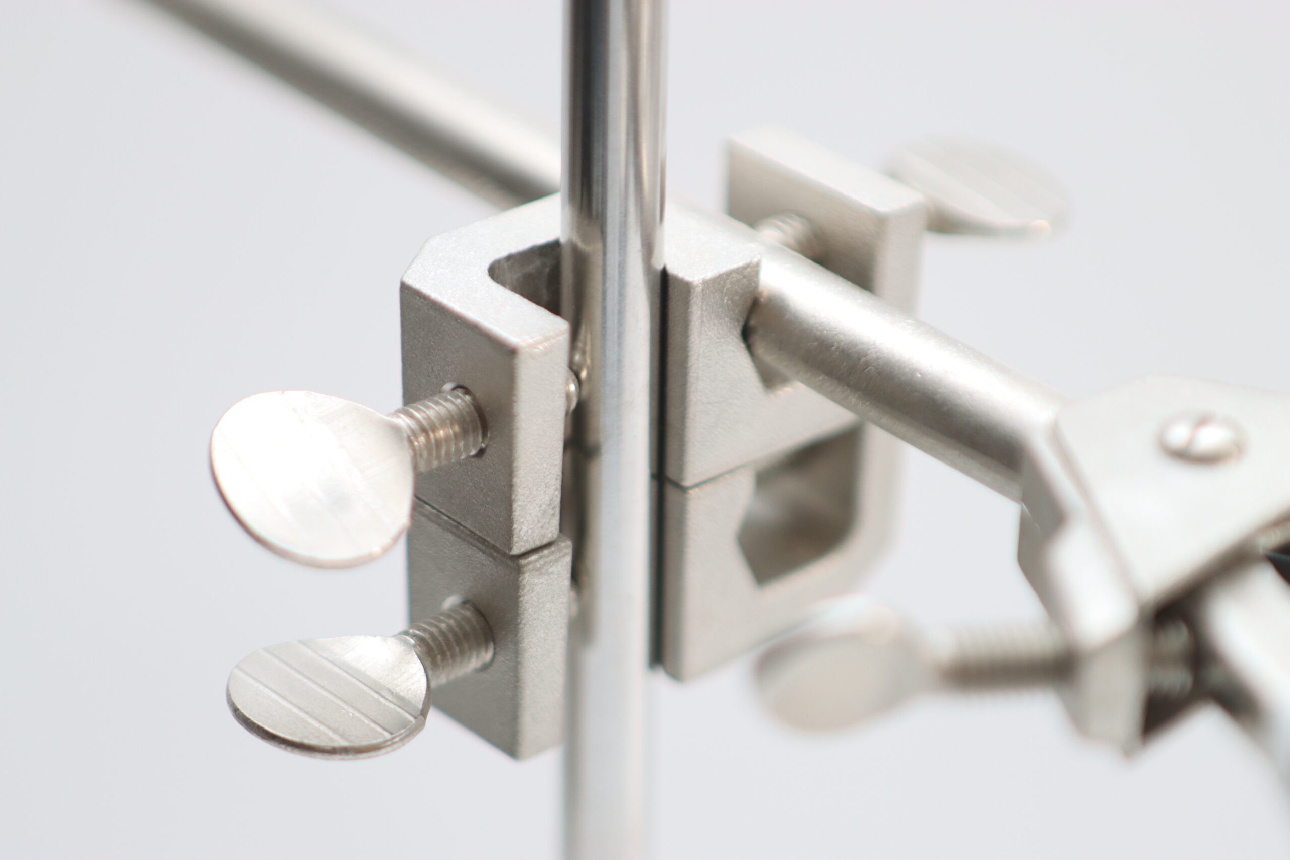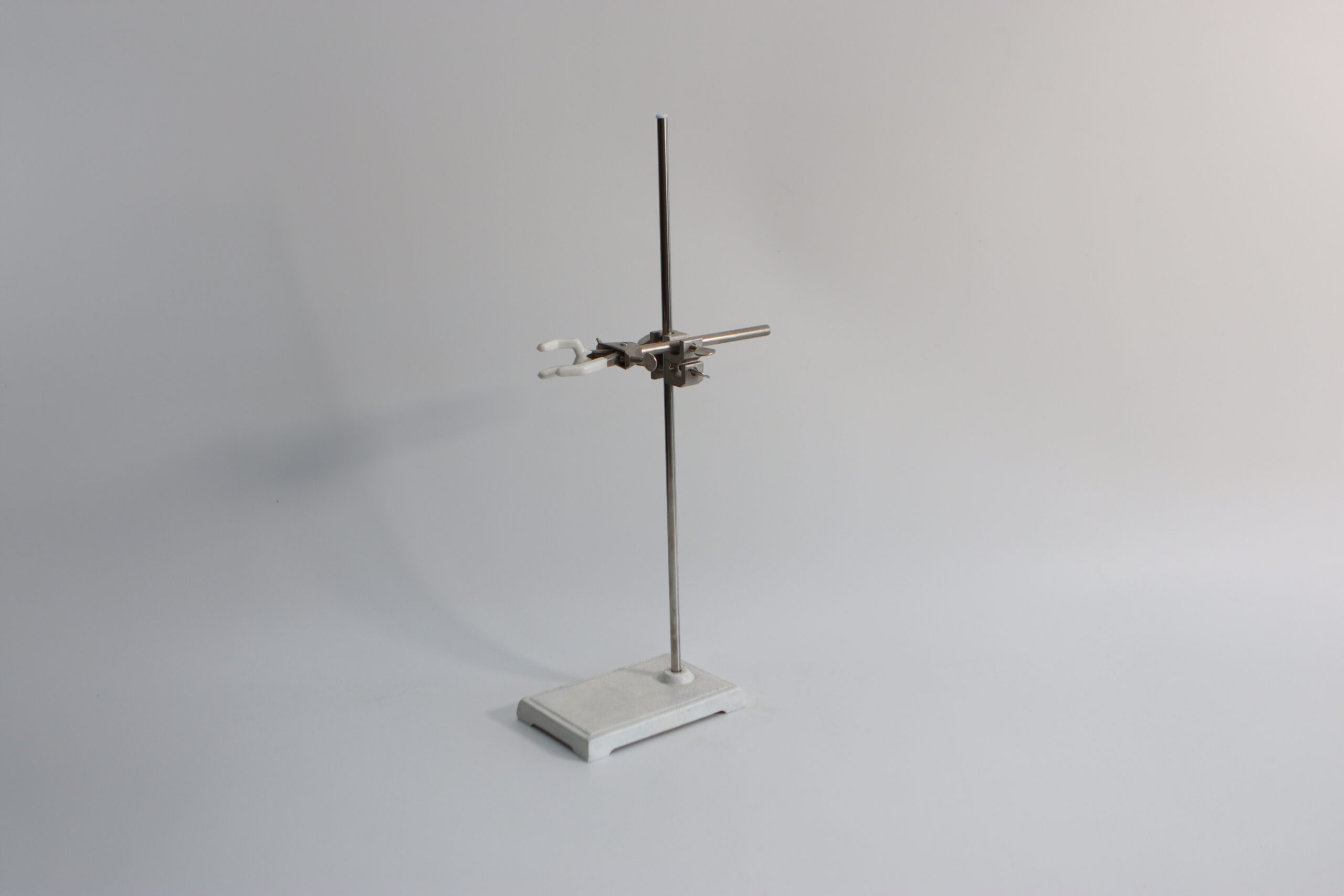 金属製の支柱と横バー、クランプ機構を備えたラボ用スタンド。