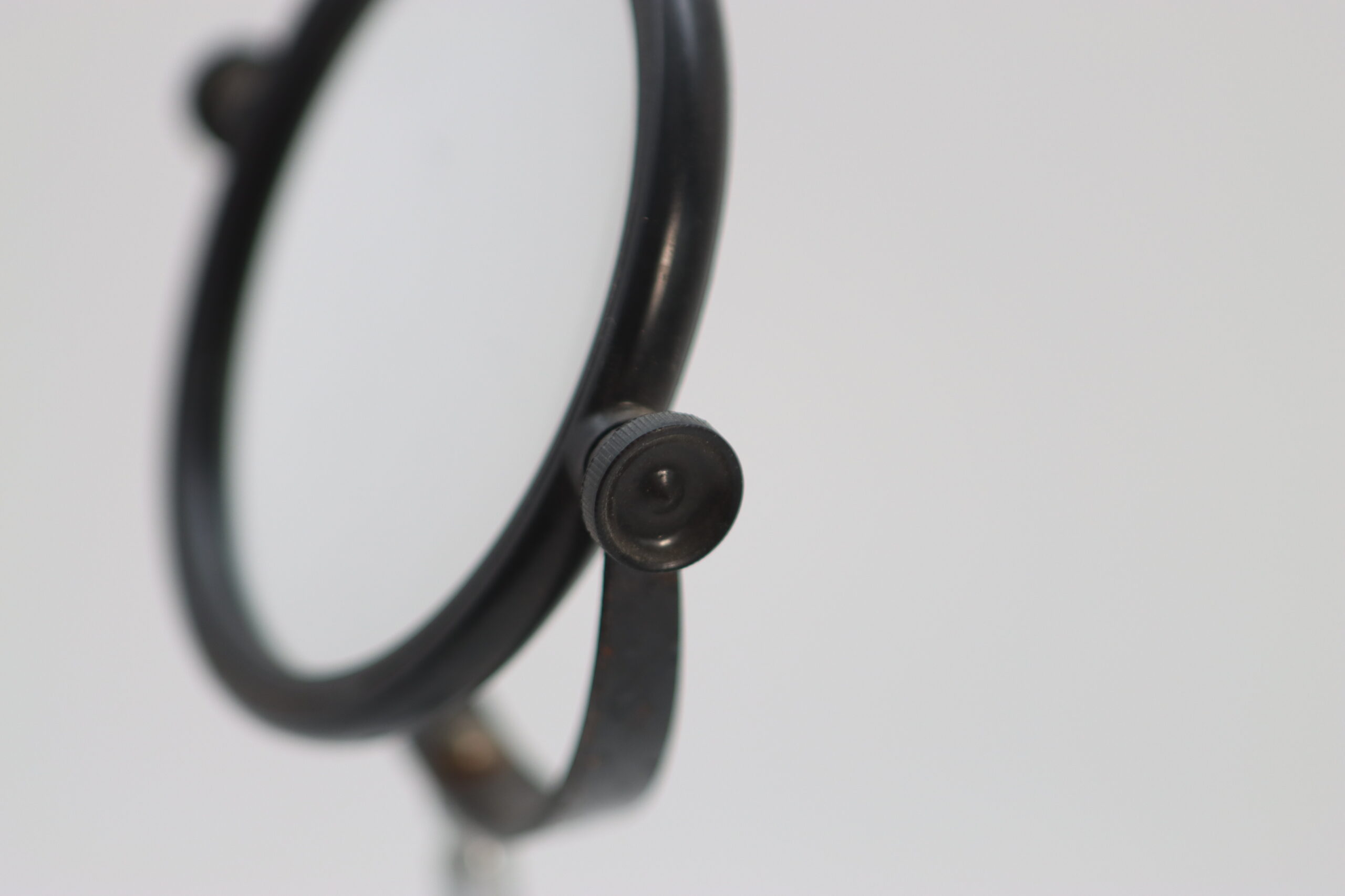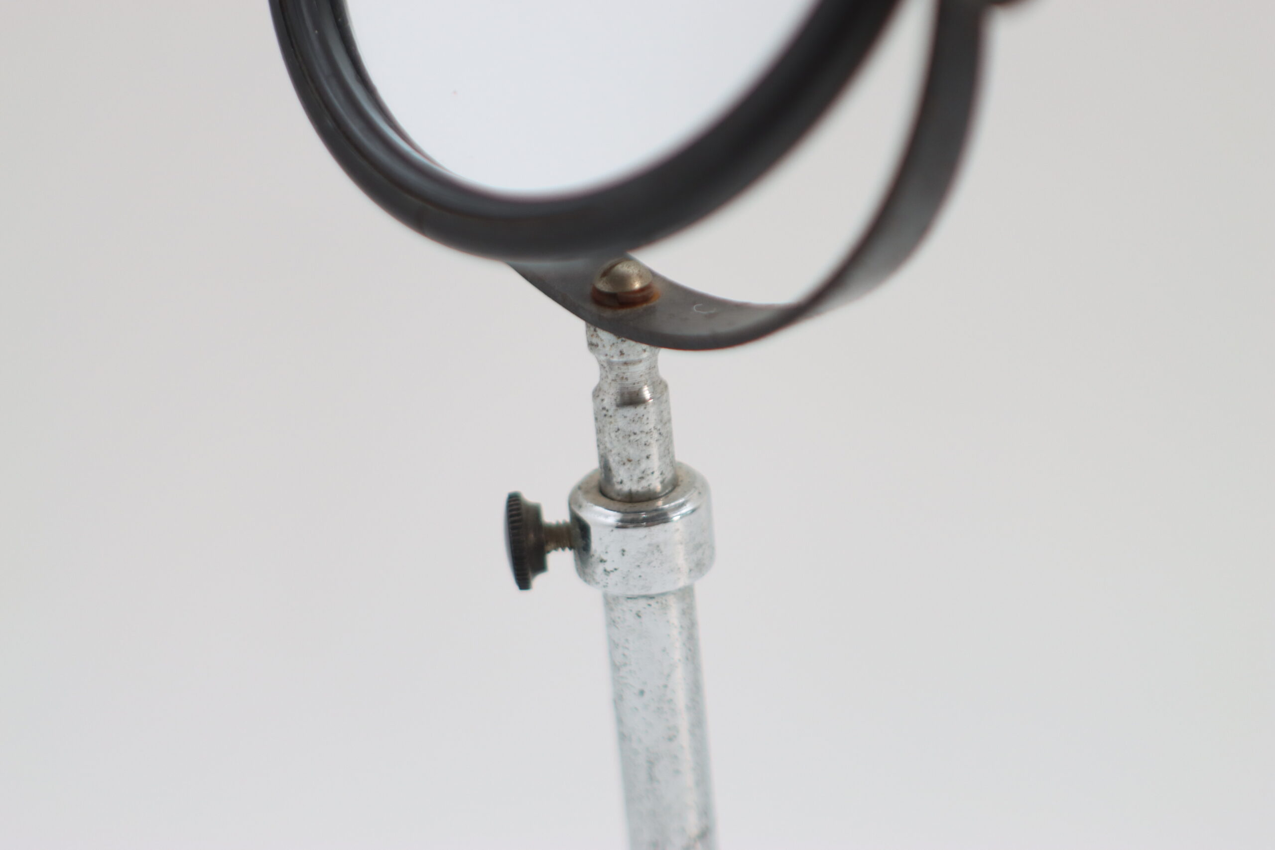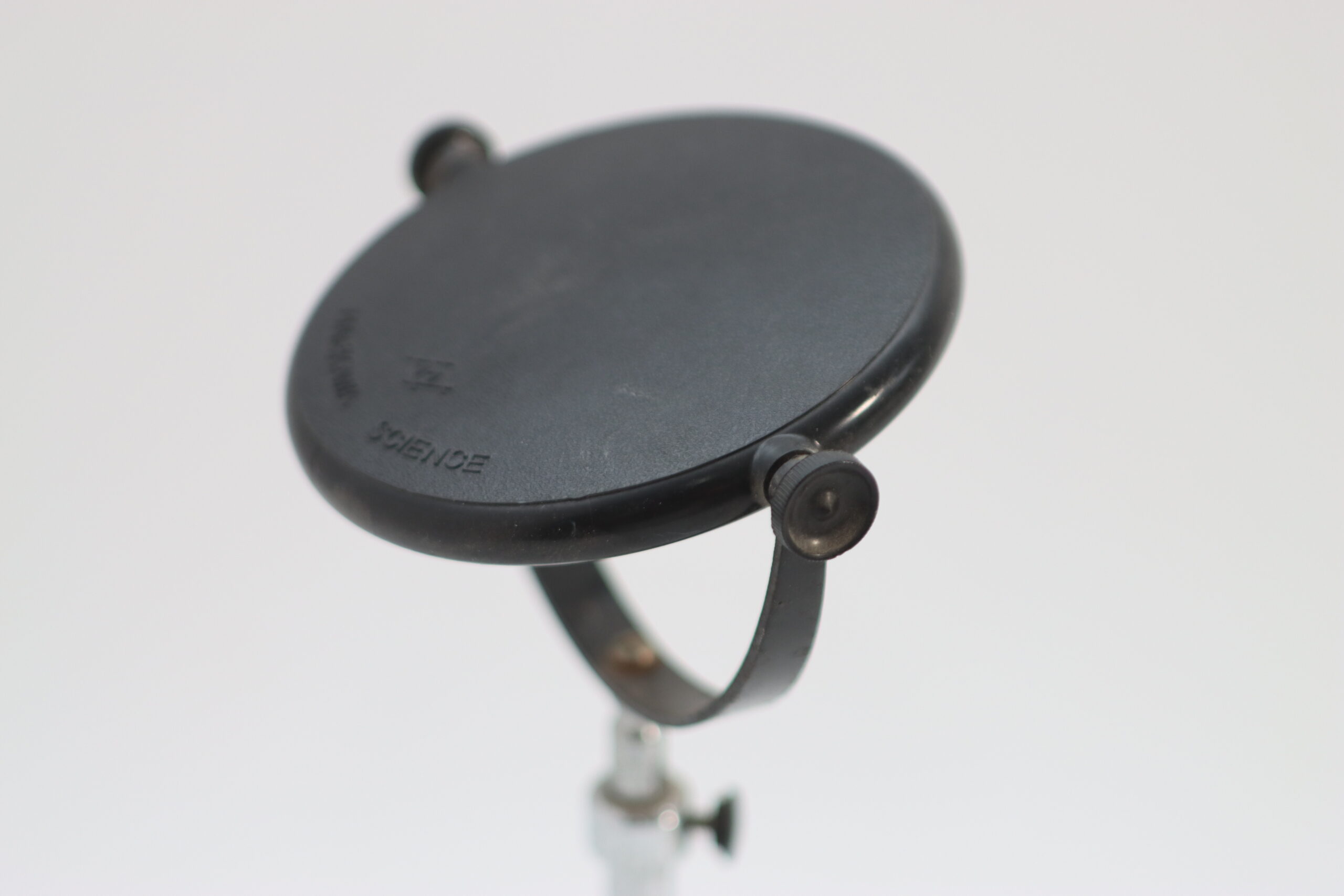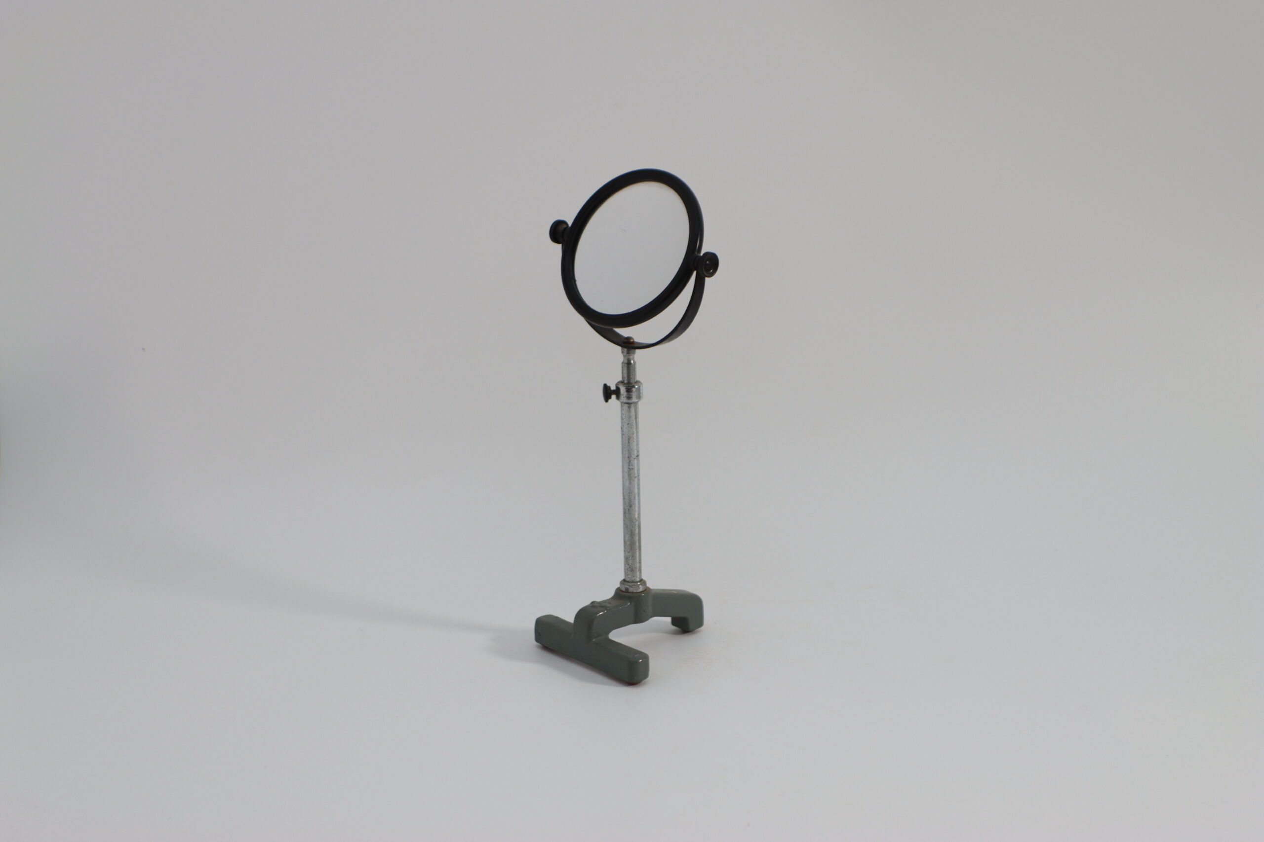 円形ミラーを金属スタンドで支えた、ラボ用観察器具を想起させる一点。