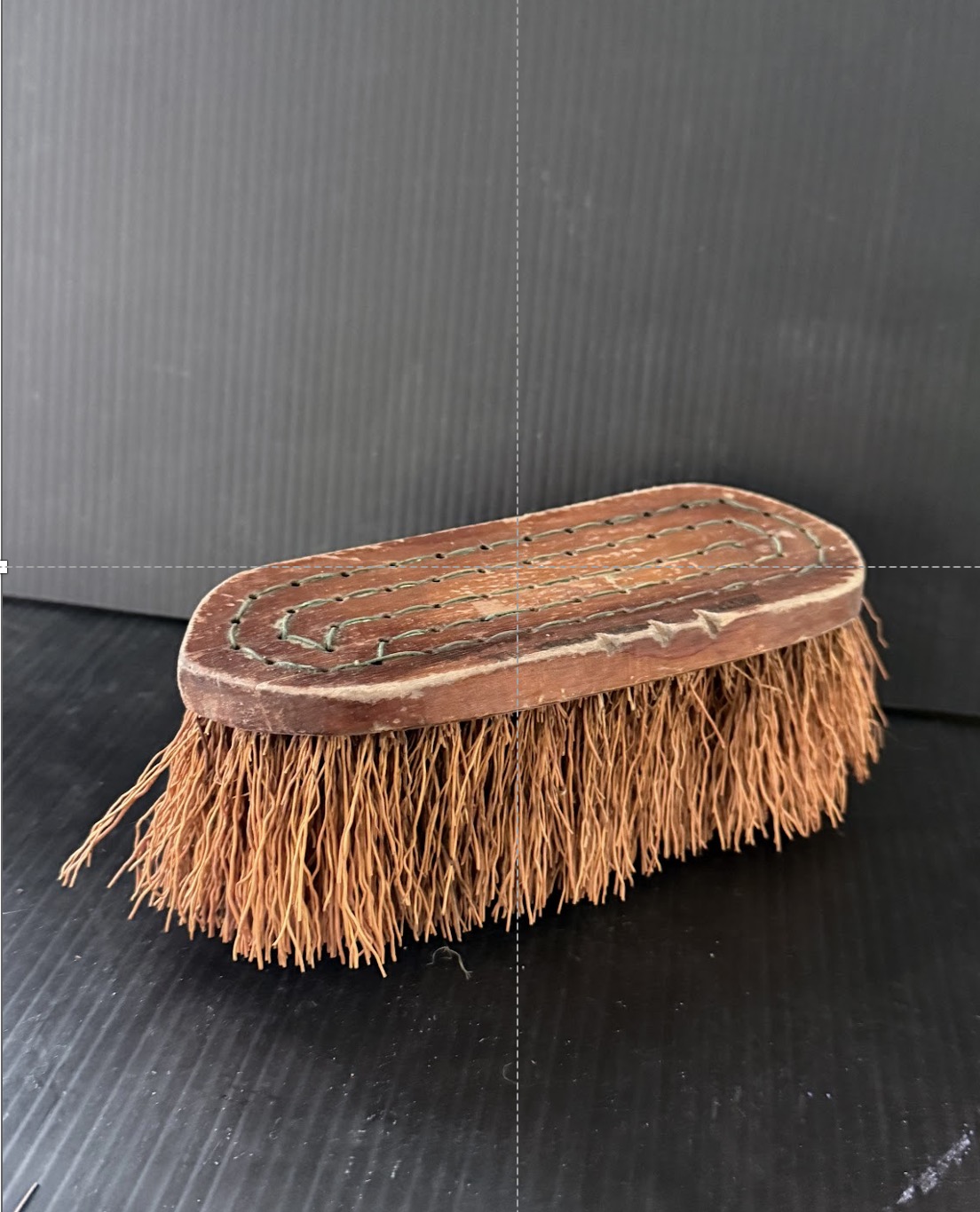 密に植えられた硬質なブラシ毛と、長年の使用を感じさせる木製ベースが特徴的なハンドブラシです。