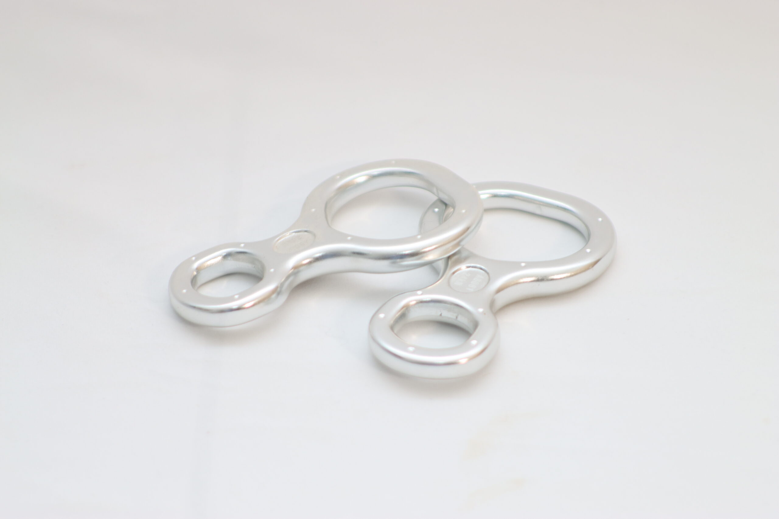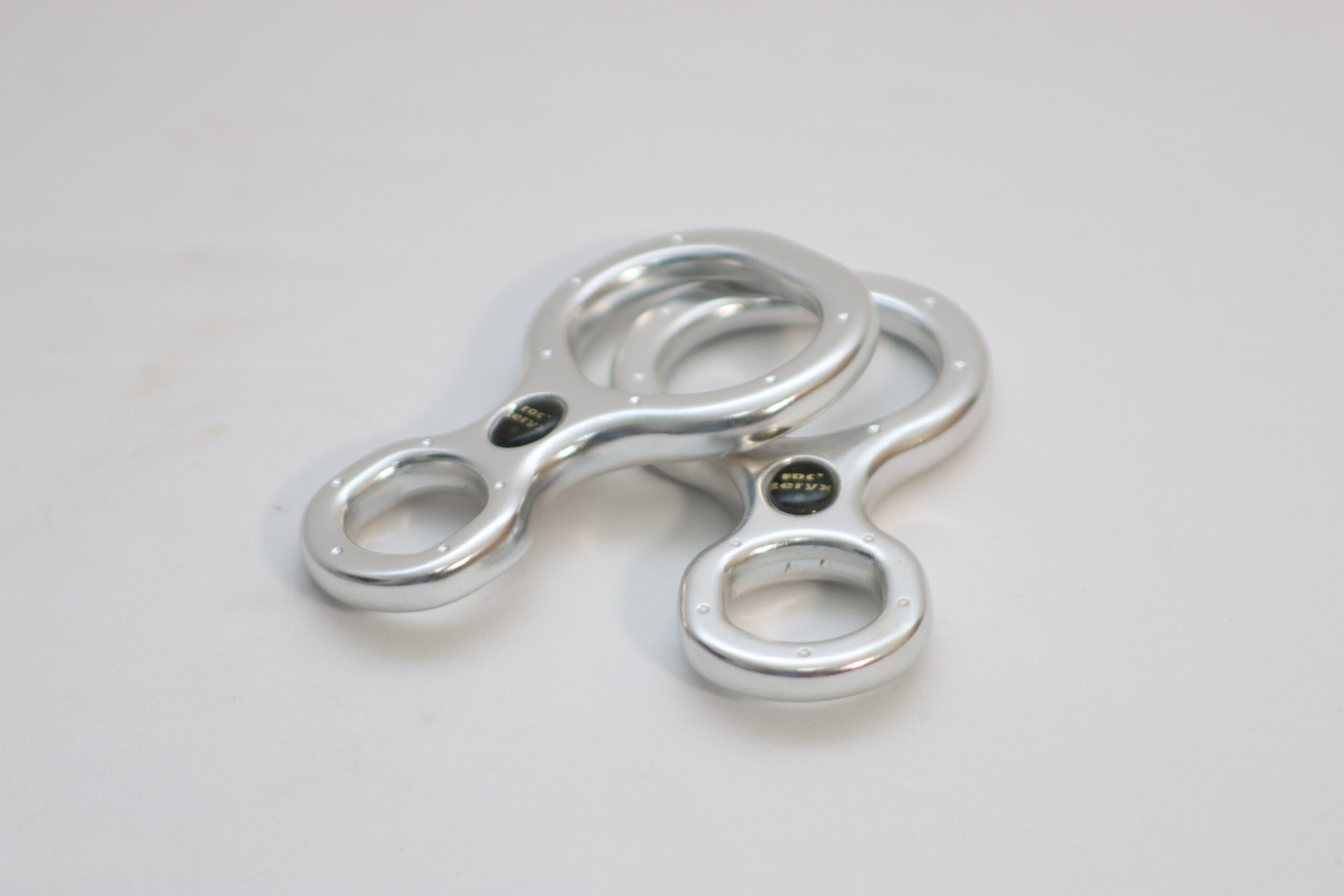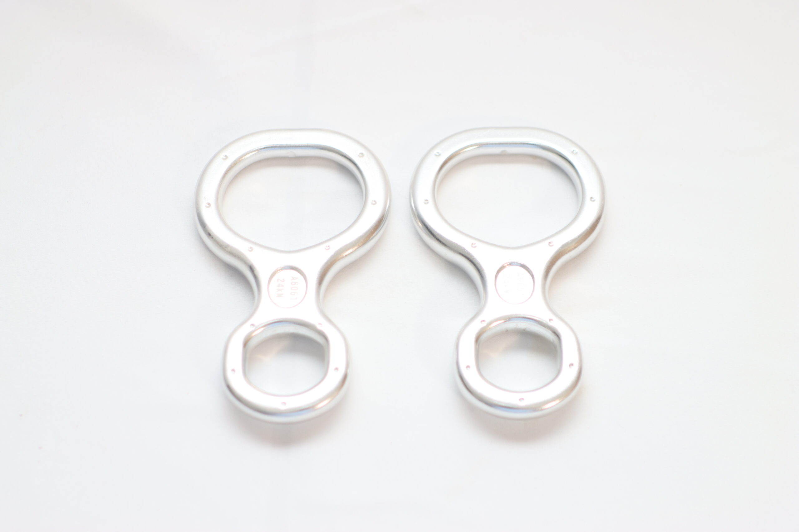 レスキューやクライミング分野で使用される「エイト環(図8下降器)」を、