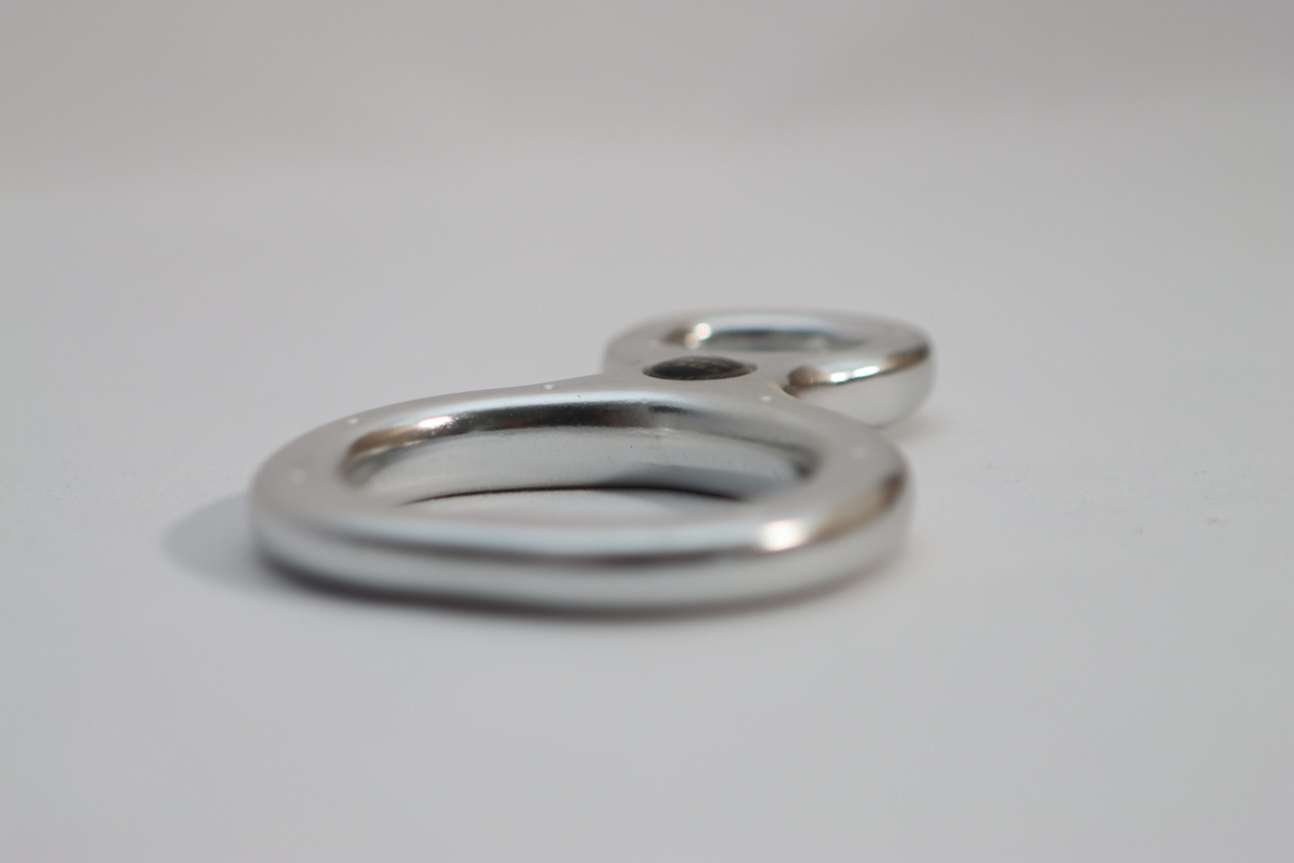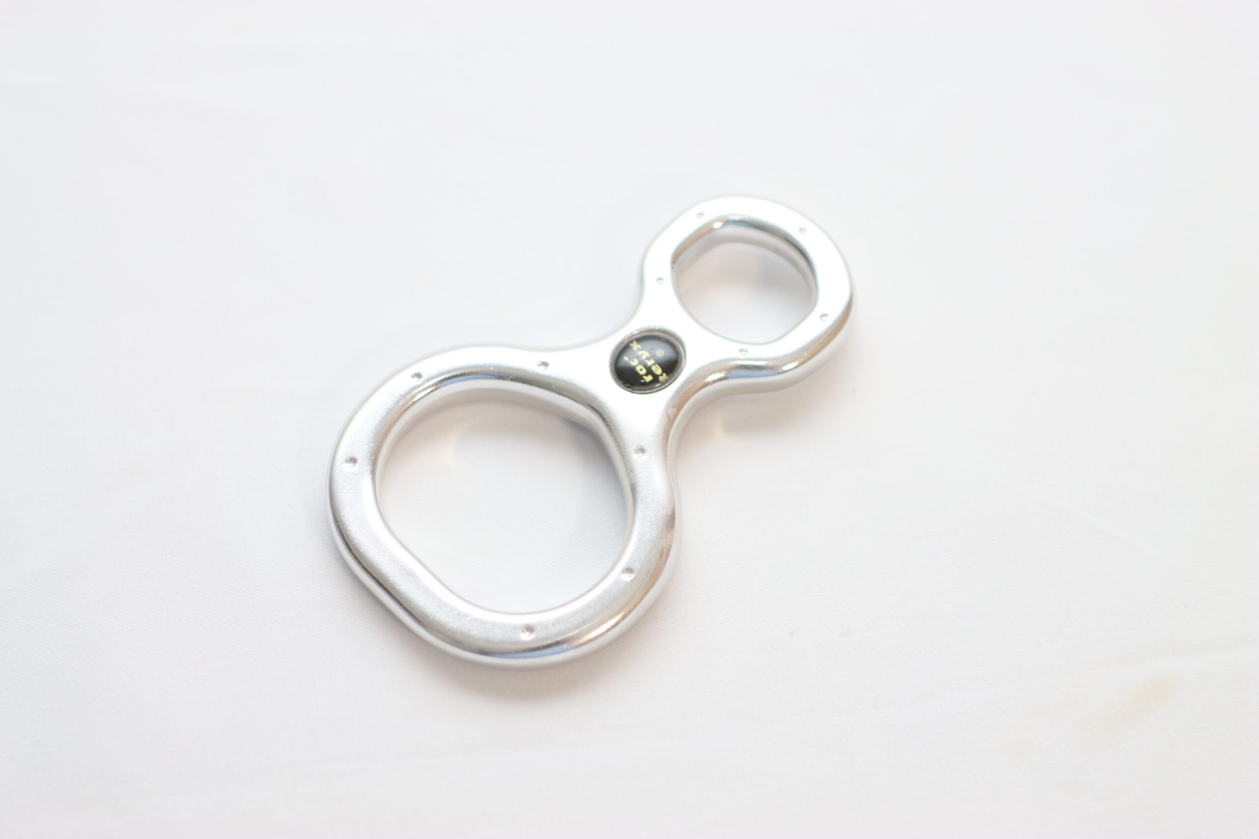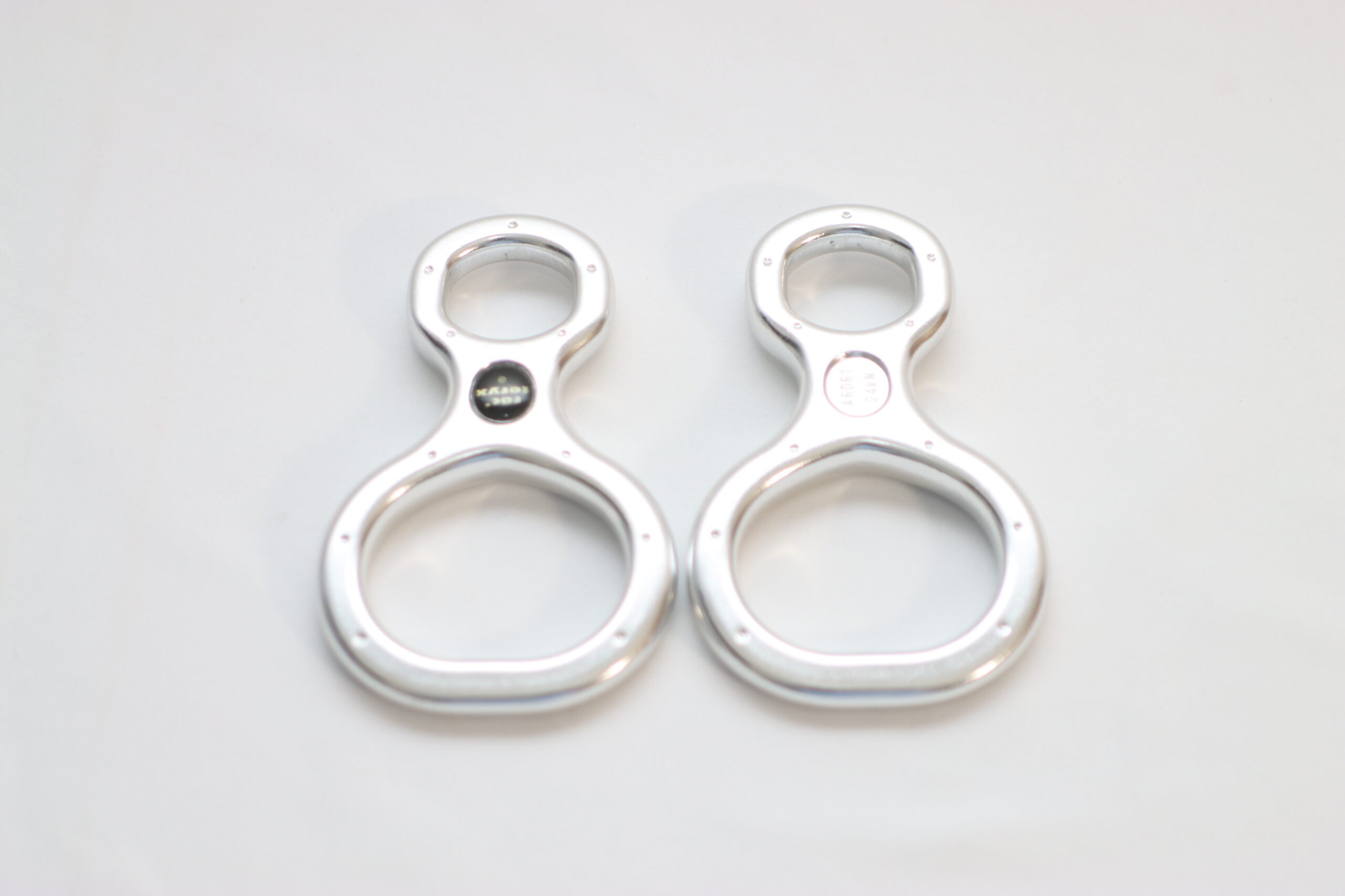 レスキューやクライミング分野で使用される「エイト環(図8下降器)」を、