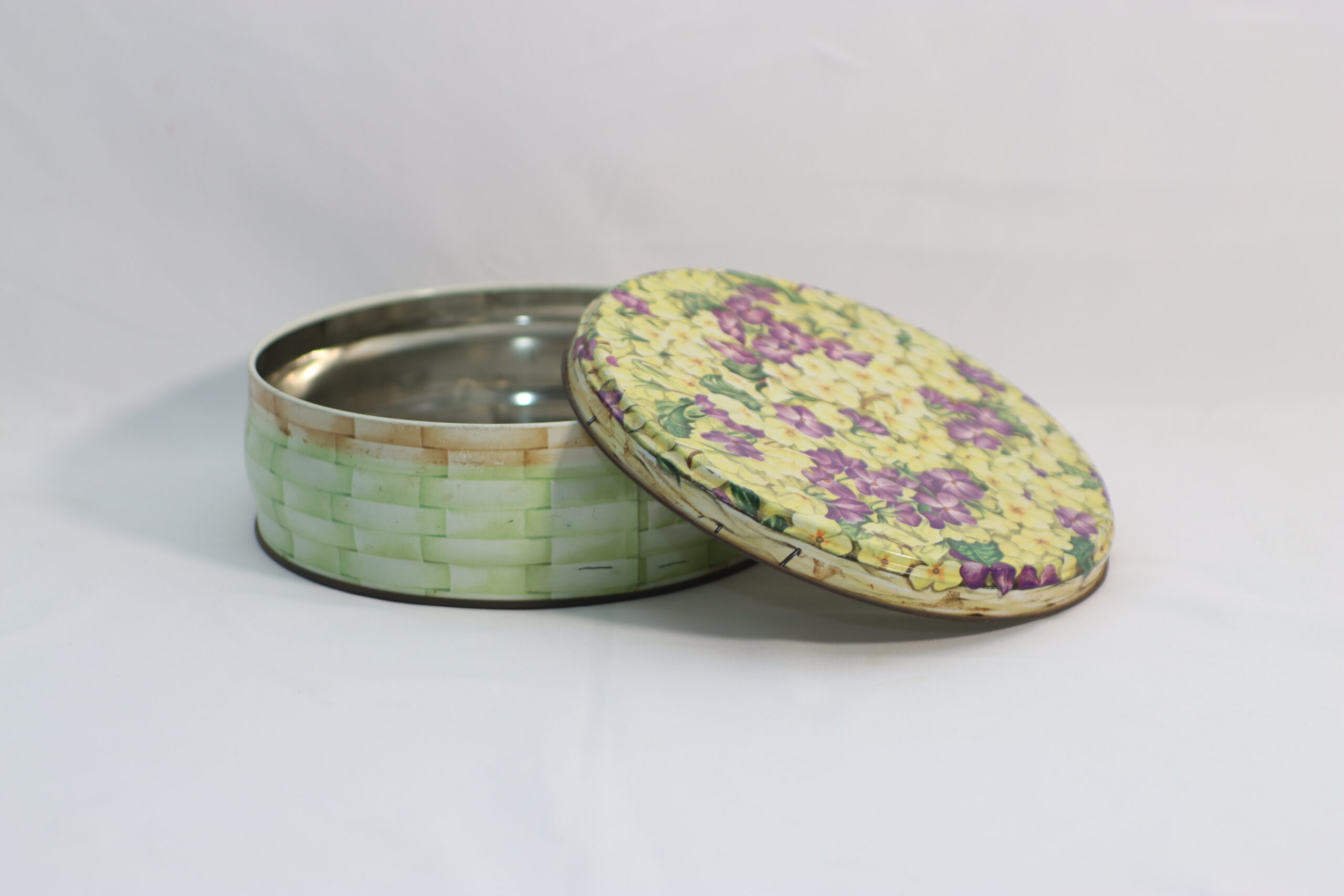 「英国王室御用達としても知られるHuntley & Palmers社の、希少なヴィンテージ・ビスケット缶です。 特筆すべきは、全面に描かれた繊細なボタニカルアート。バスケットを模した側面のパターンと、蓋いっぱいに広がる色鮮やかな花々のコントラストが、見る者の目を楽しませます。