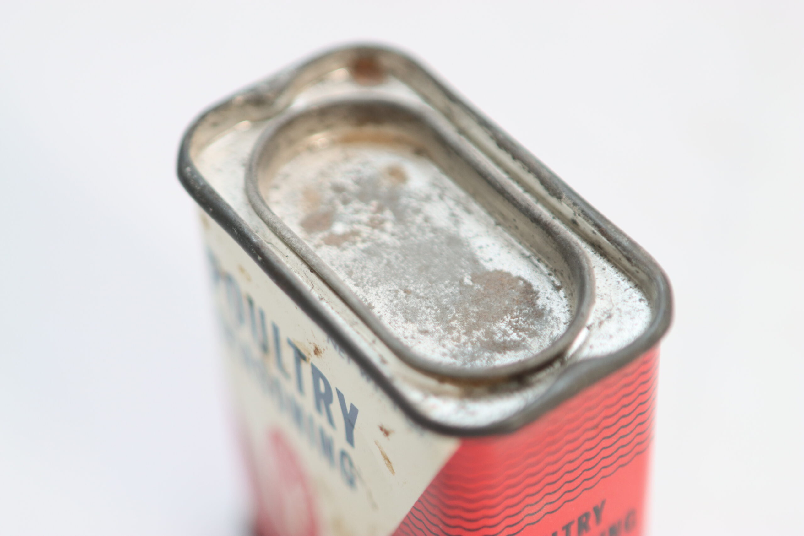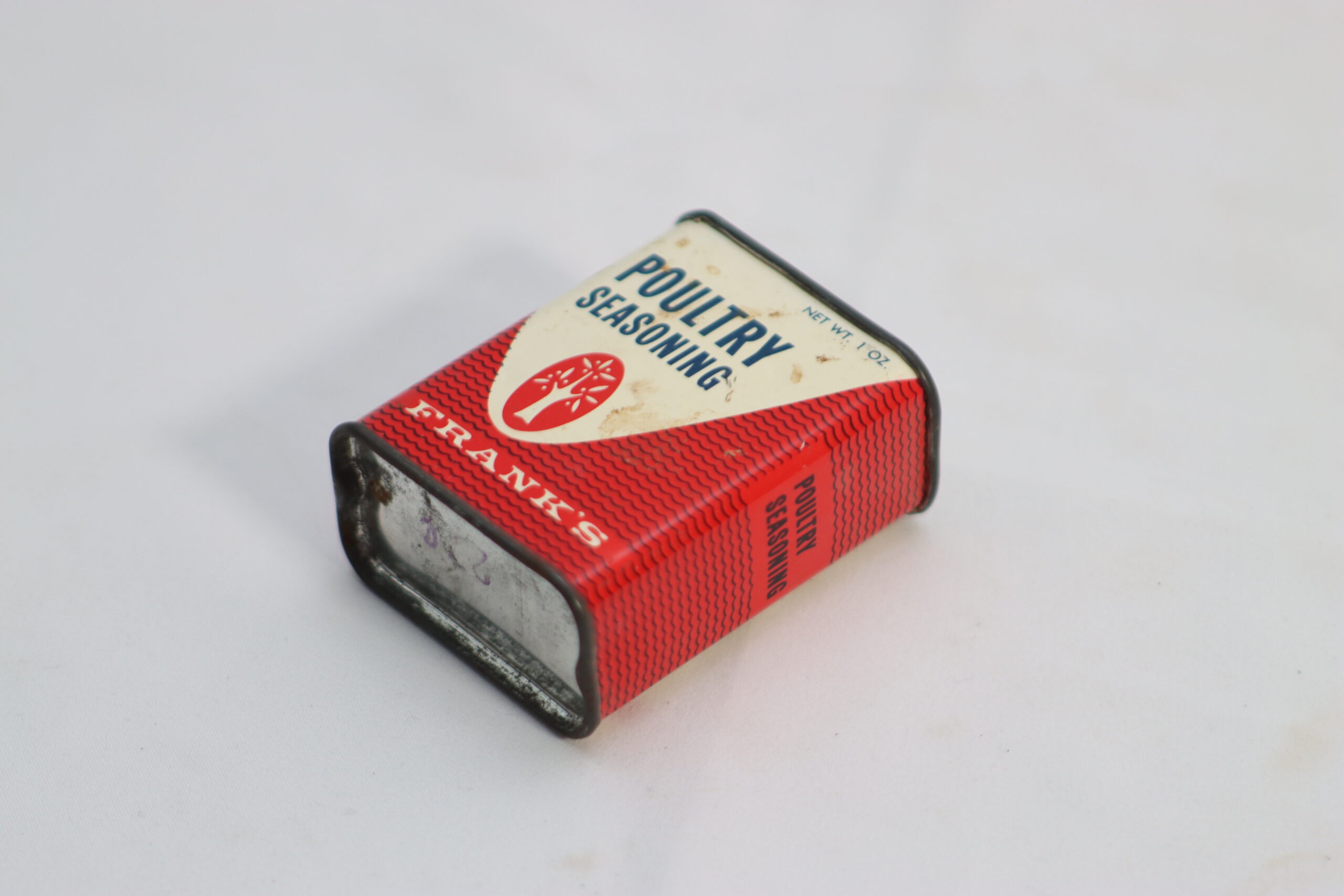 「赤と白のコントラストにレトロなロゴが映えるシーズニング缶です。コンパクトなサイズ感は、メインの製品を引き立てつつ、背景にほどよい『生活のノイズ』を加えるのに最適です。」