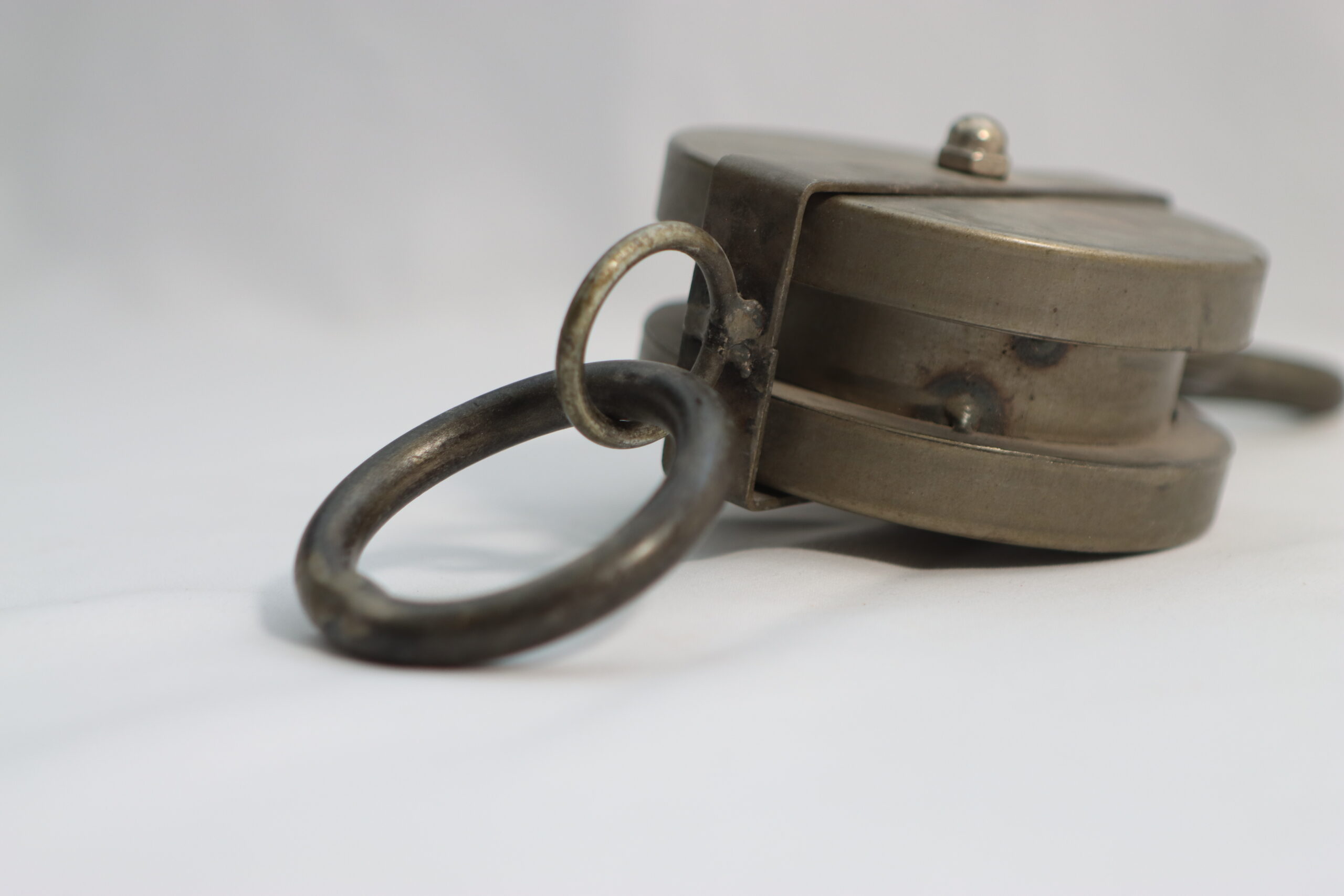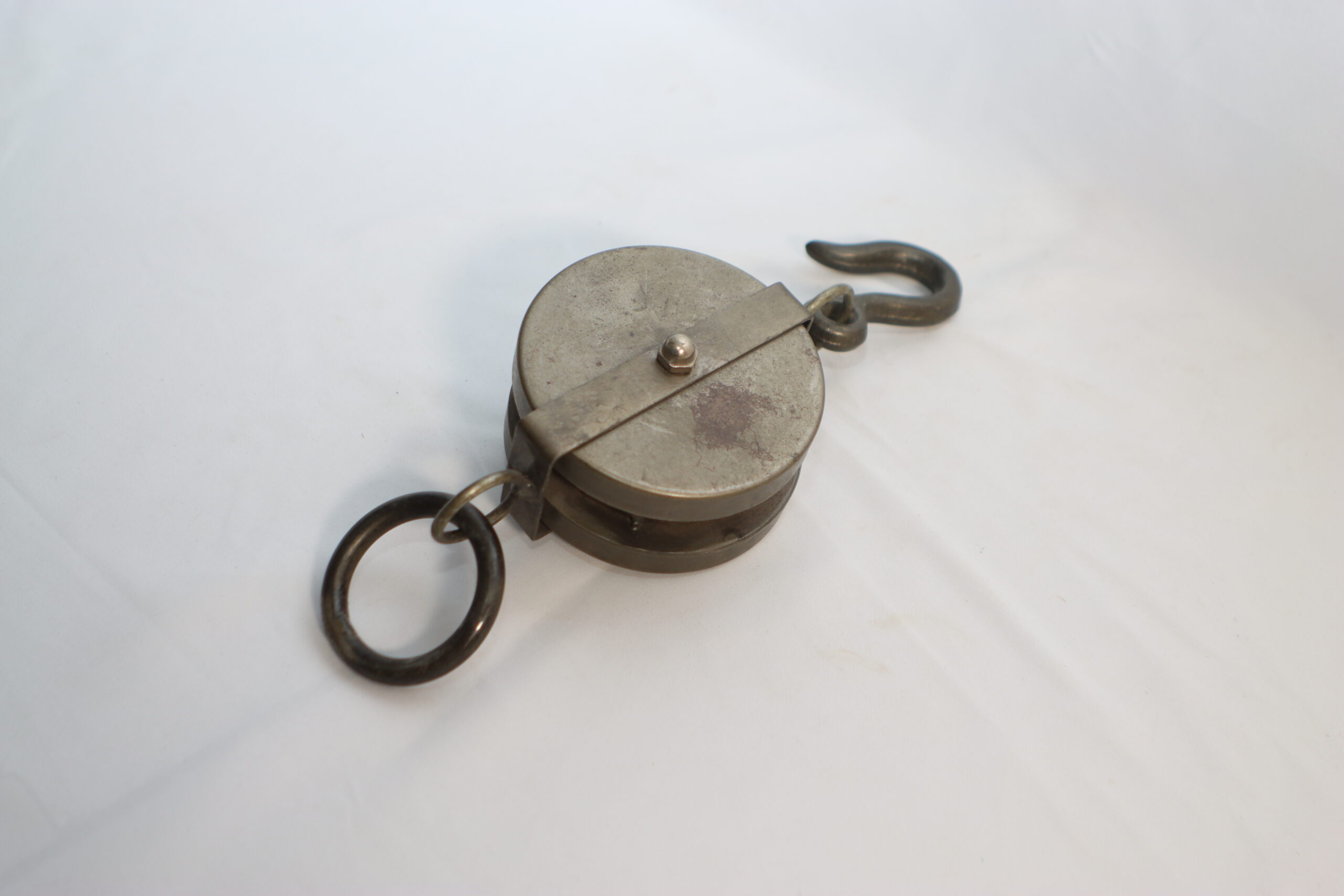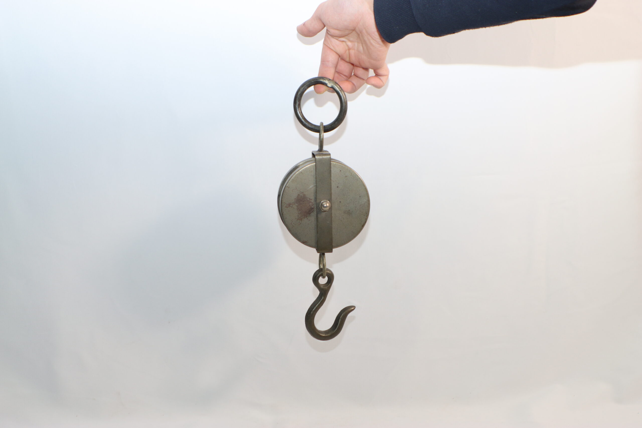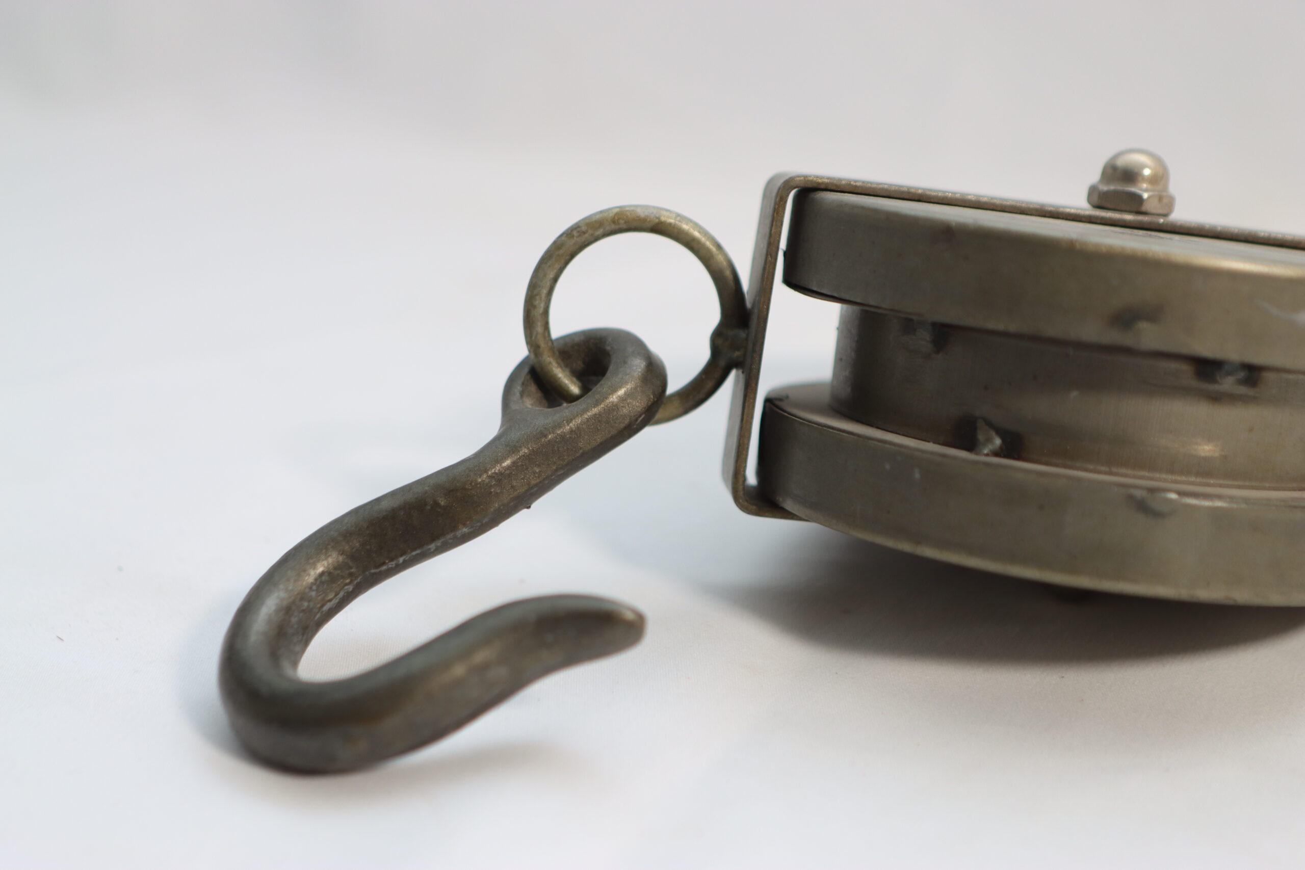 重厚な金属の質感と、実用的なフックを備えたインダストリアルな滑車です。