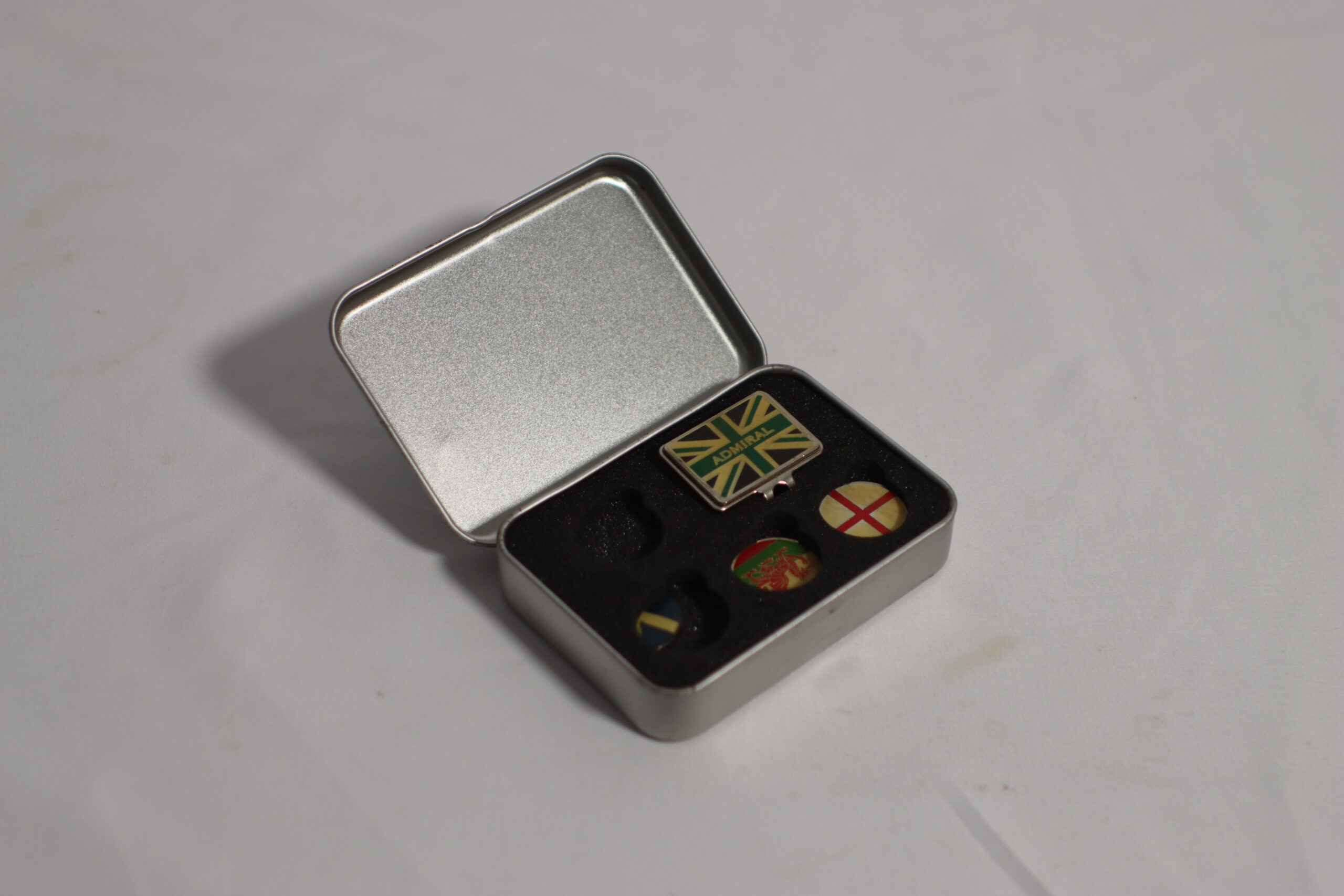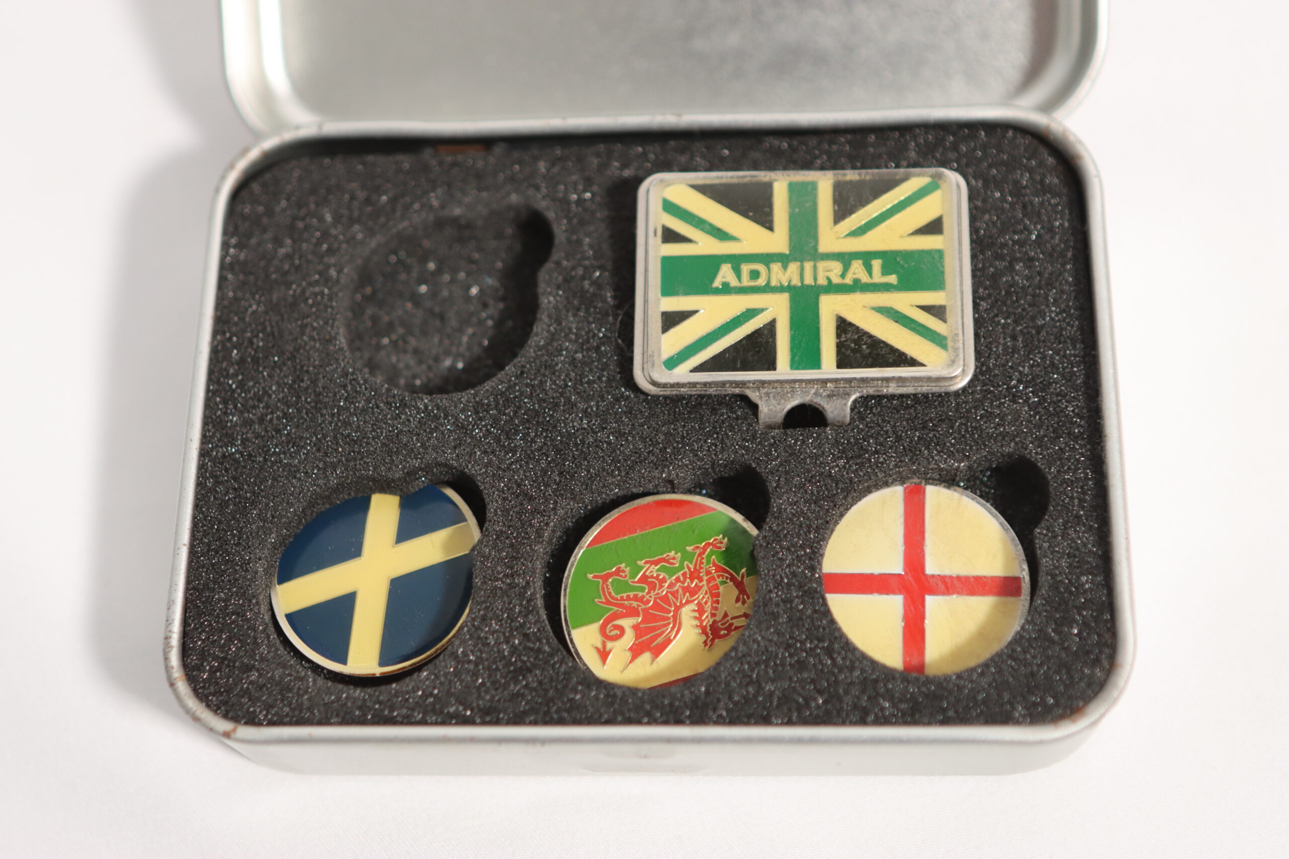 「英国の伝統と現代のスポーツ・エレガンスが融合した、Admiralを象徴するデザインのゴルフマーカーセットです。 ブリキ缶に収められたこのセットは、単なる実用品を超えた**『ヴィンテージ・ガジェット』としての佇まい**を持っています。ユニオンジャックやウェールズのレッドドラゴンを彷彿とさせる紋章デザインは、スポーツシーンだけでなく、大人の遊び心を感じさせる書斎のディスプレイや、トラッドなライフスタイルの演出にも最適です。