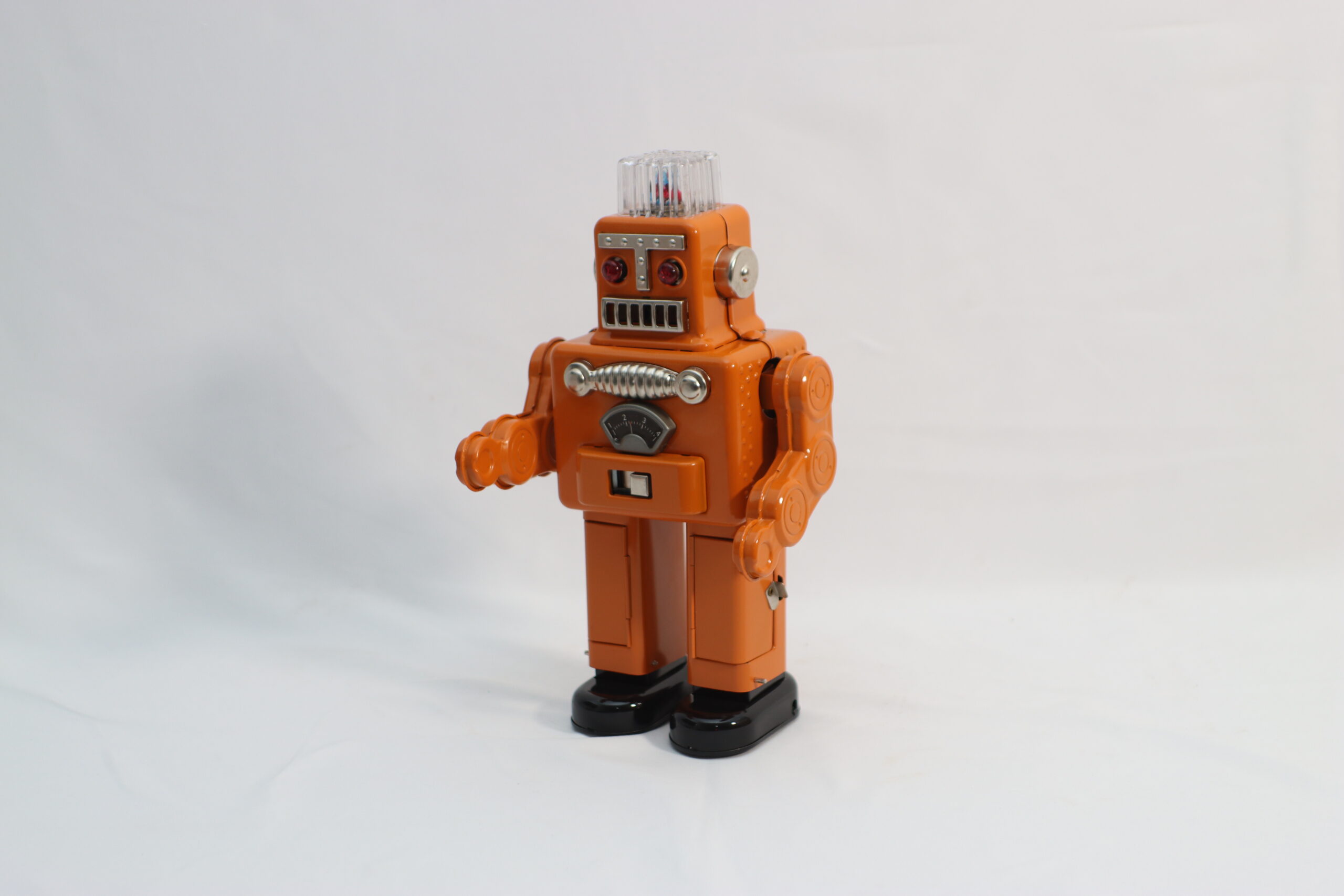 「50〜60年代のSF黄金期を彷彿とさせる、レトロフューチャーなデザインが目を引くロボット玩具です。 この『スモーキング・スペースマン』は、単なるアンティークトイではなく、当時の人々が抱いた**『未知の宇宙への憧れ』を形にした象徴的なアイコン**です。鮮やかなオレンジのボディと、メカニカルな胸のメーター、そして何より『煙を吐く』というアナログながらも驚きのあるギミックは、静止画でも動画でも圧倒的な存在感を放ちます。