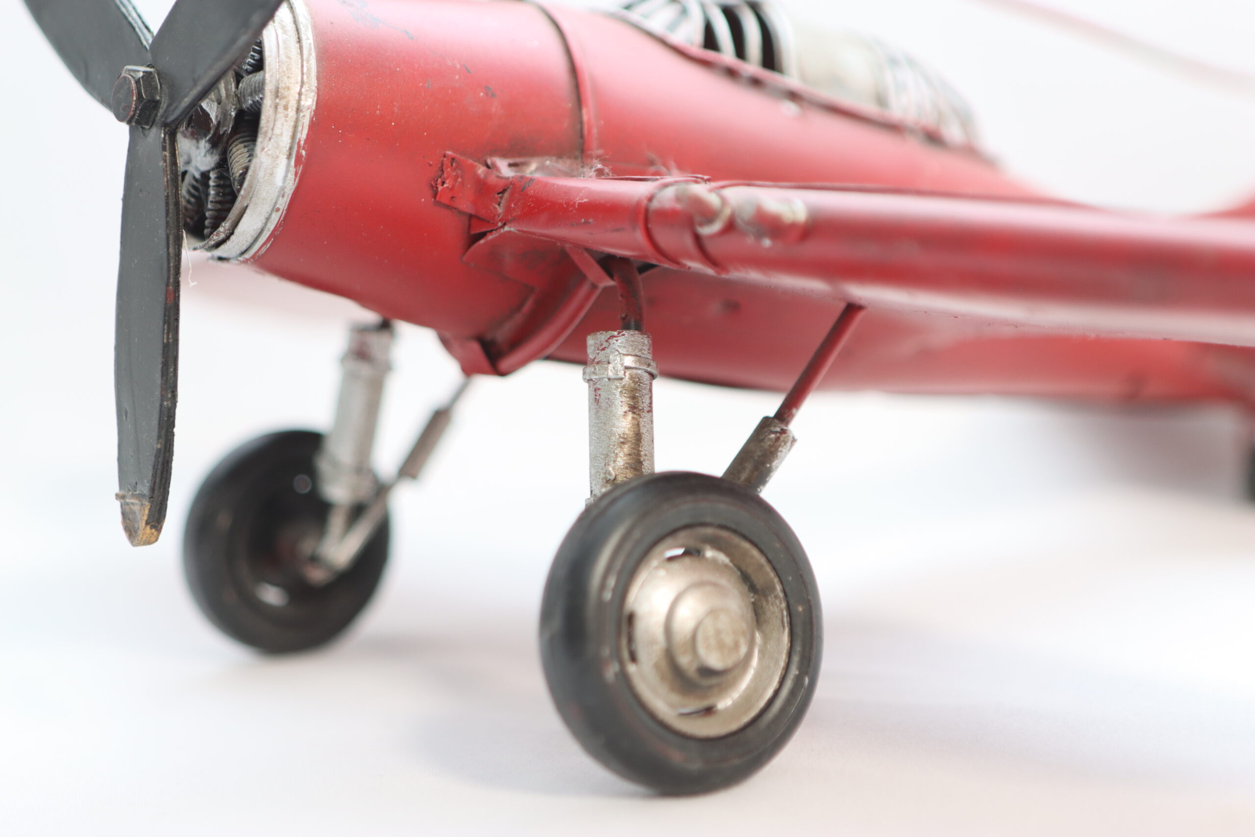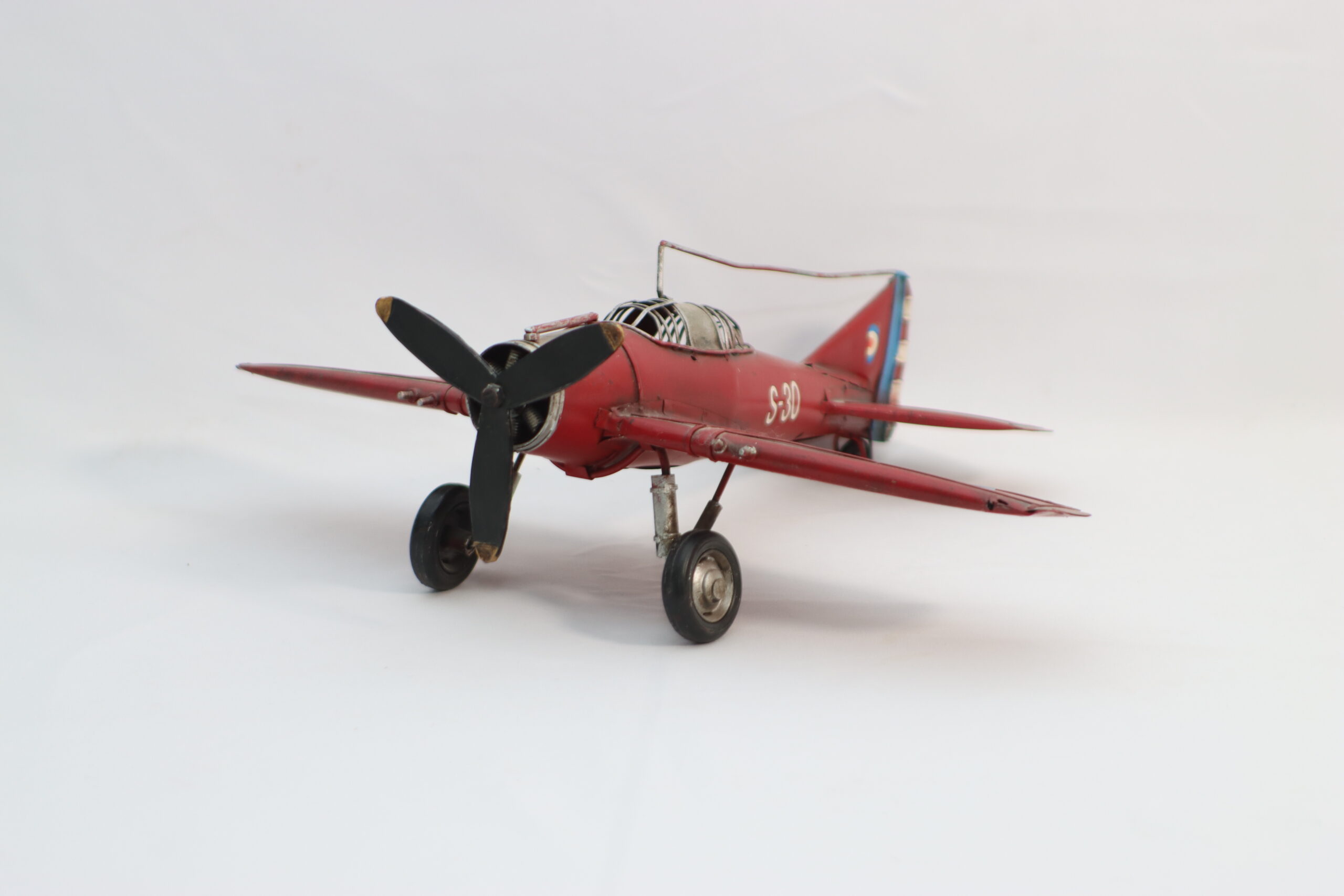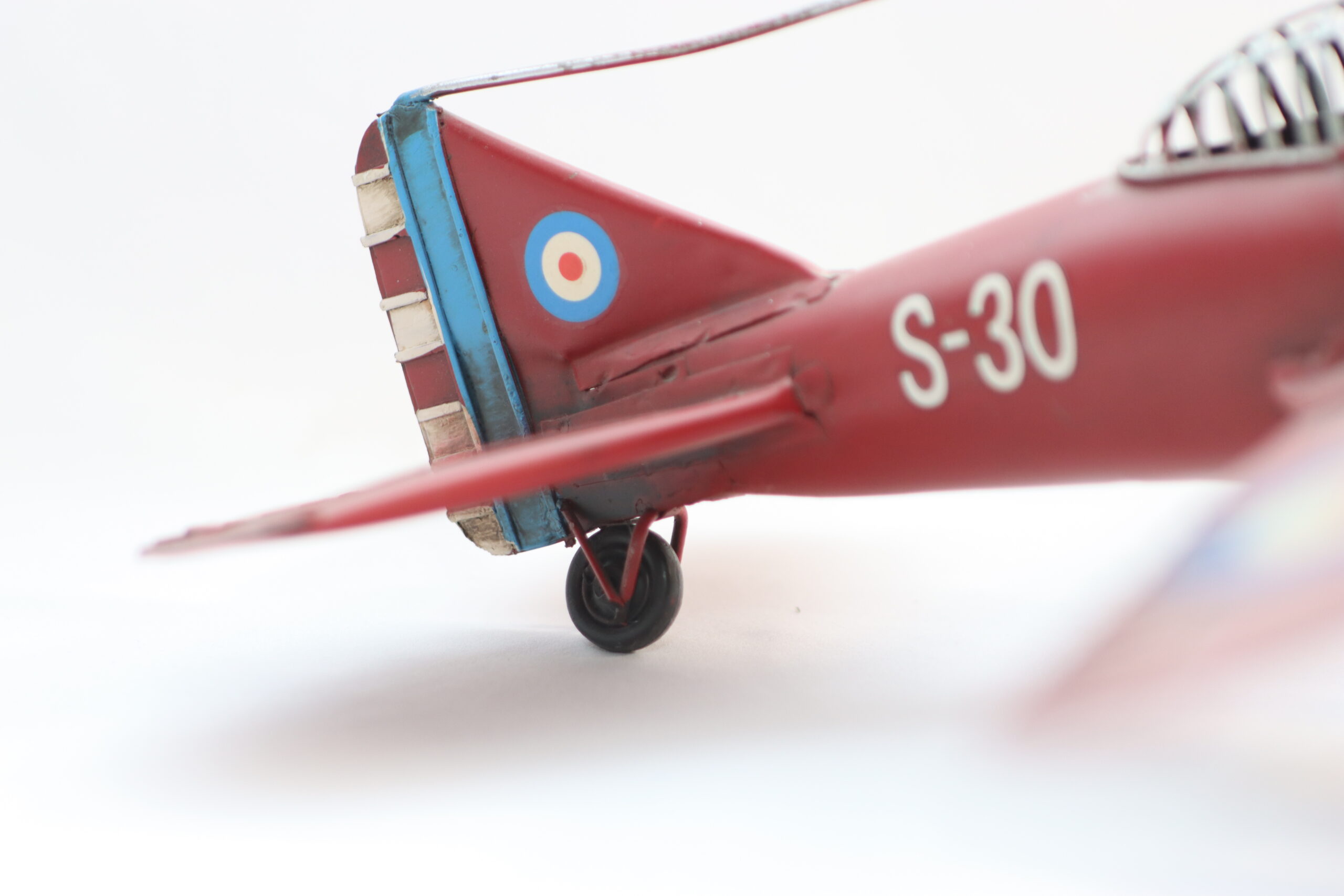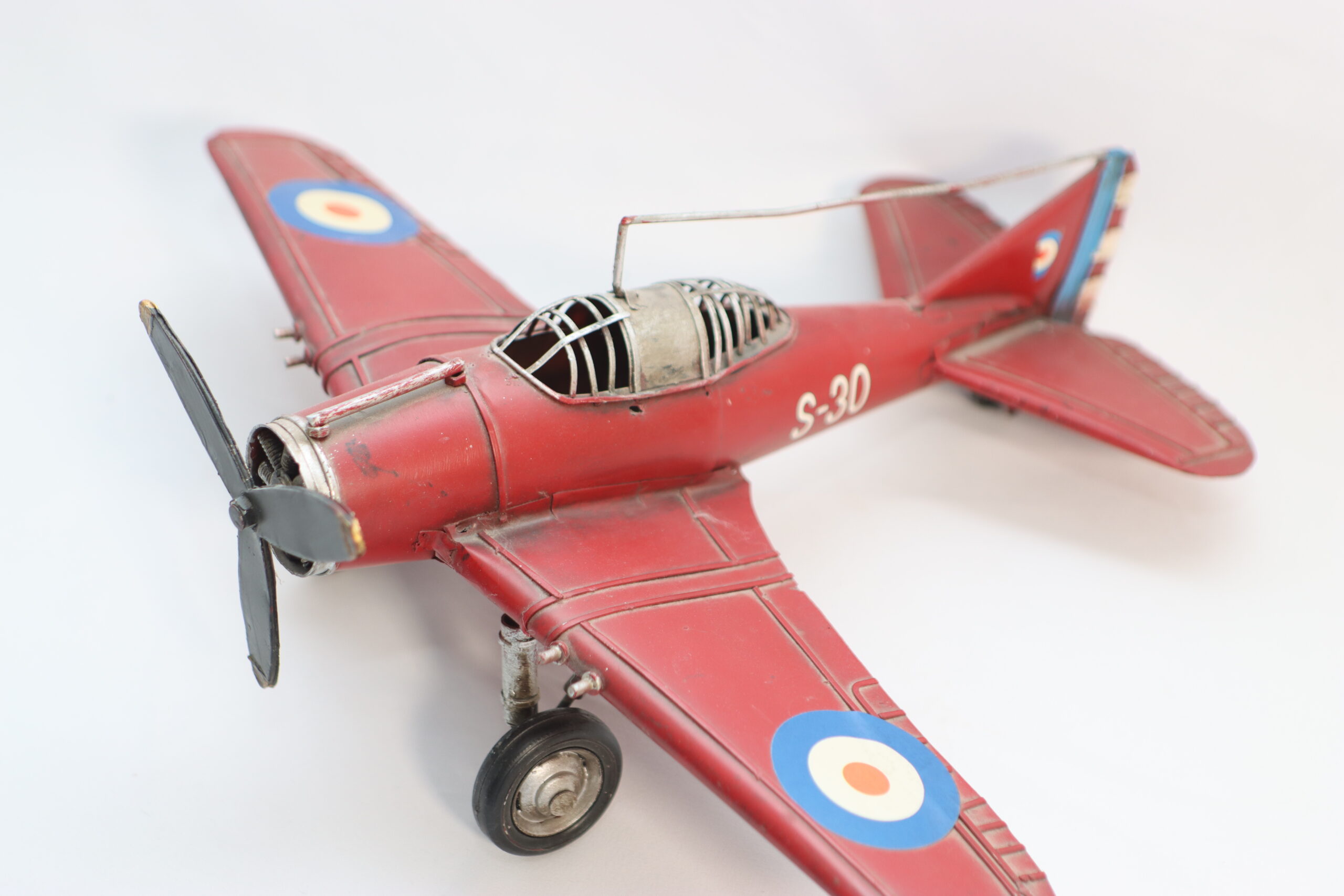 「時を刻んだ塗装の剥げや錆さえもデザインの一部となった、圧倒的な存在感を放つブリキの飛行機オブジェです。 この『S-30』モデルは、ノスタルジックな赤のボディに英国空軍を彷彿とさせるラウンデル(同心円のマーク)が映え、『冒険』や『歴史』を象徴するアイコンとして機能します。